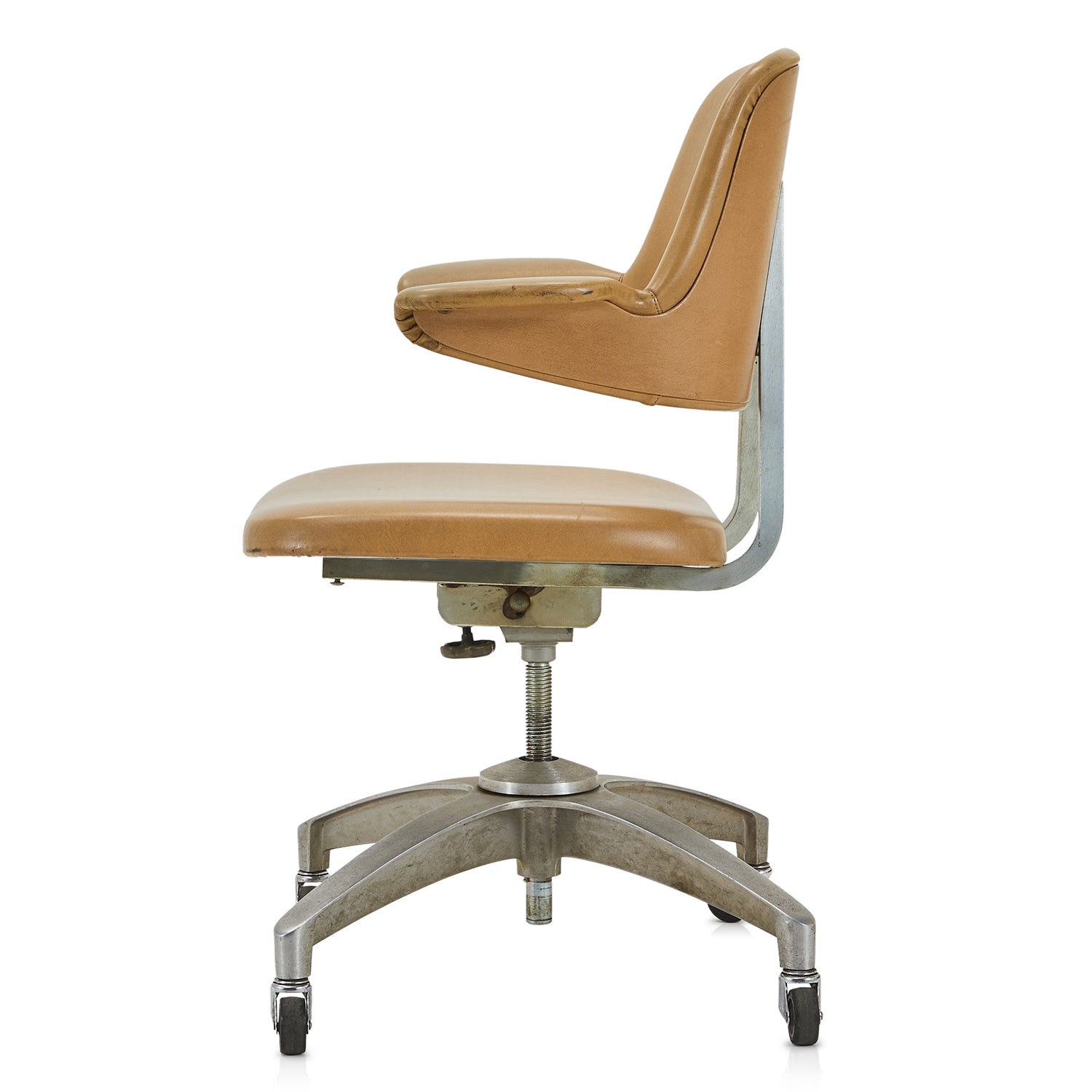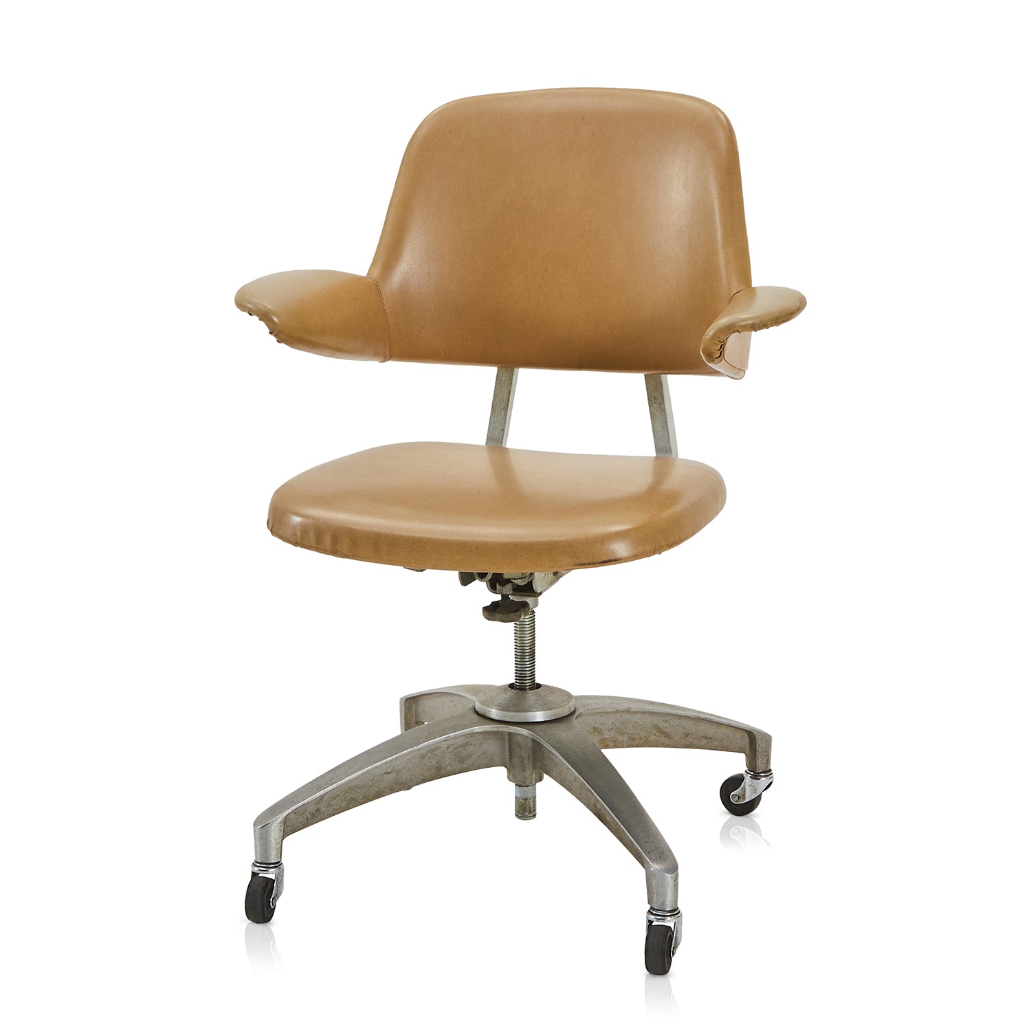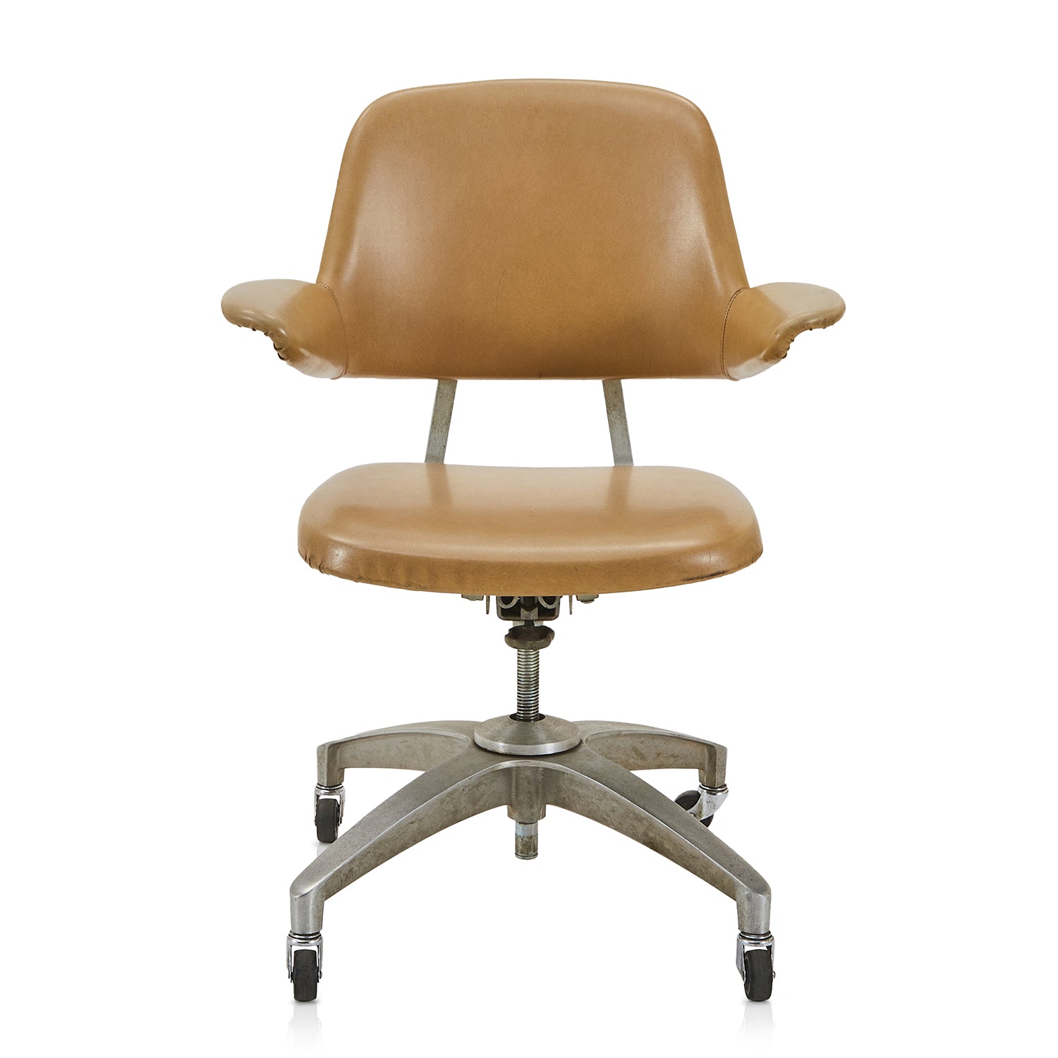Details: Tan vinyl rolling chair with metal base on wheels Dimensions: 32" H x 25" W x 19" D Quantity: 1