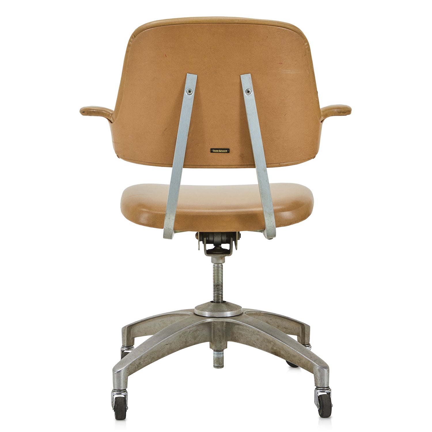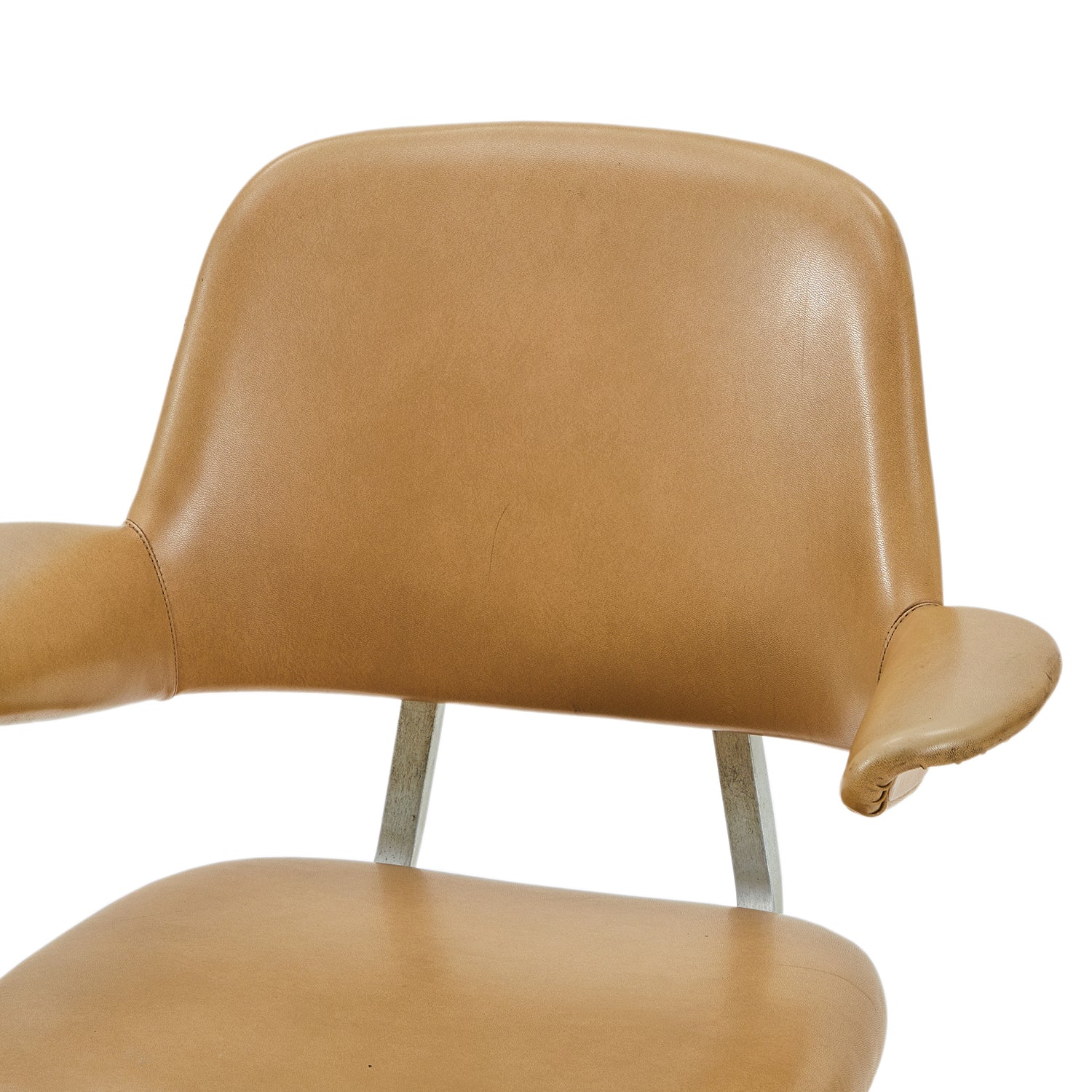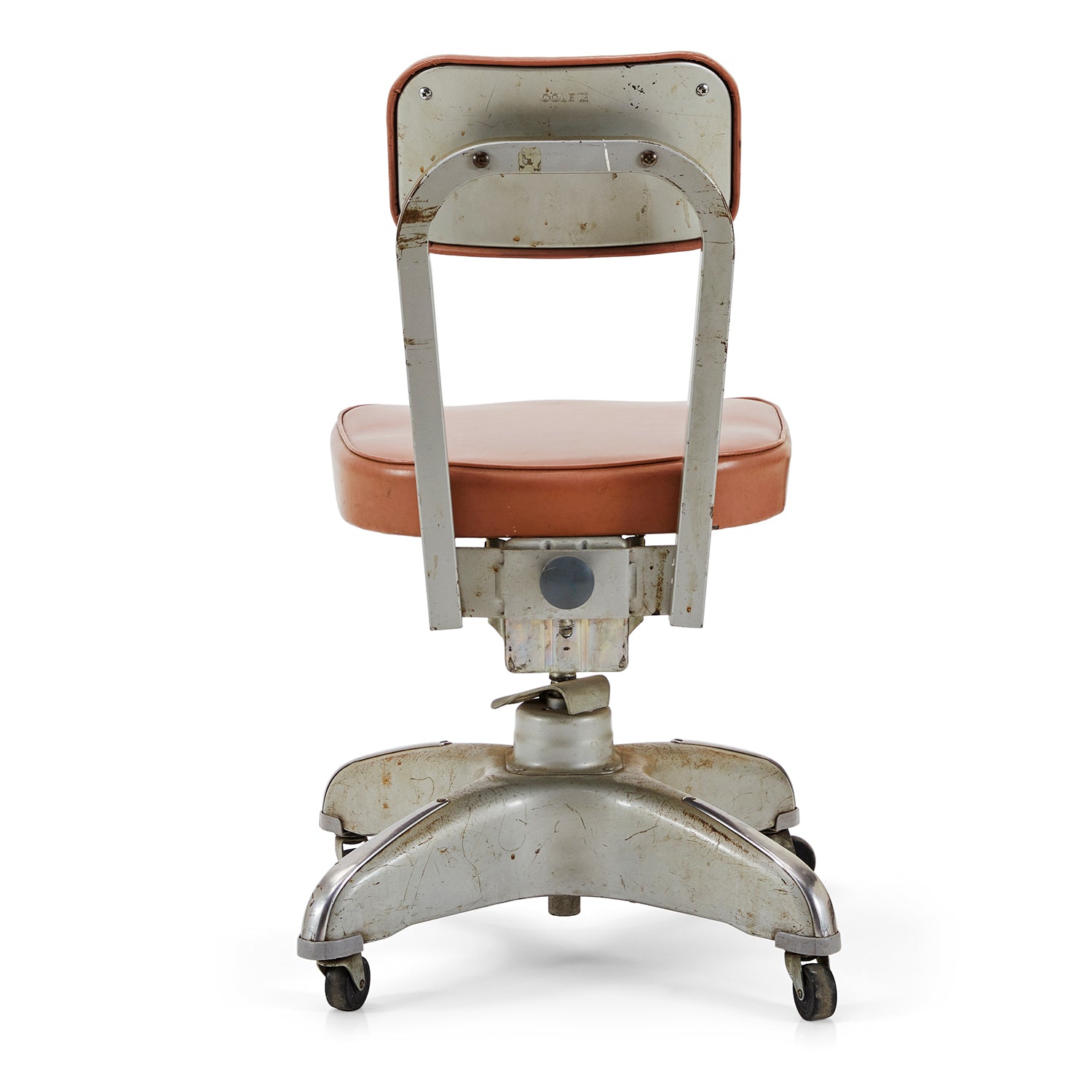 Details: Tan vinyl rolling chair with metal base on wheels Dimensions: 32" H x 25" W x 19" D Quantity: 1