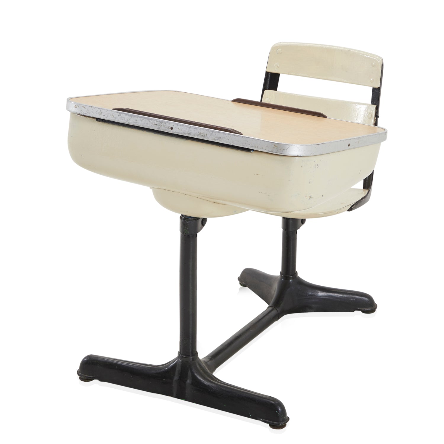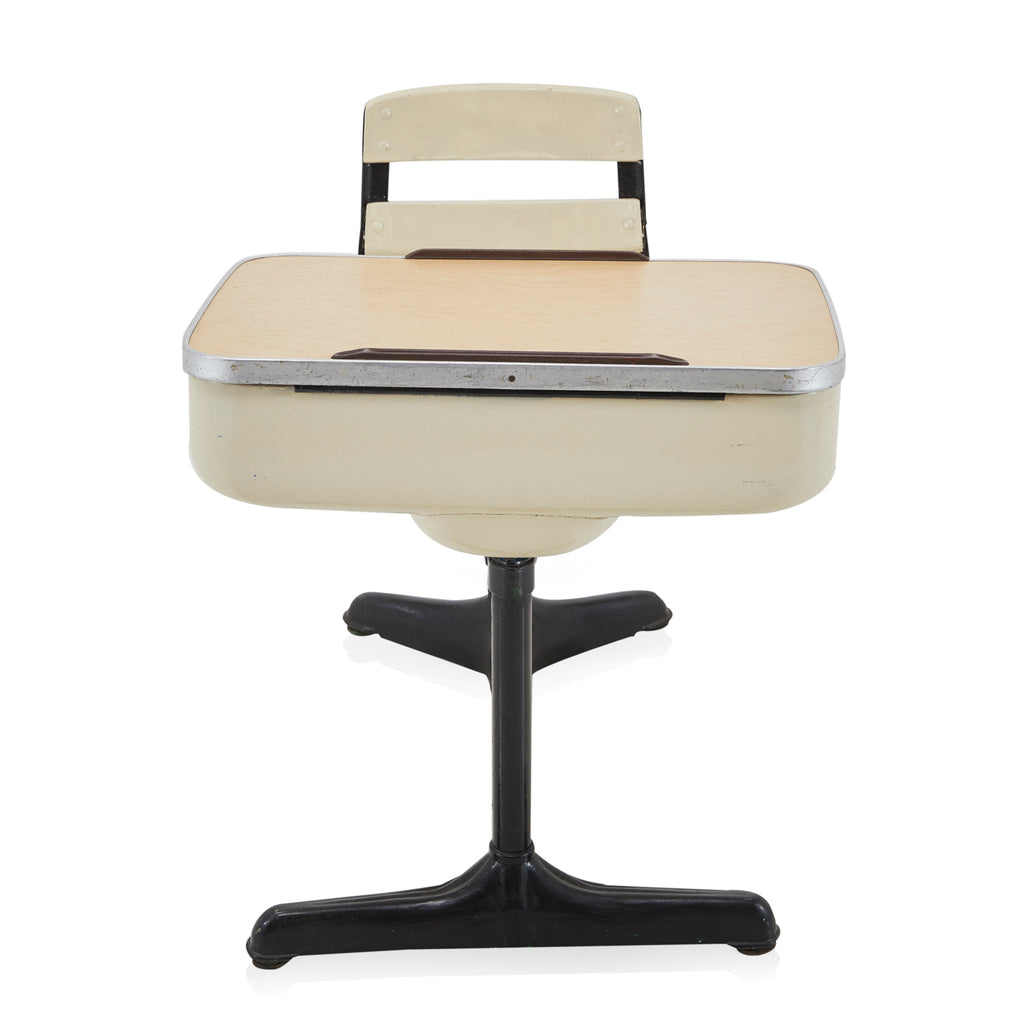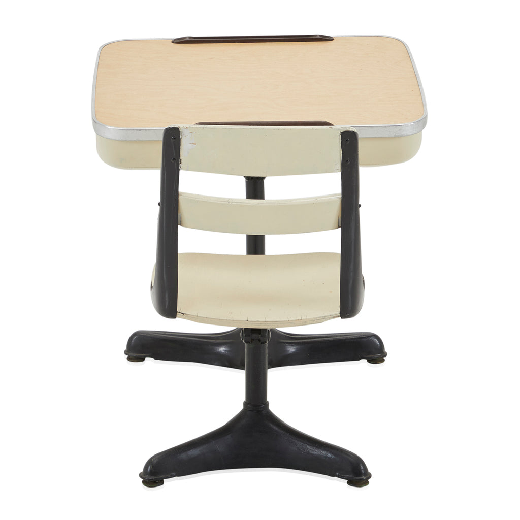 Details: White desk and chair combo with black legs, chrome frame and wood detailing Dimensions: 26" H X 24" W X 32" D Quantity: 1