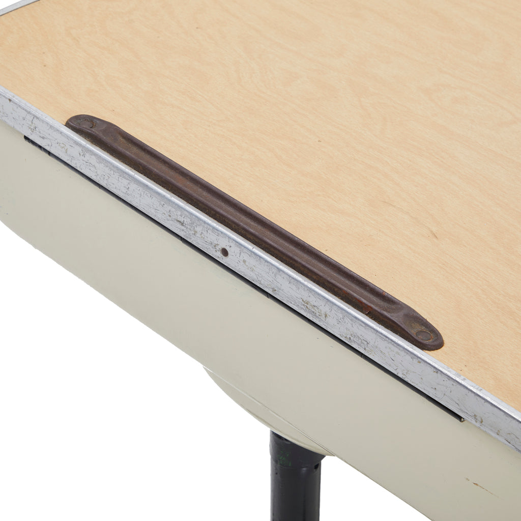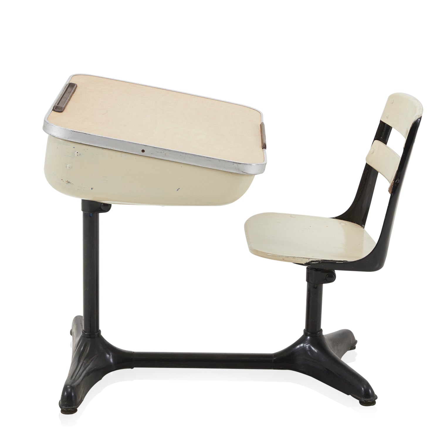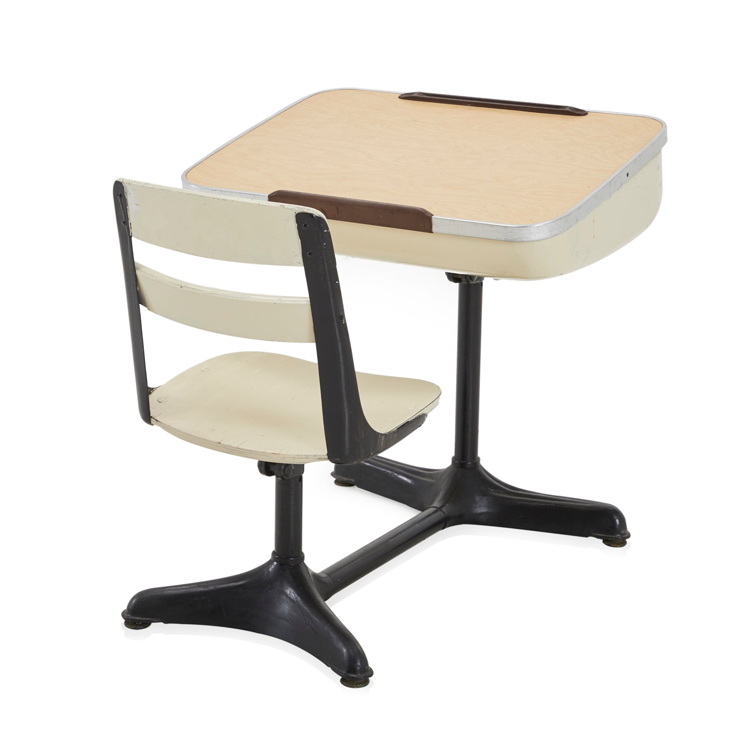 Details: White desk and chair combo with black legs, chrome frame and wood detailing Dimensions: 26" H X 24" W X 32" D Quantity: 1