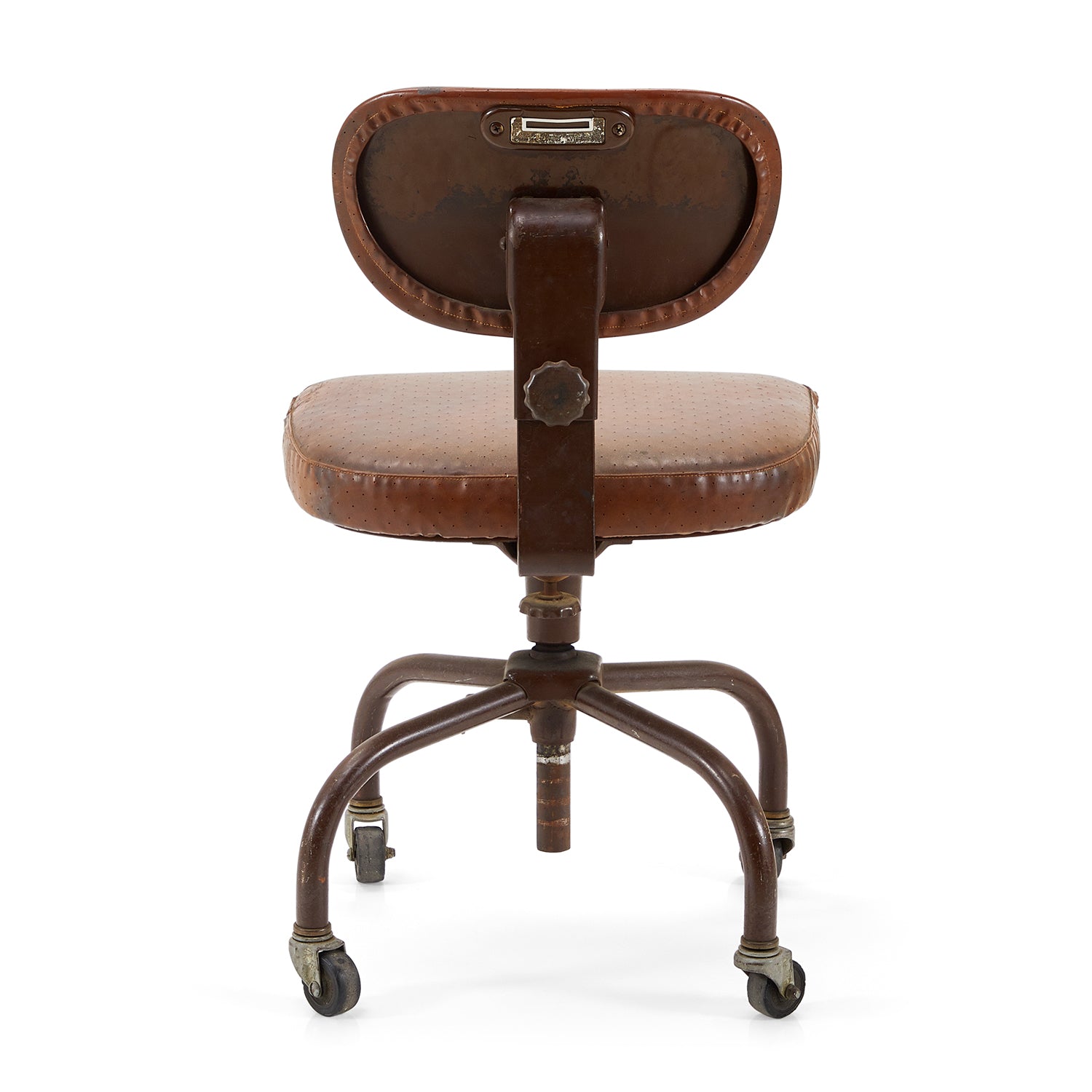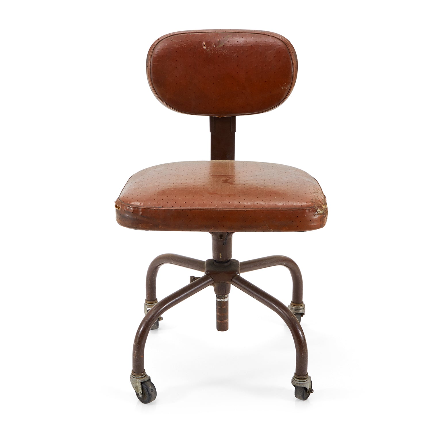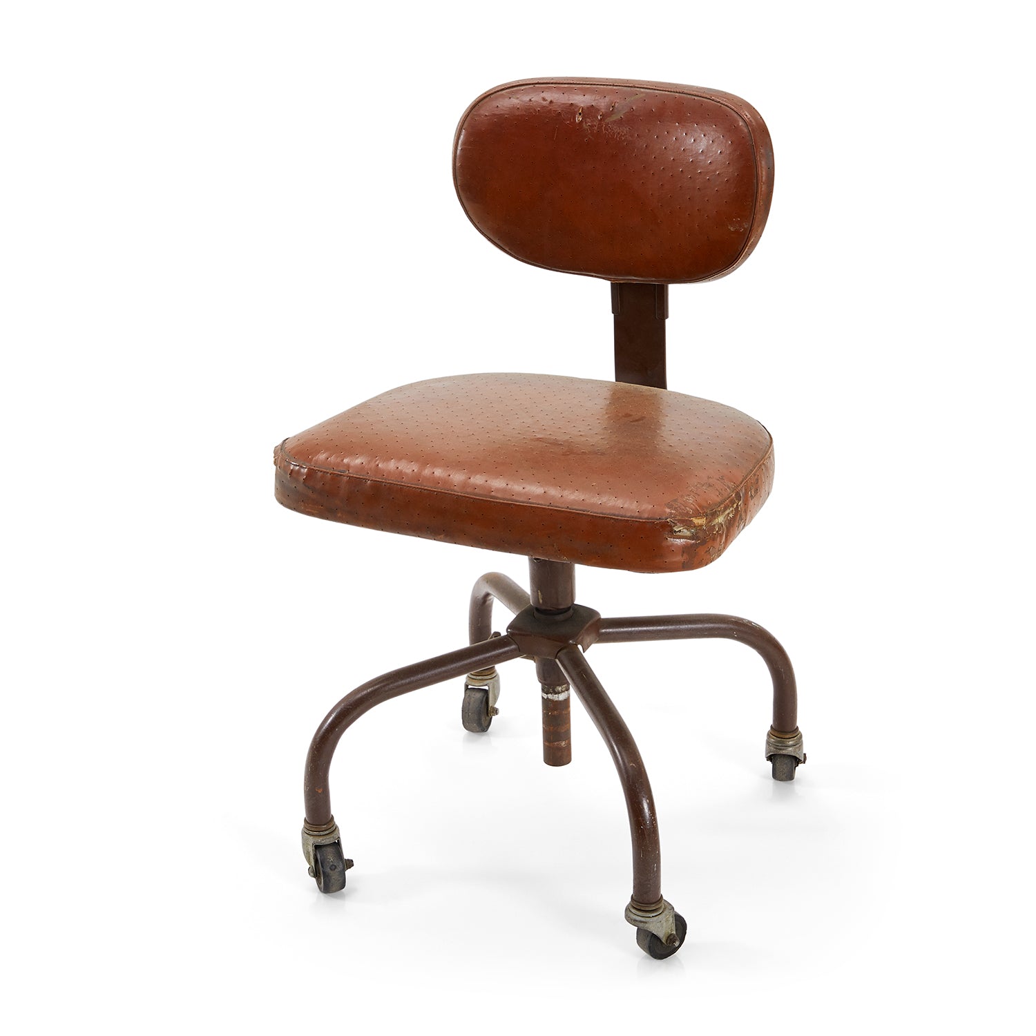 Detail: Desk chair with worn brown leather upholstery and metal base on wheels Dimensions: 29" H x 18" W x 14" D