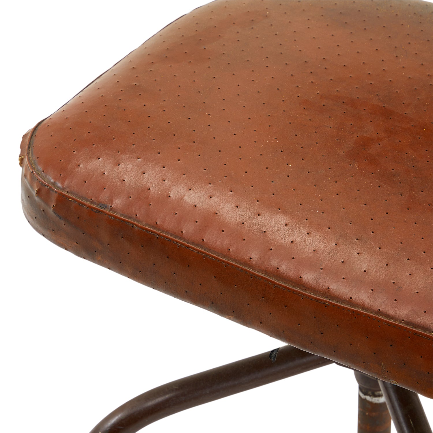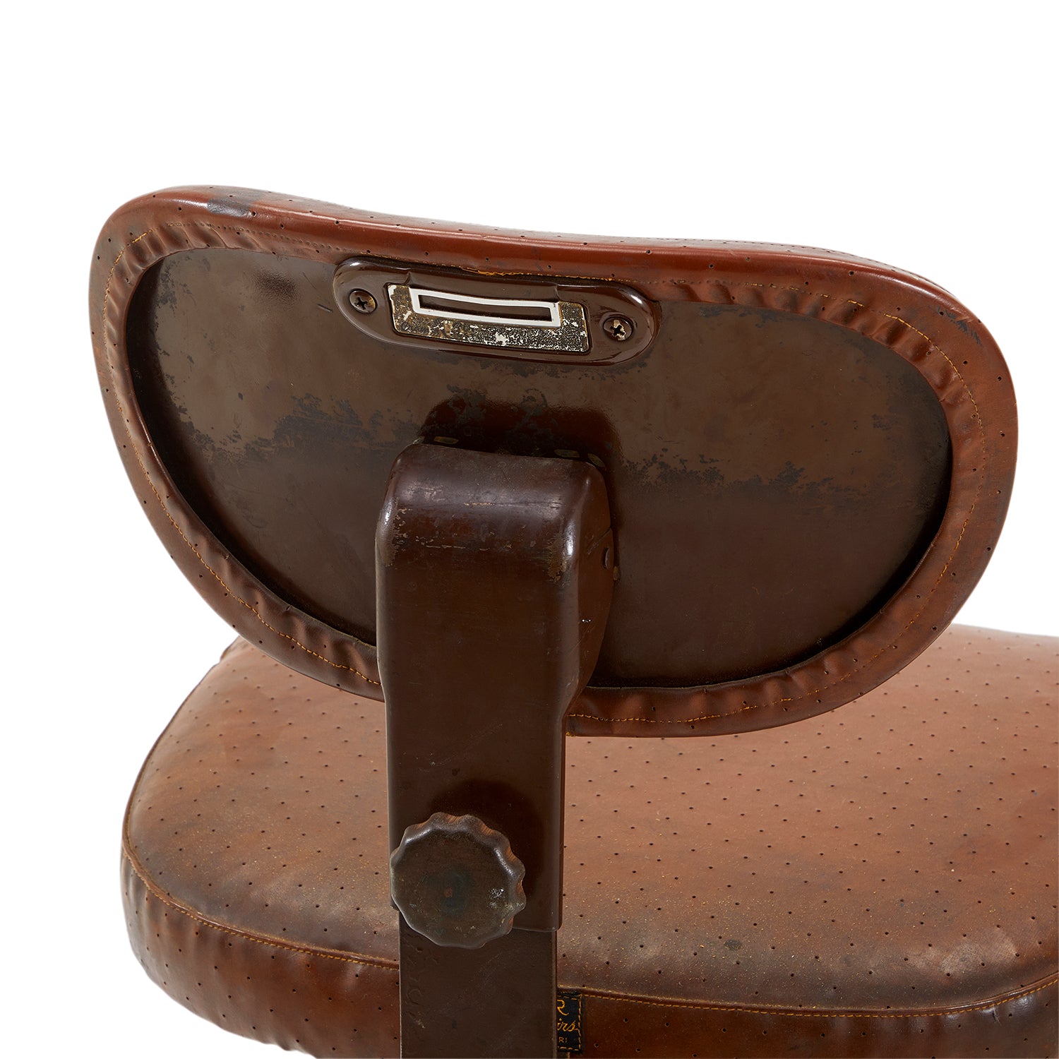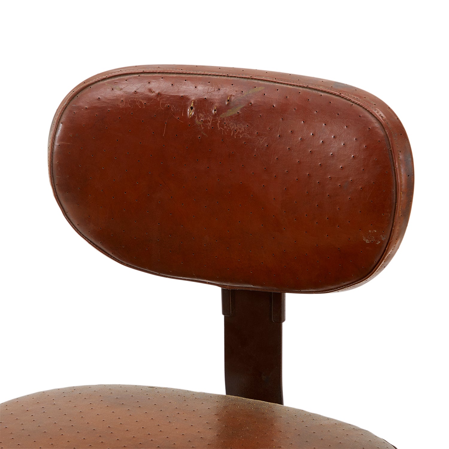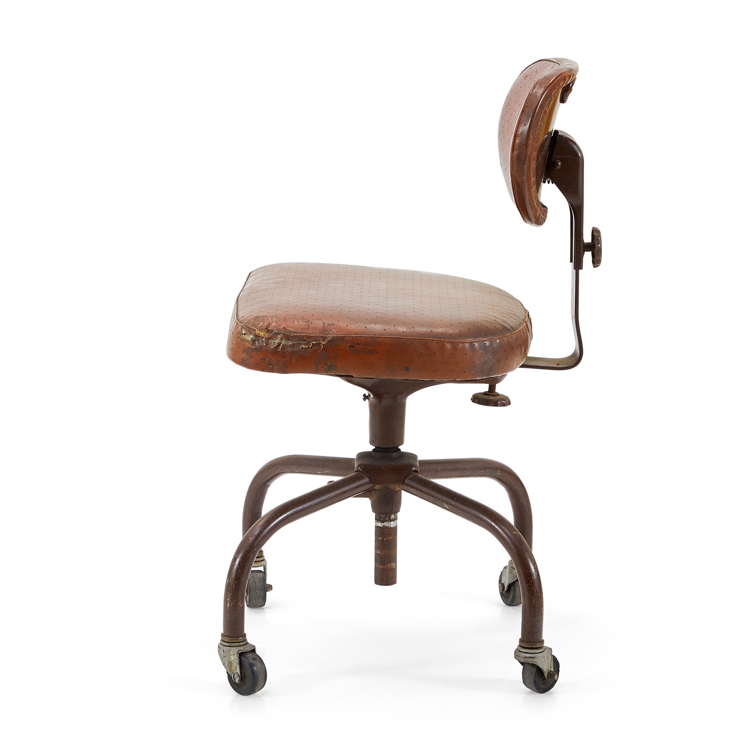 Detail: Desk chair with worn brown leather upholstery and metal base on wheels Dimensions: 29" H x 18" W x 14" D