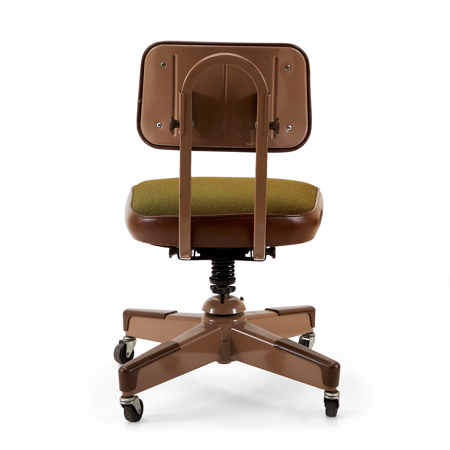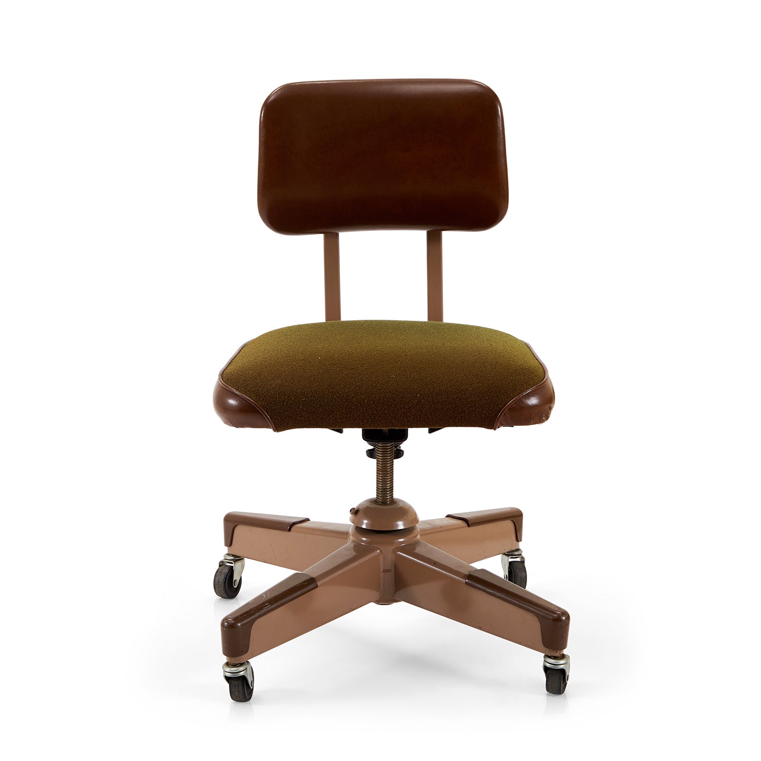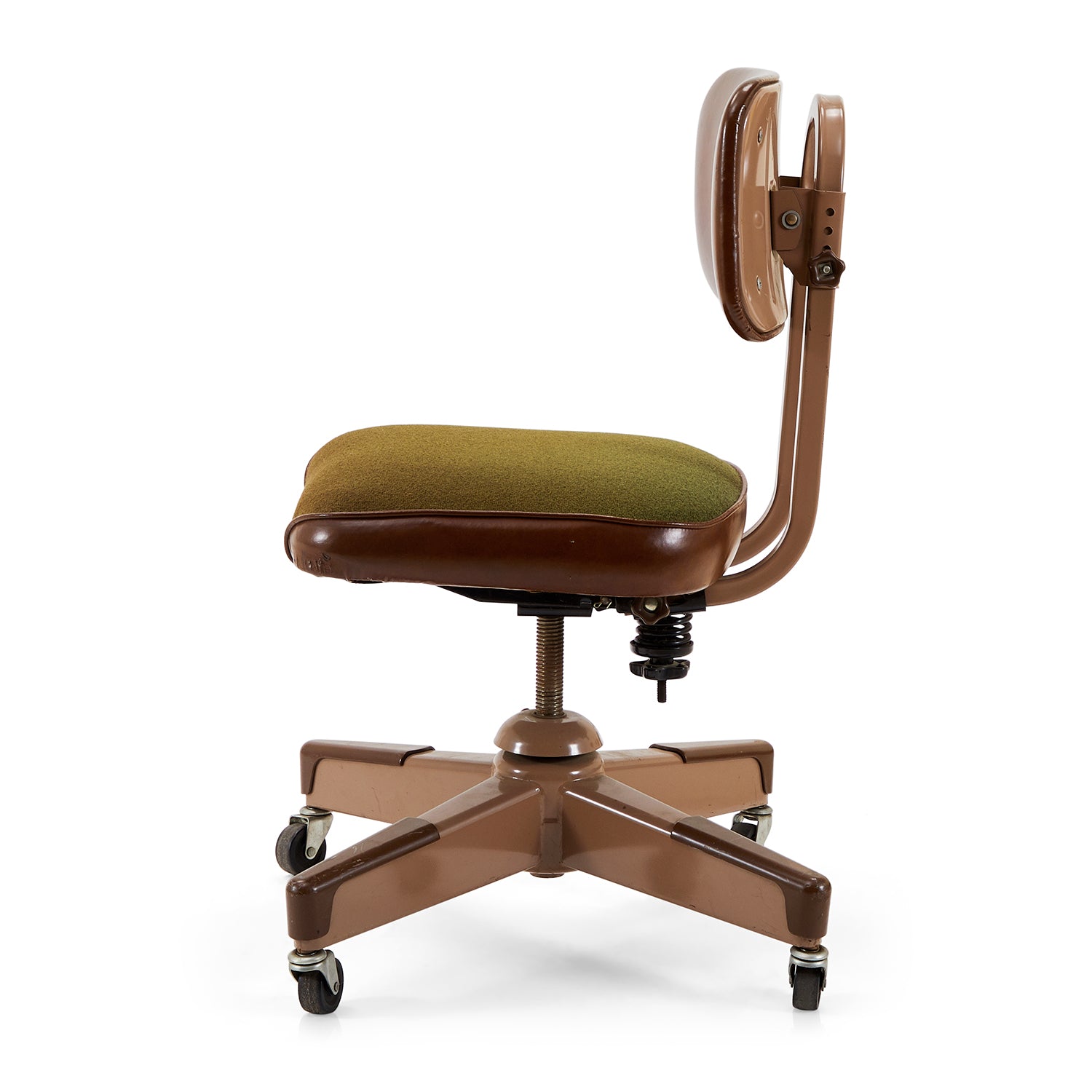 Details: Mid-century modern rolling office chair with beige canvas upholstery, tapered back and keyhole design