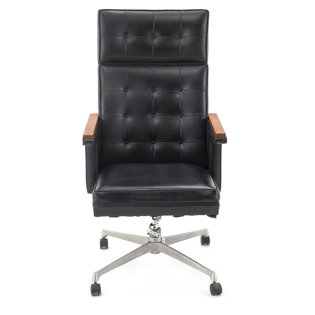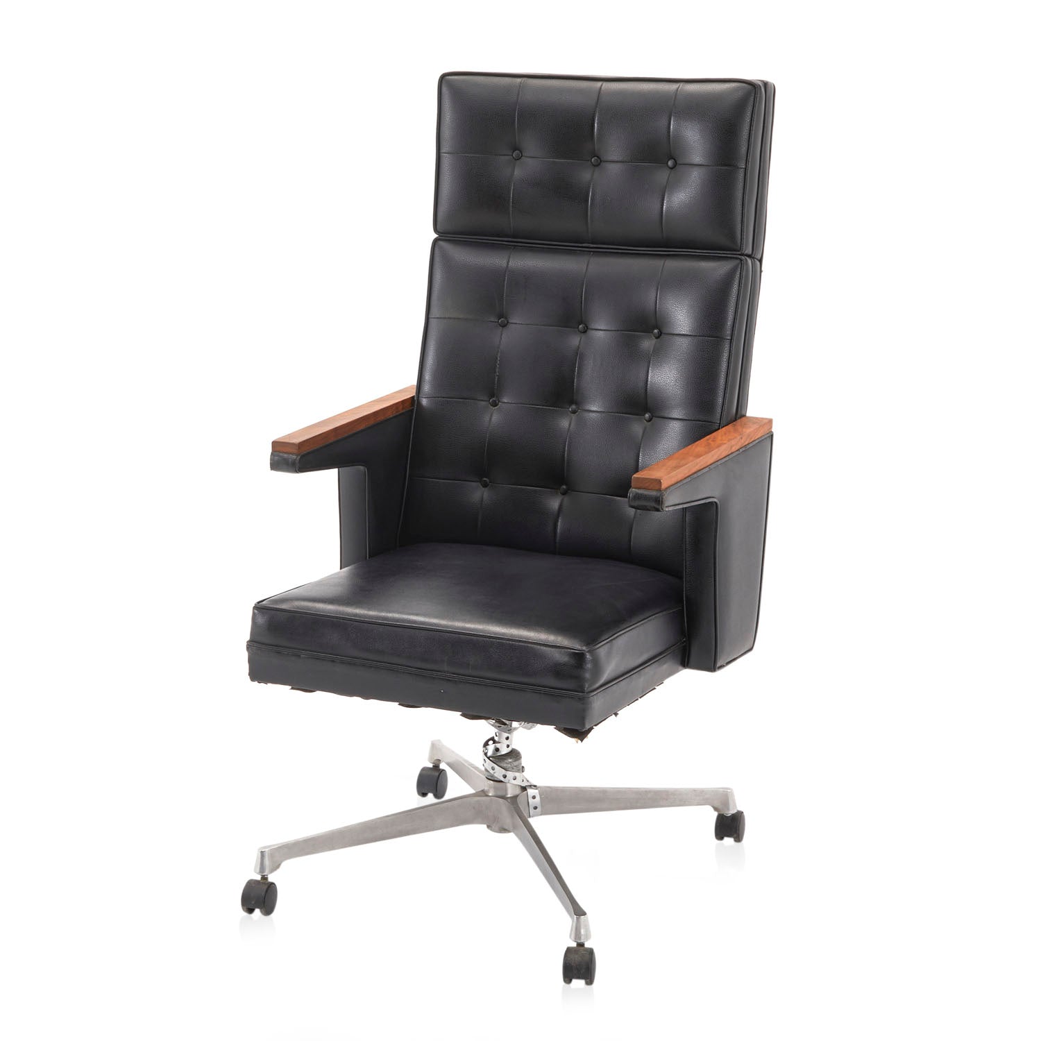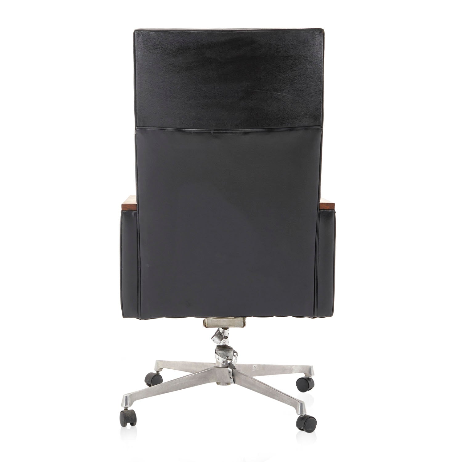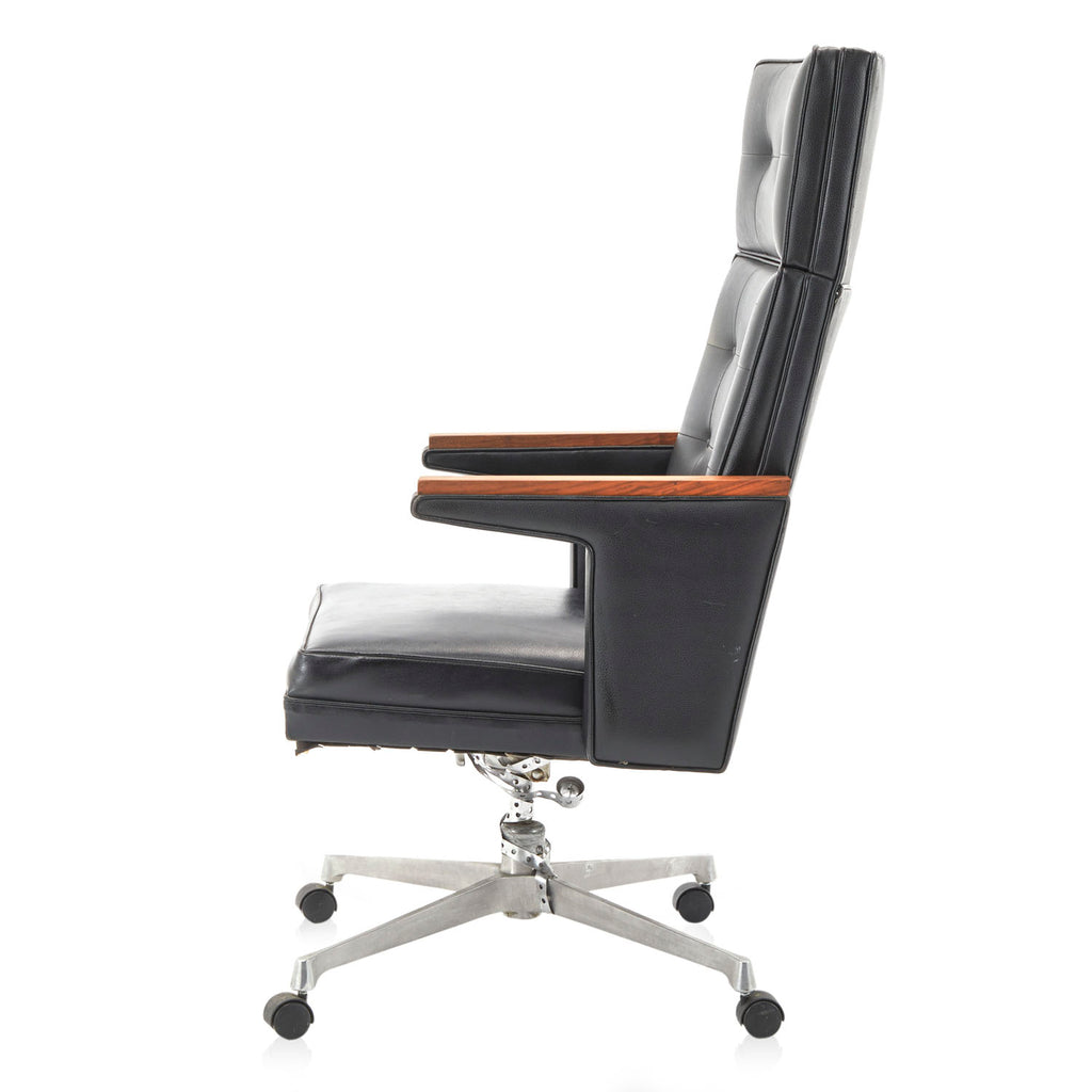 Details: Black tufted leather executive arm chair with metal rolling base and wood arms