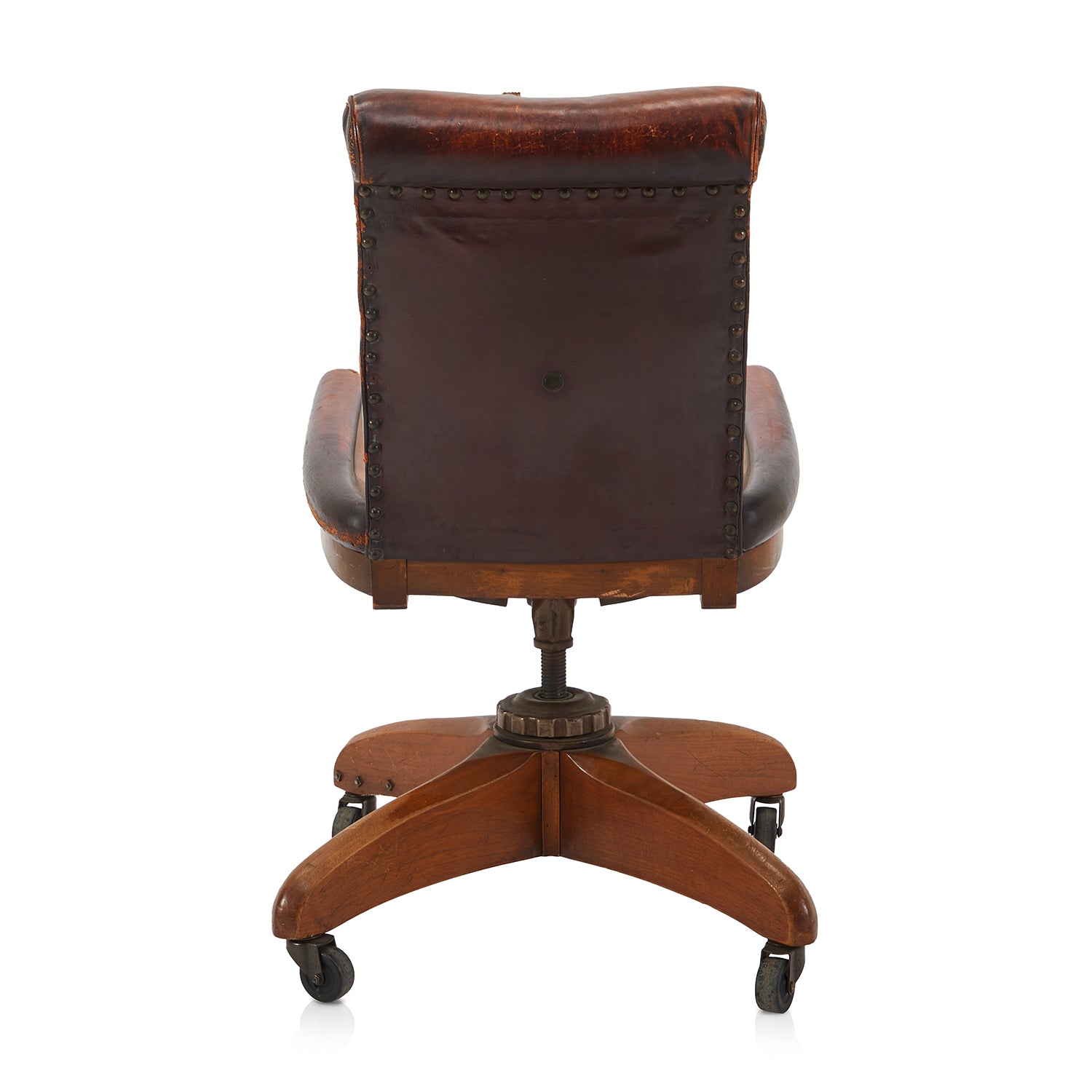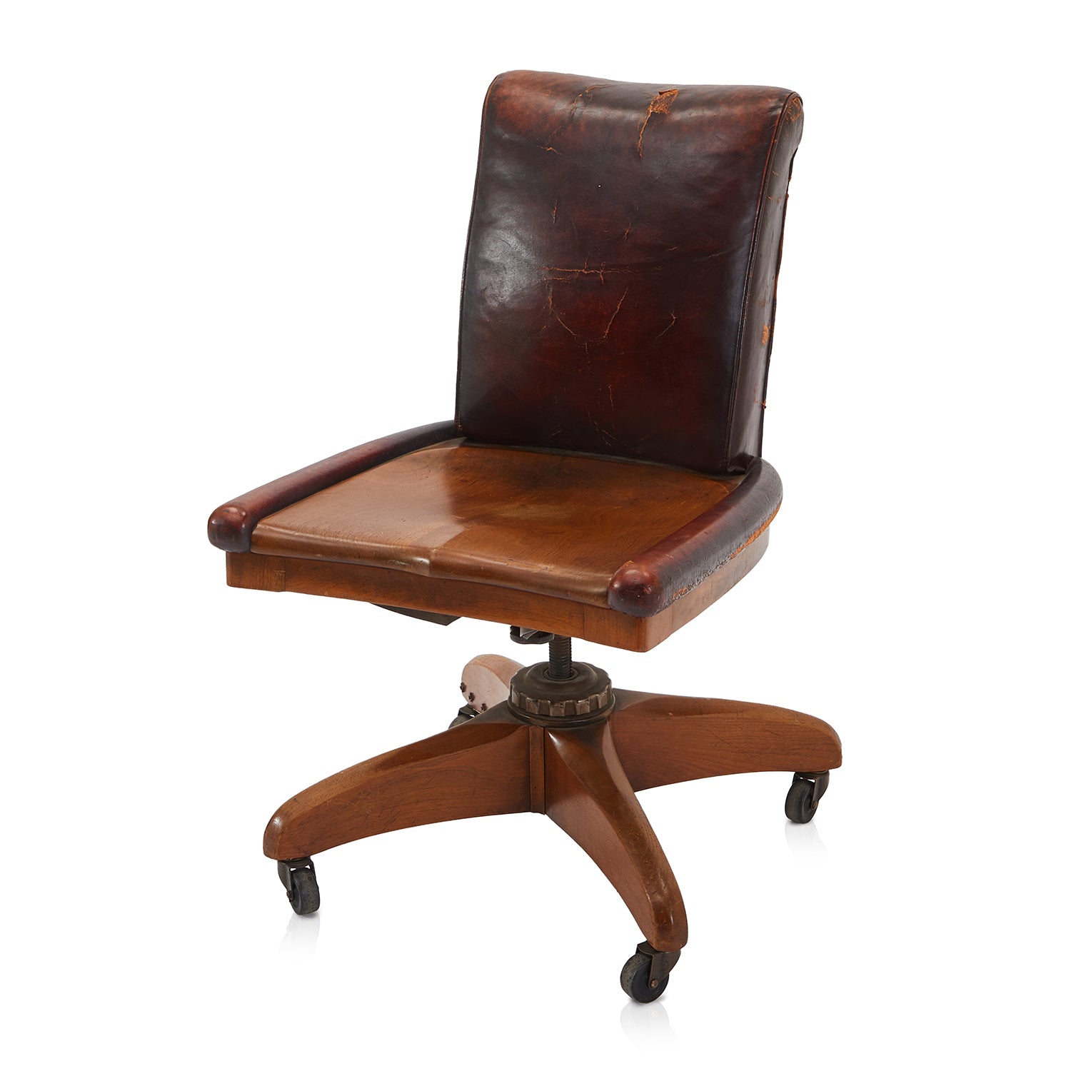 Details: Wood frame office chair with brown leather upholstery Dimensions: 35" H x 23" W x 26" D