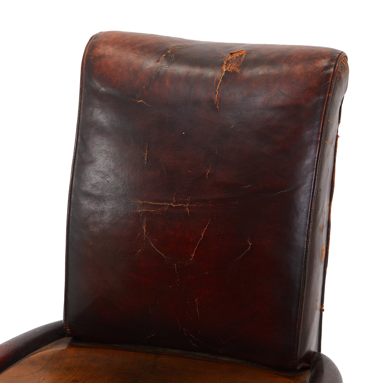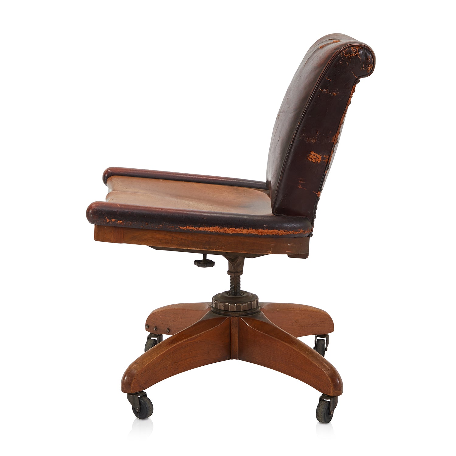Details: Wooden armless rolling chair with distressed brown leather upholstery Dimensions: 32" H x 19" W x 26" D