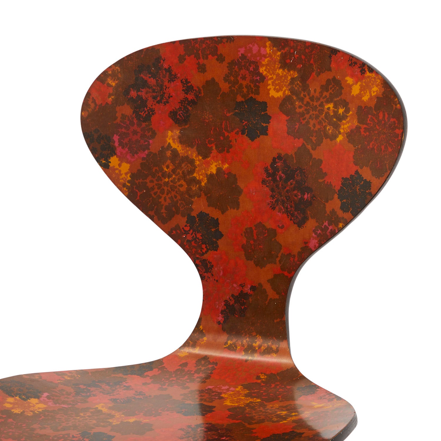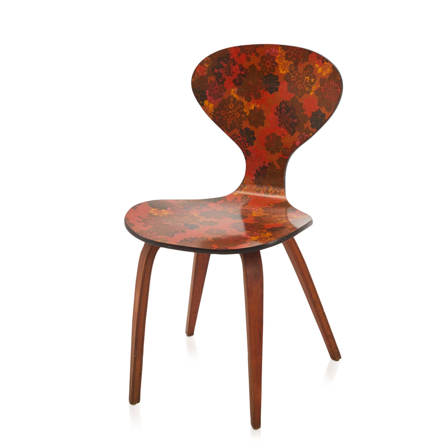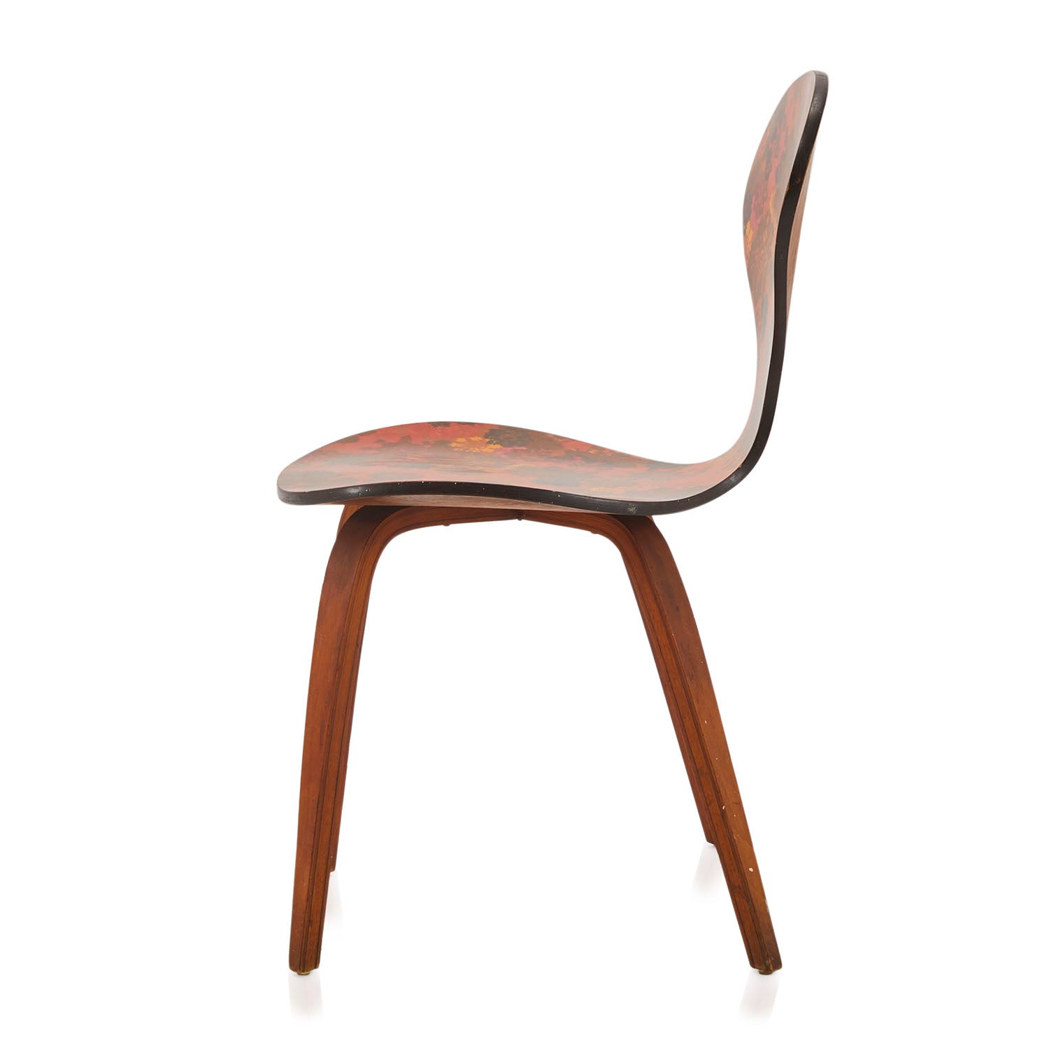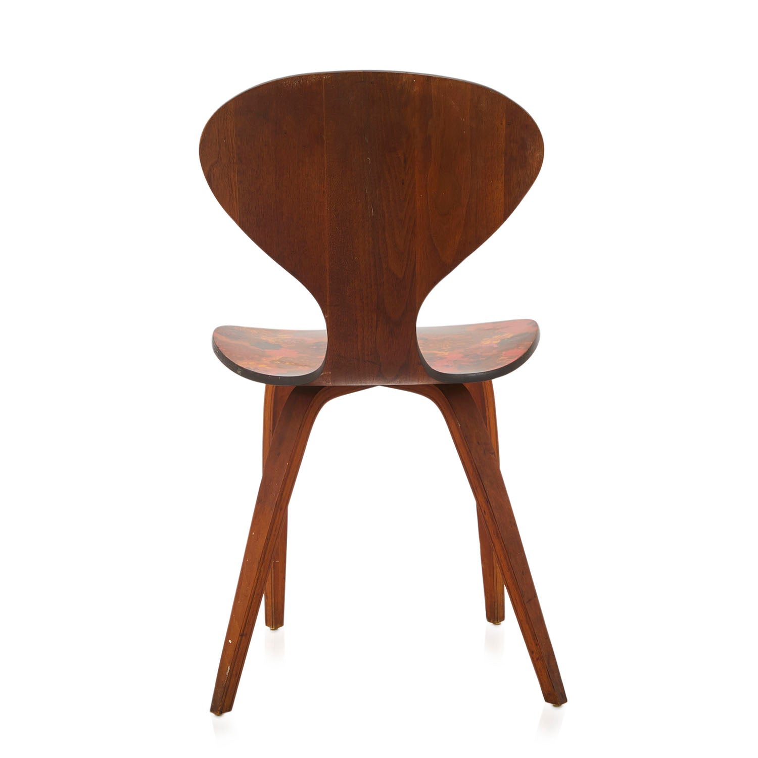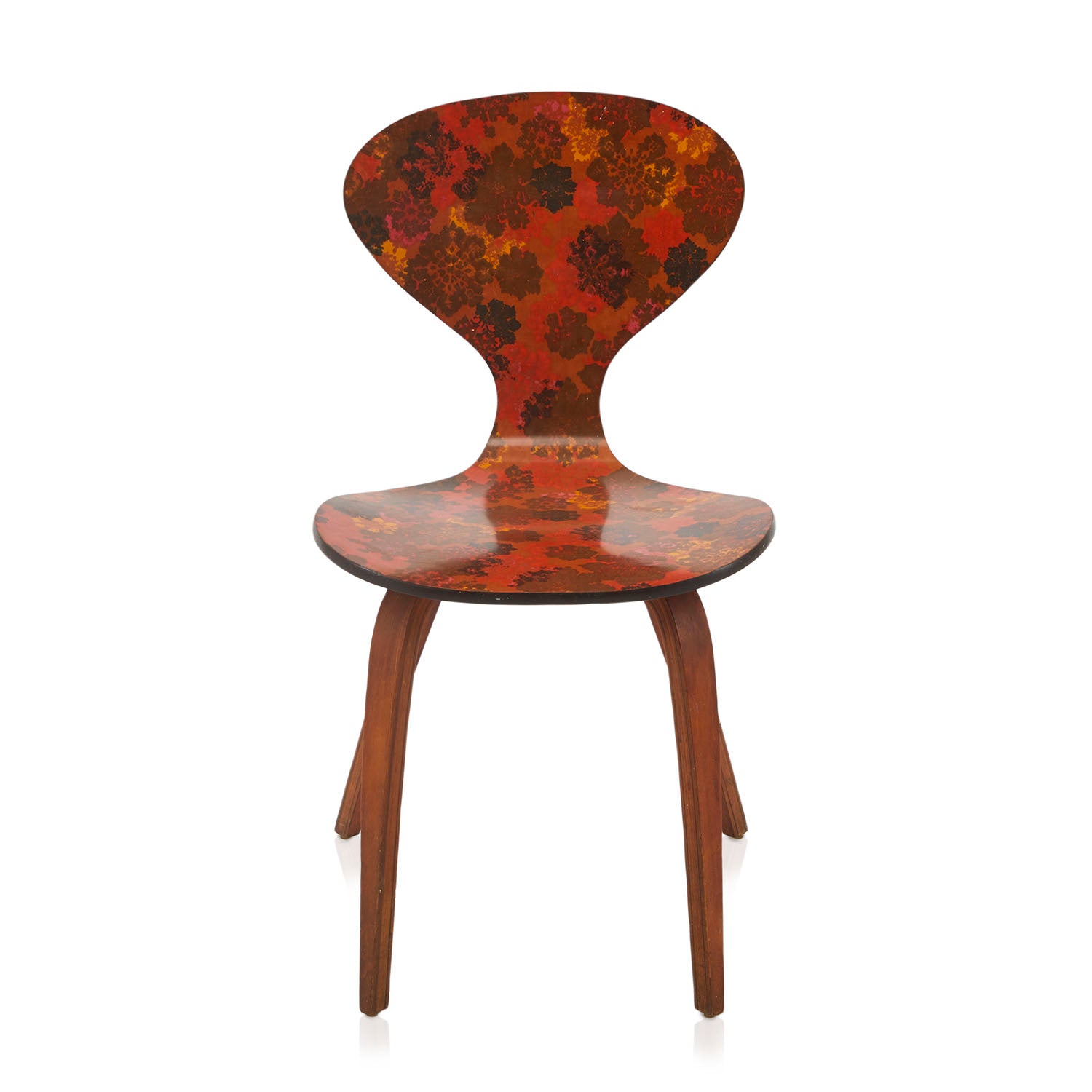 Details: Mid Century dining / side chair with rounded back and rust/orange/burgundy snowflake / leaves print and wood legs, similar to the classic Cherner chair Dimensions: 32"...