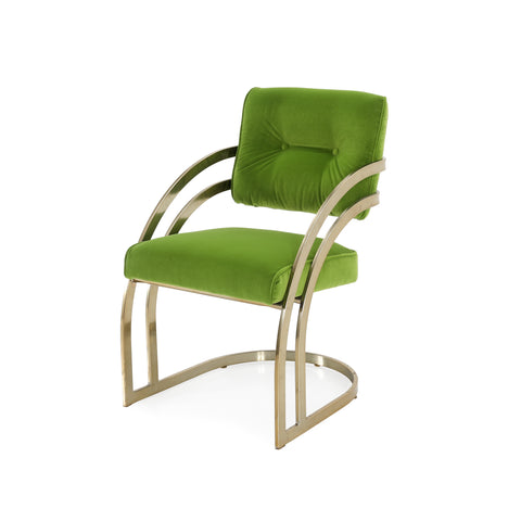 Details: Gold side chair with art deco design and green velvet cushion Dimensions: 31" H x 20" W x 27" D Quantity: 6