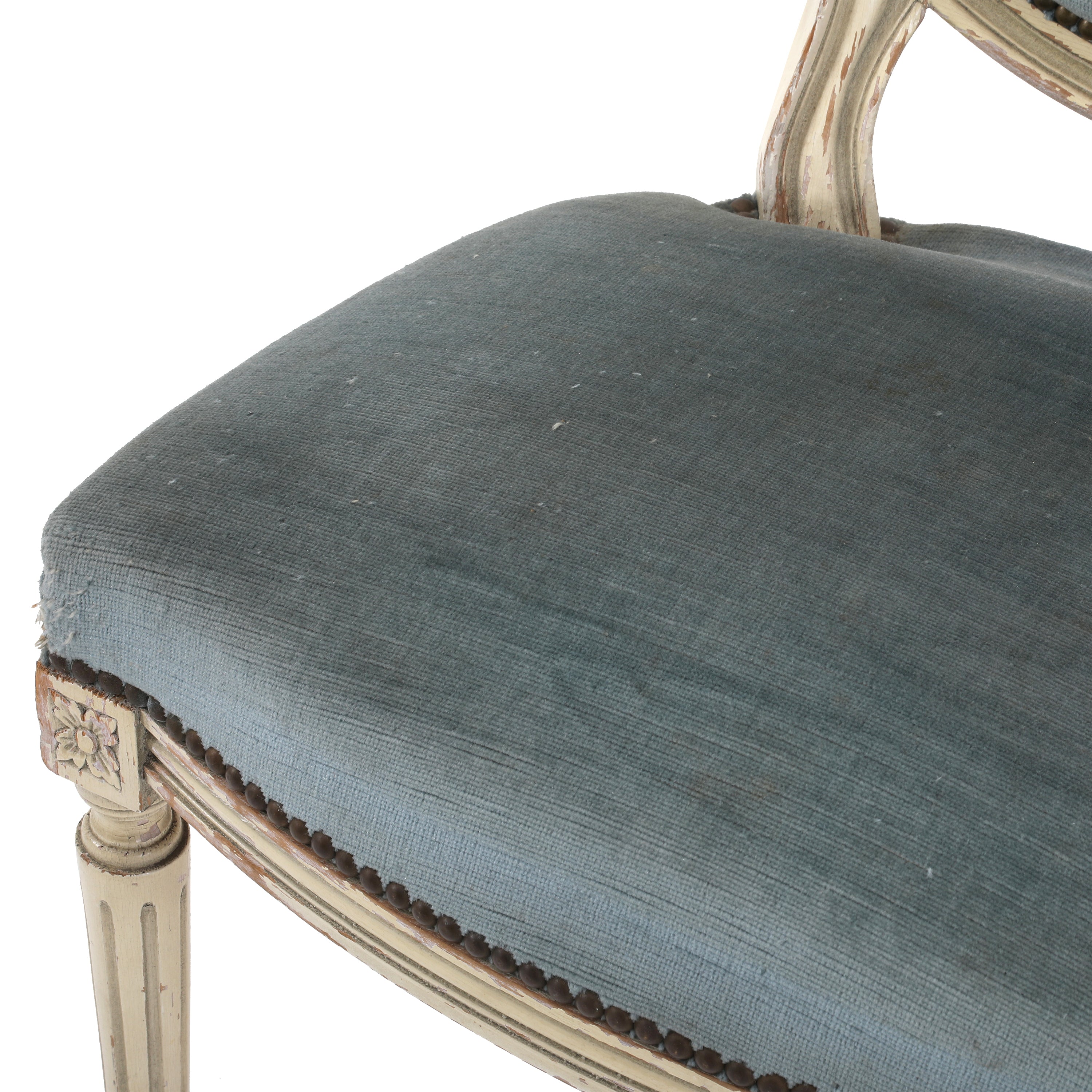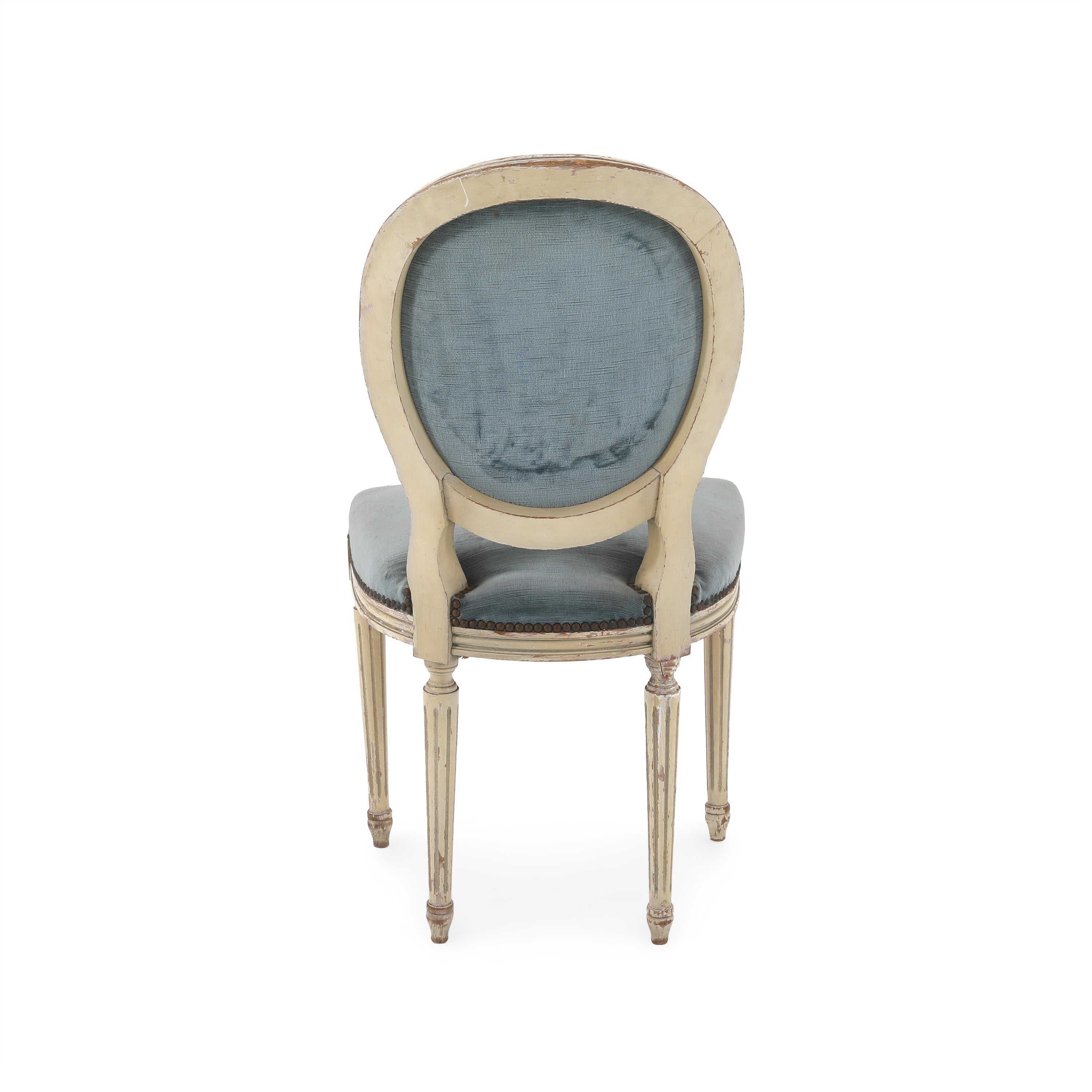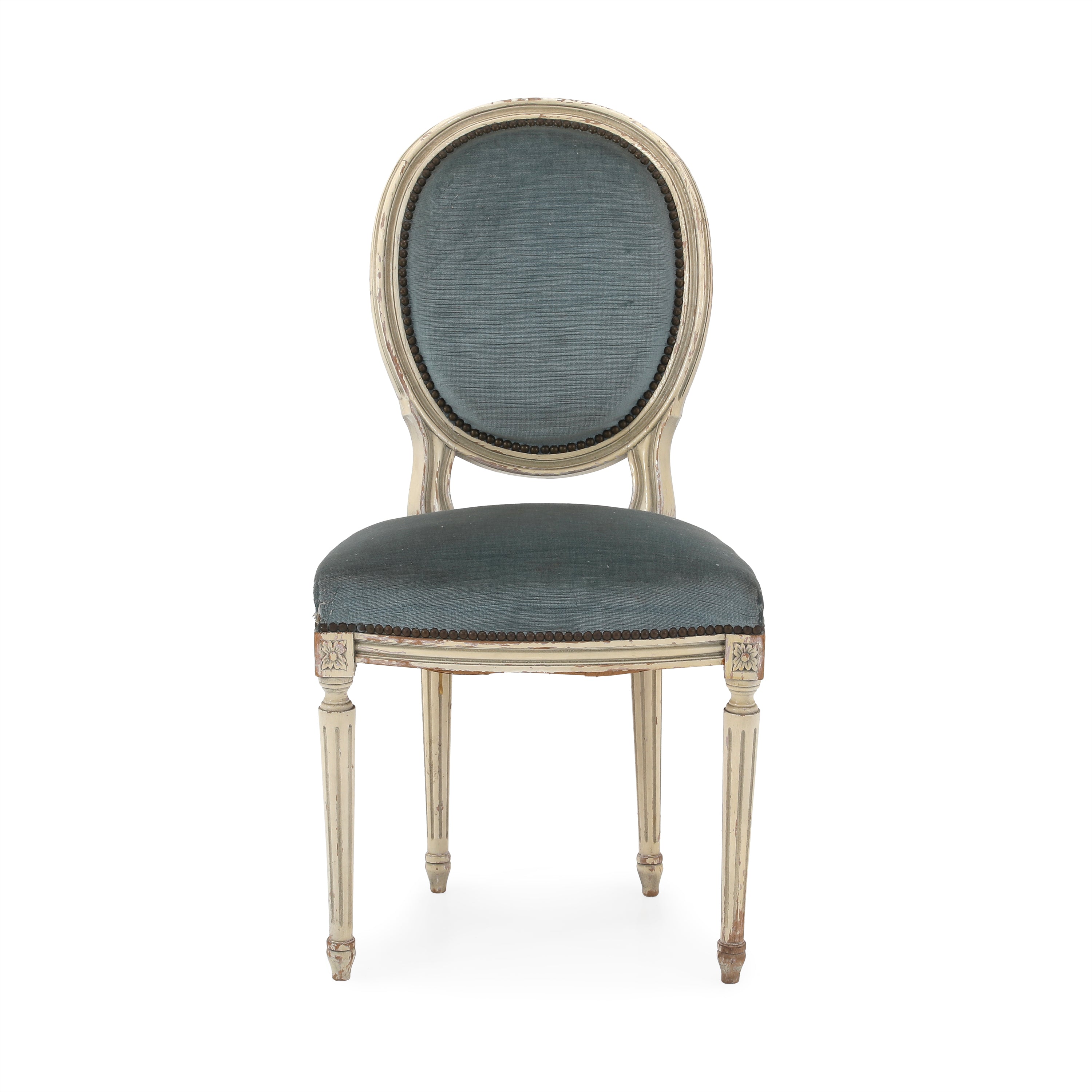 Details: Distressed dining chair with chipped paint. Dimensions: 32.5" H x 16" W x 17" D