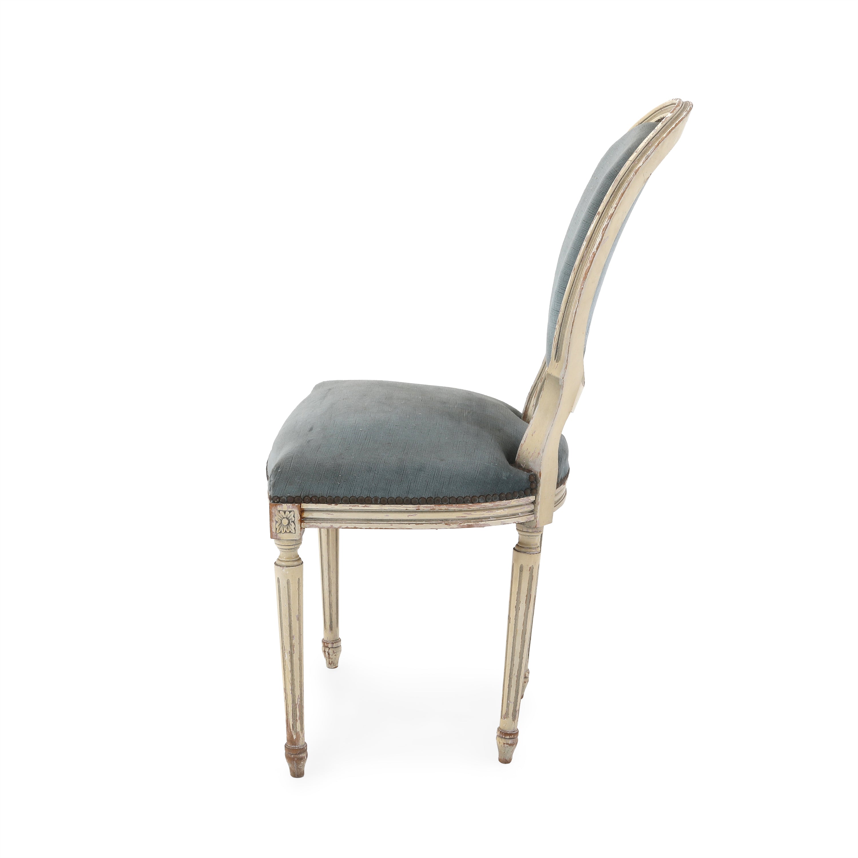 Antique Victorian chair with carved wood frame, grey-ish blue upholstered seat and back. Dimensions: 37" H x 20" W x 16" D