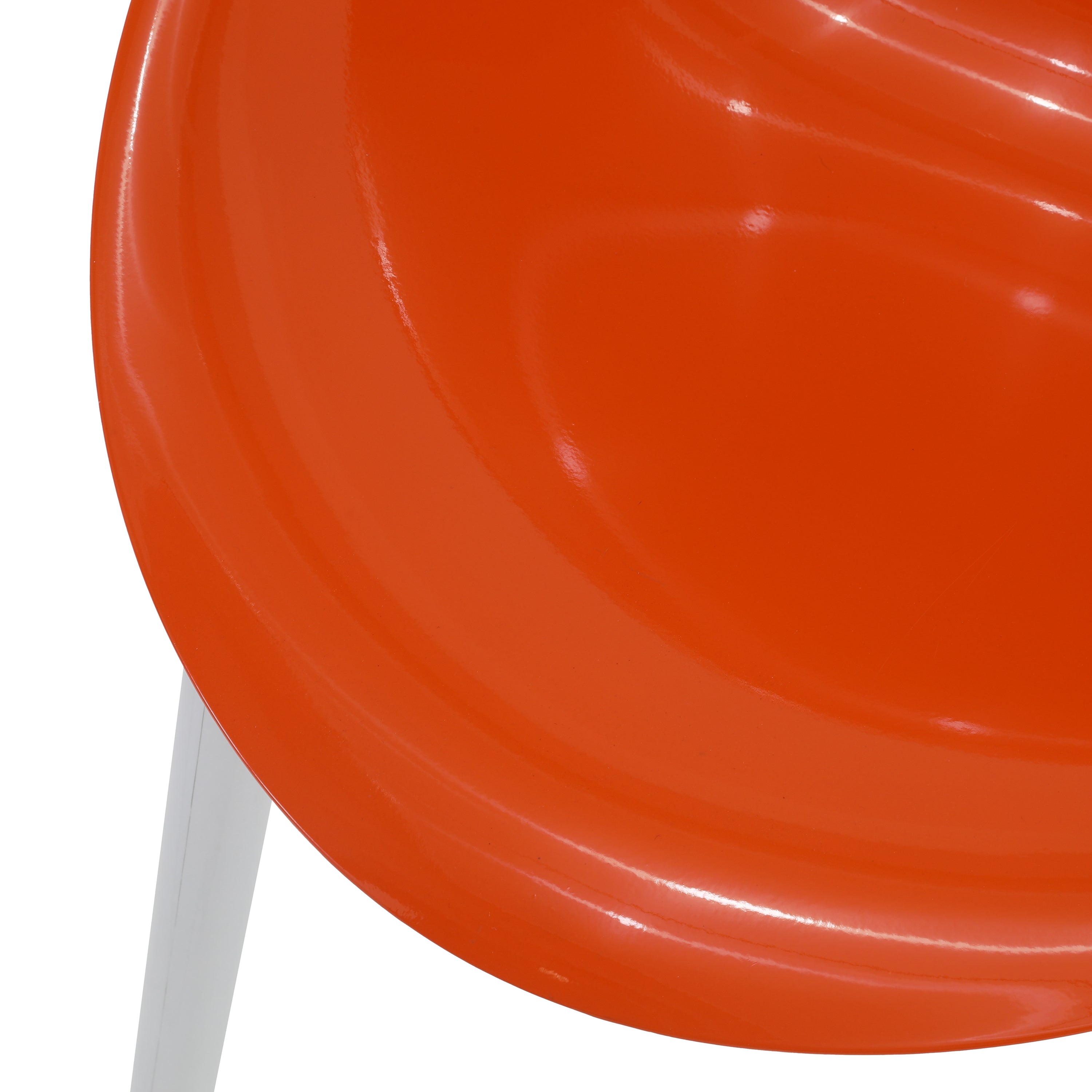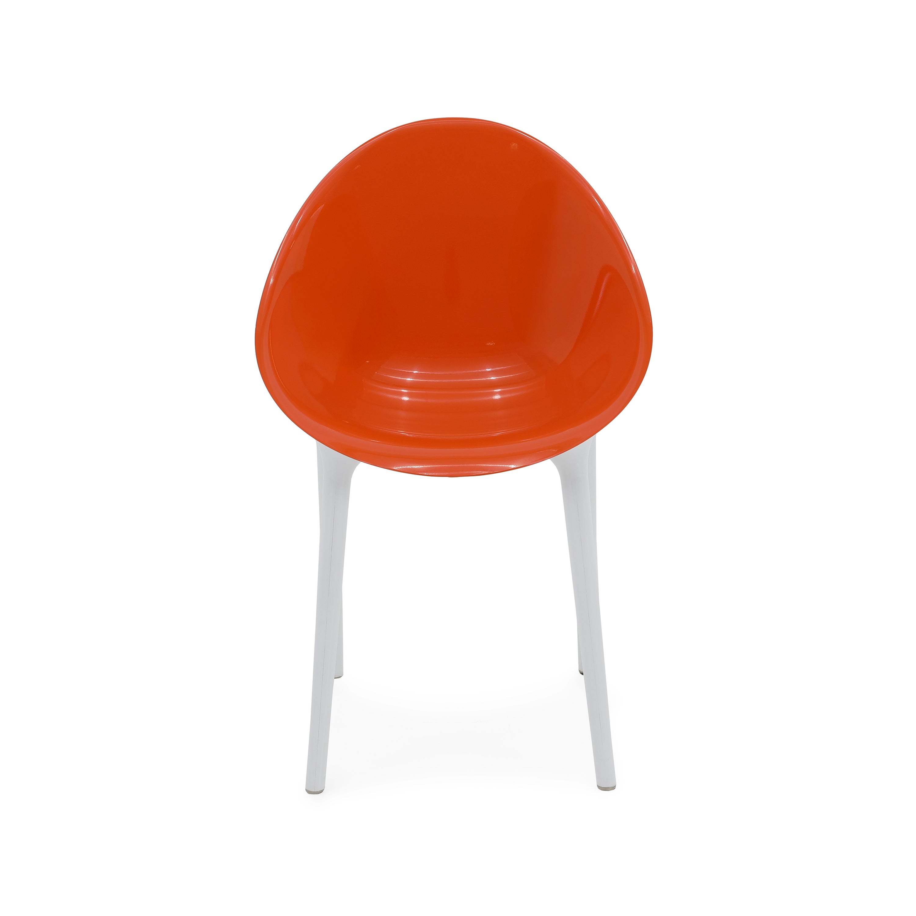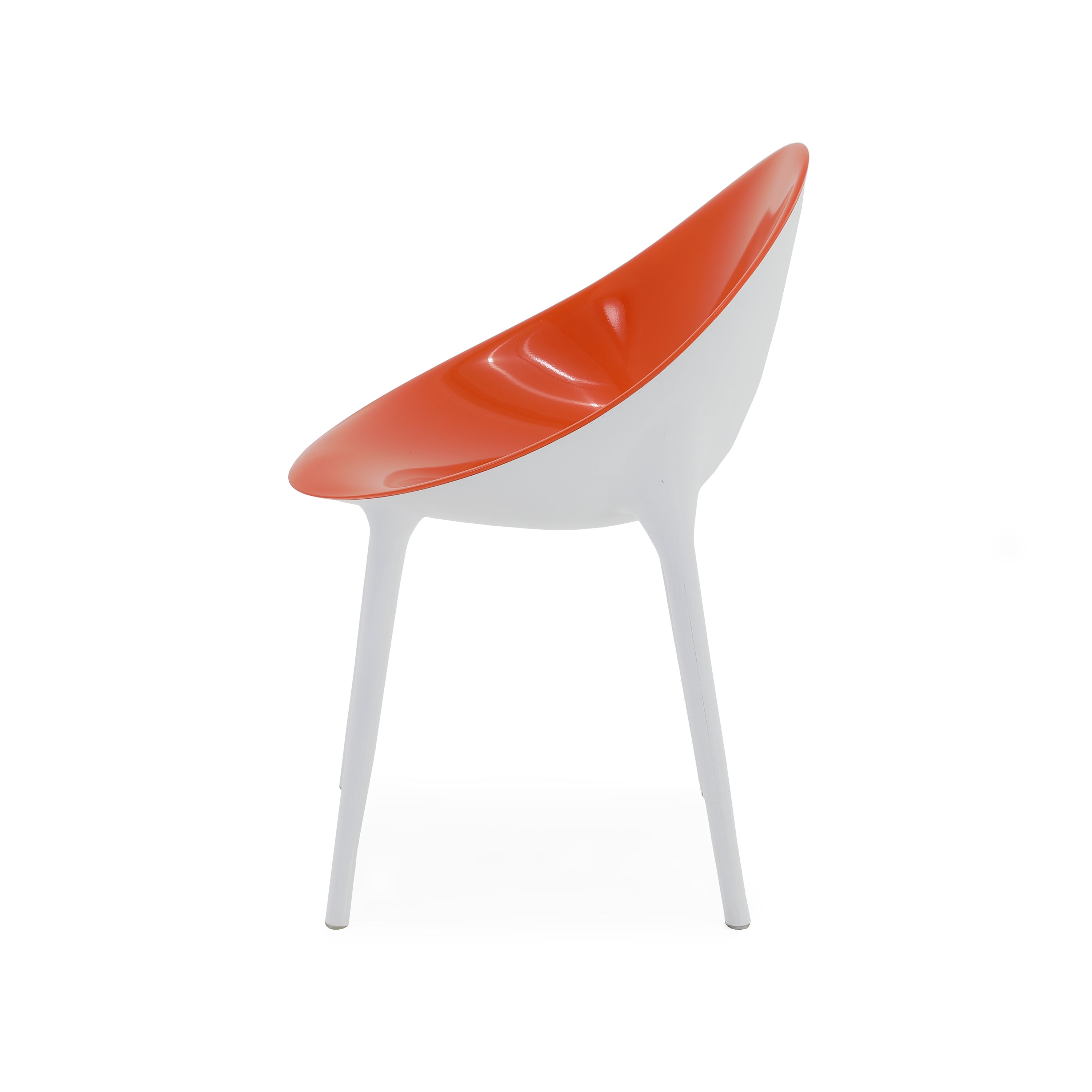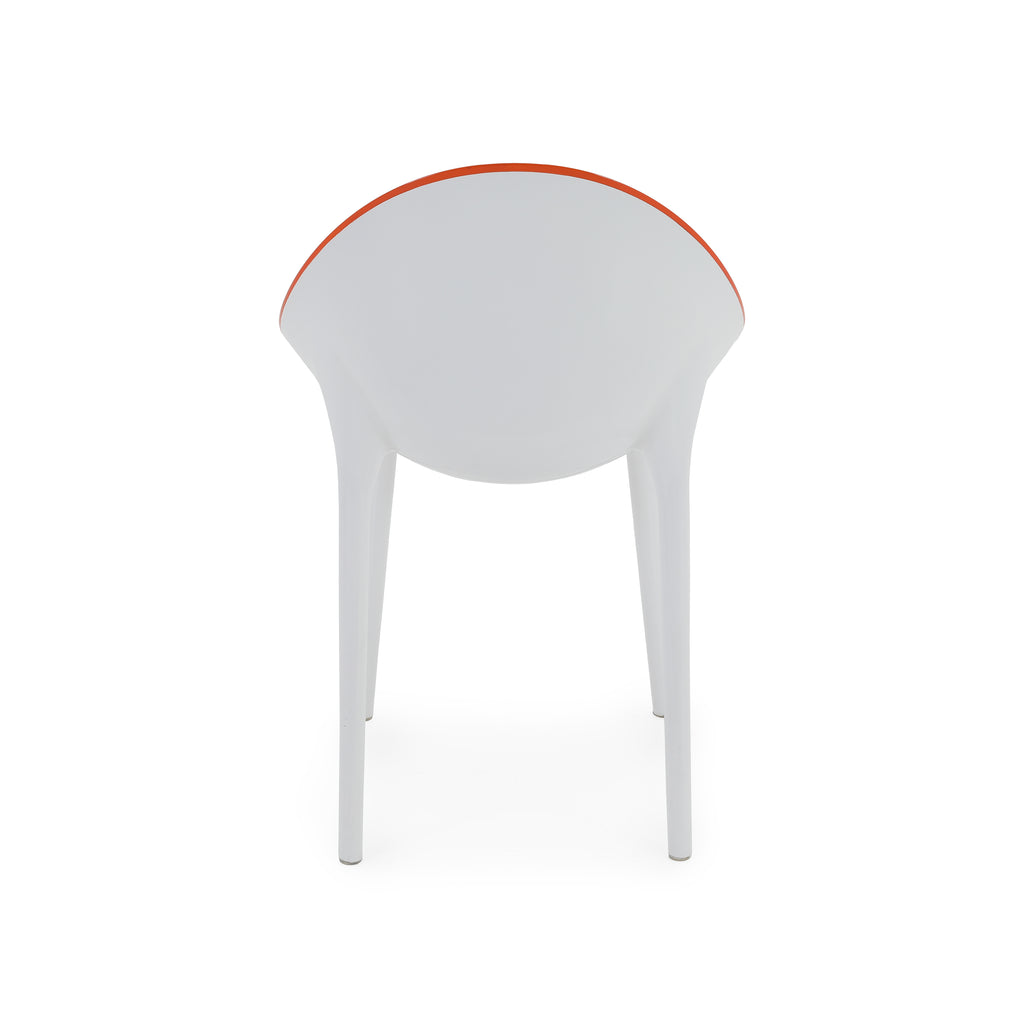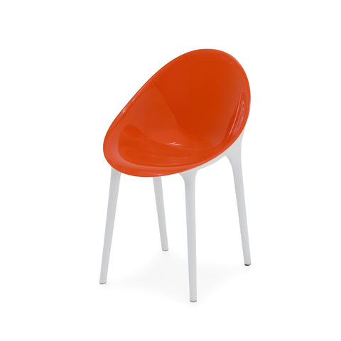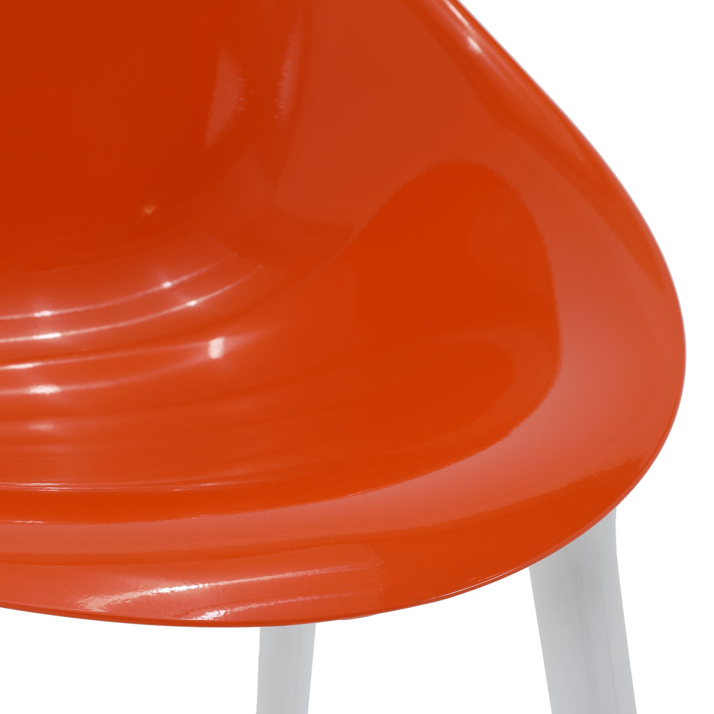 Details: Orange lucite chair with white legs Dimensions: 35" H x 21.5" W x 24" D