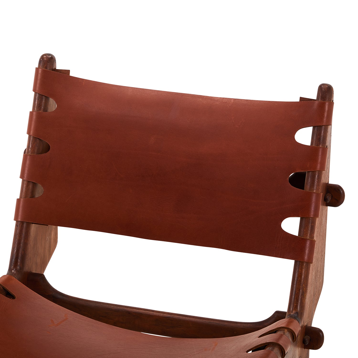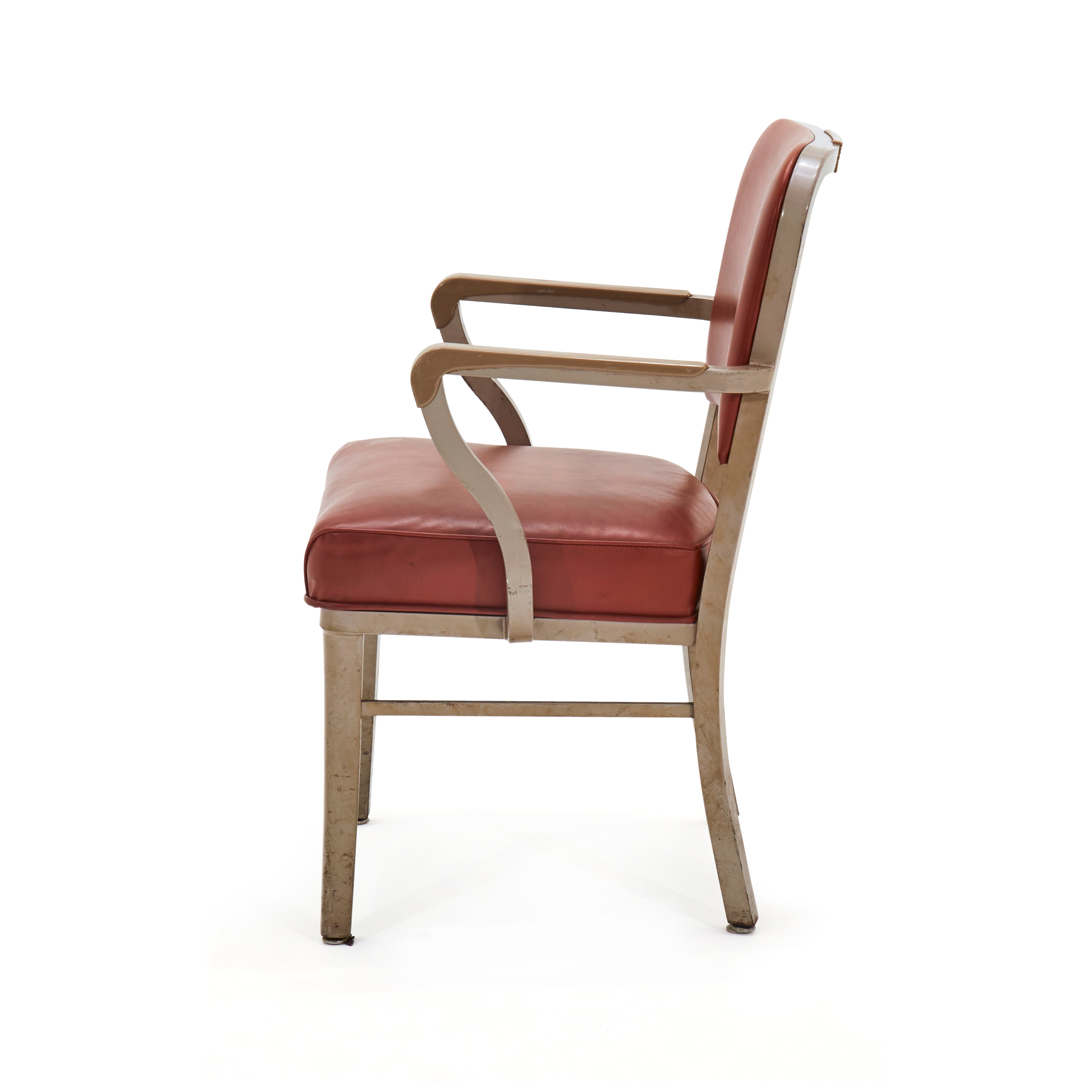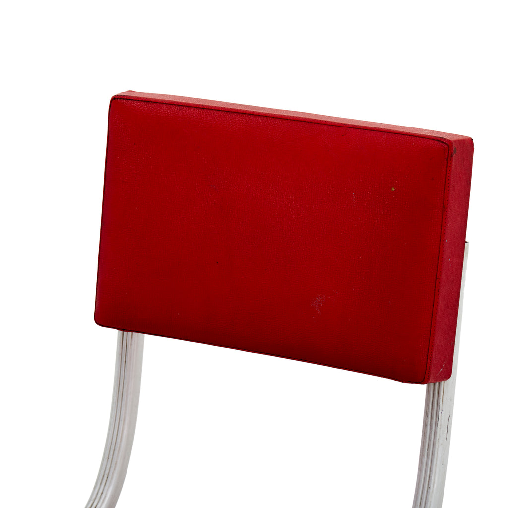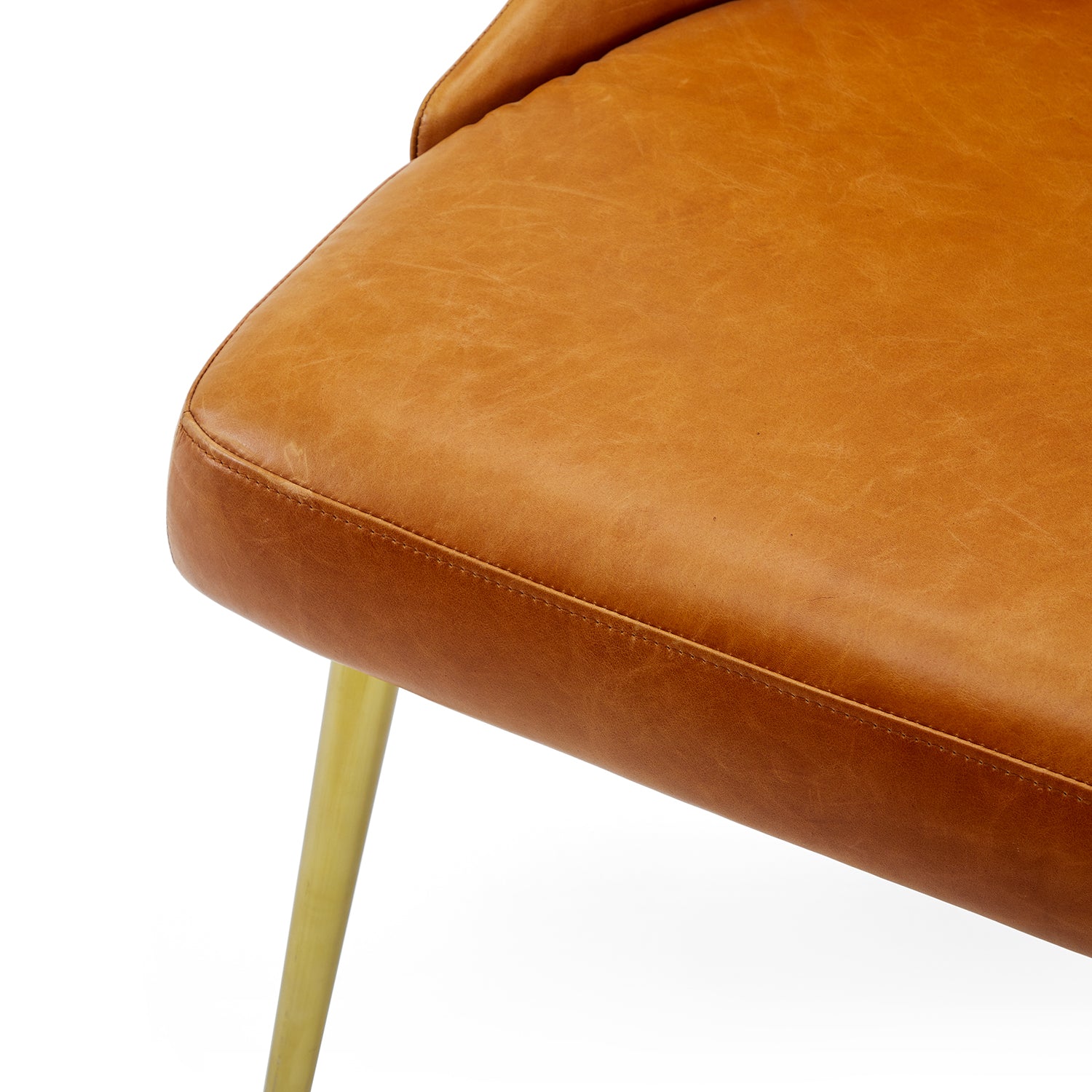 Details: Saddle brown / reddish leather-like vinyl dining chair with caramel brown stripes, black metal star base w brass detail Dimensions: 39" H x 16" W x 17"...