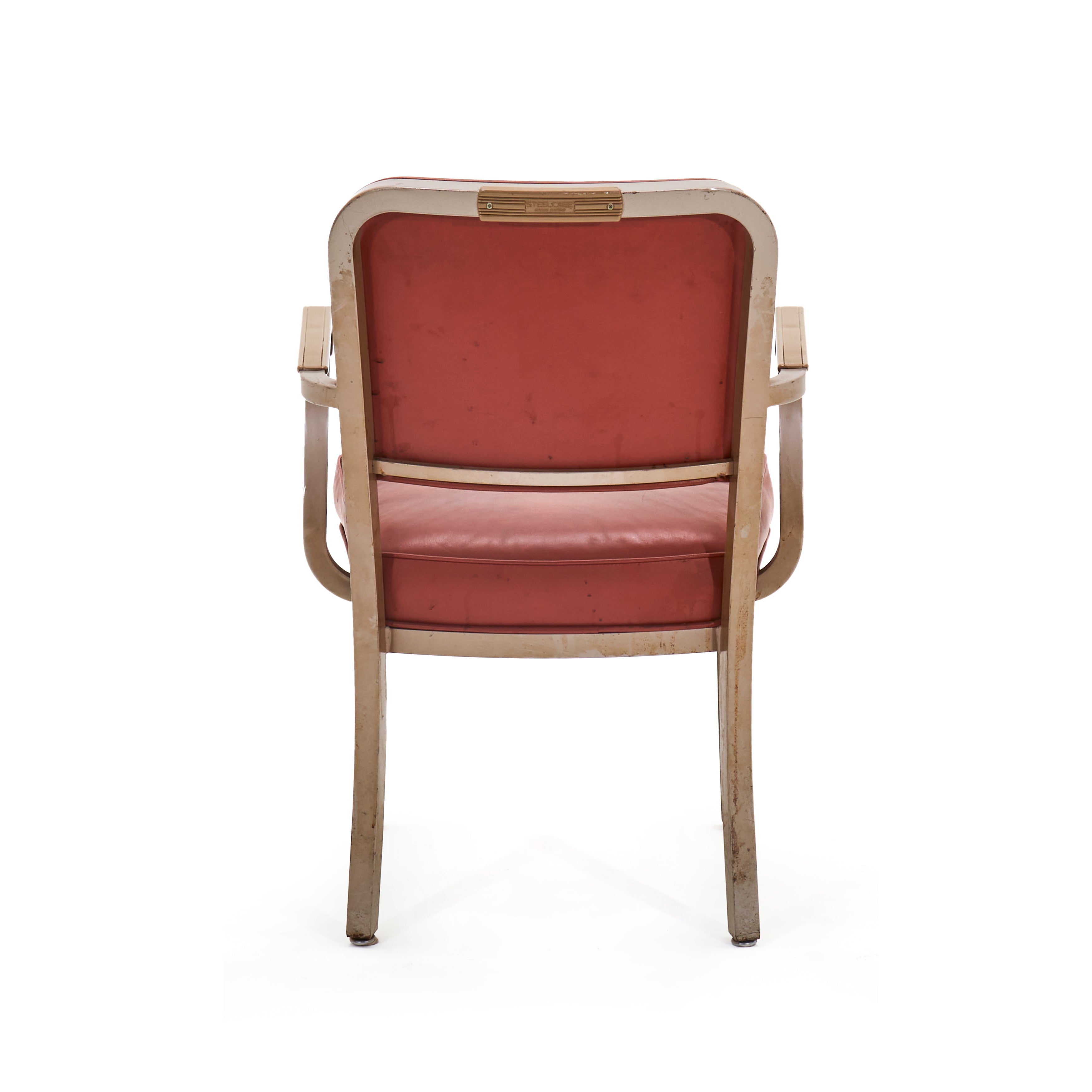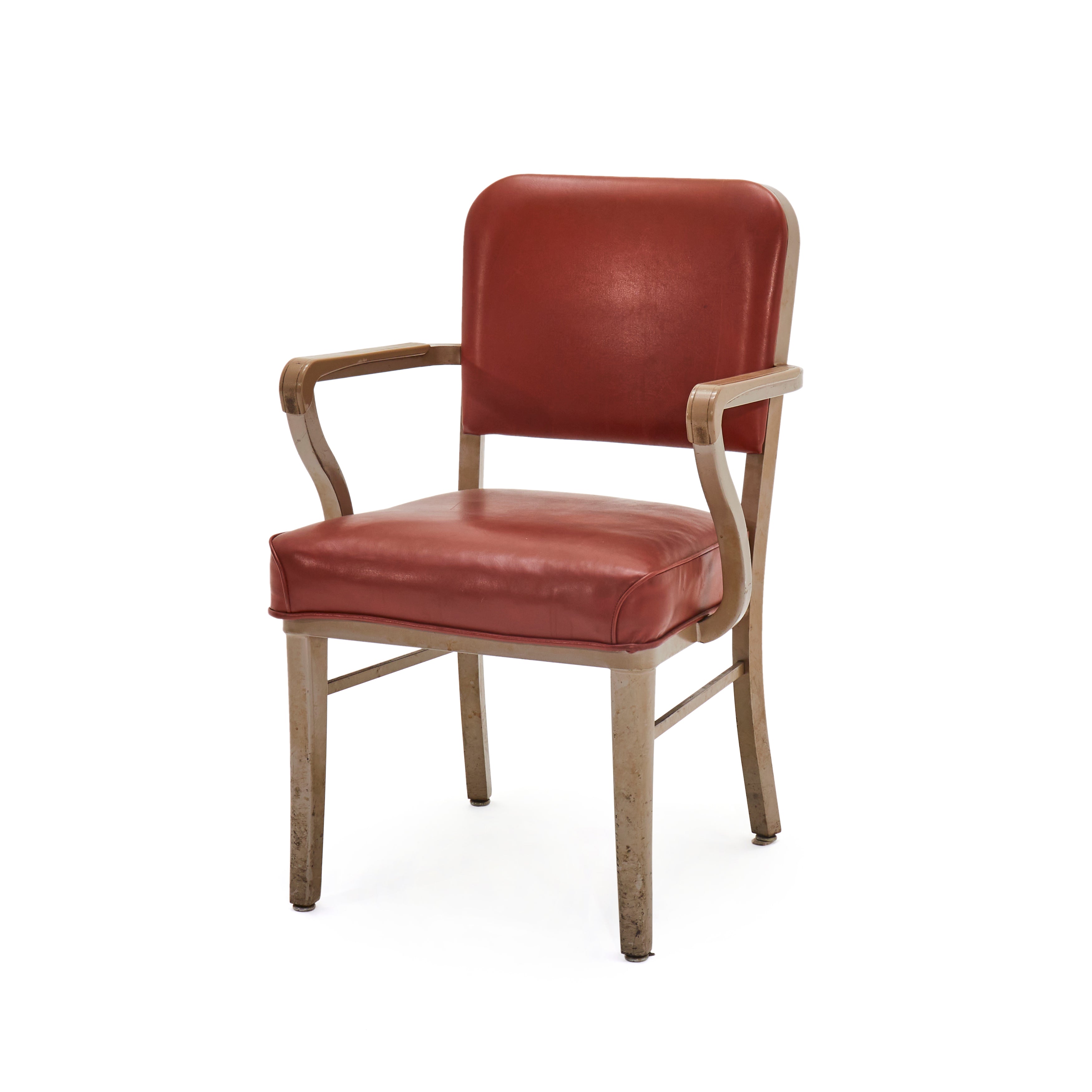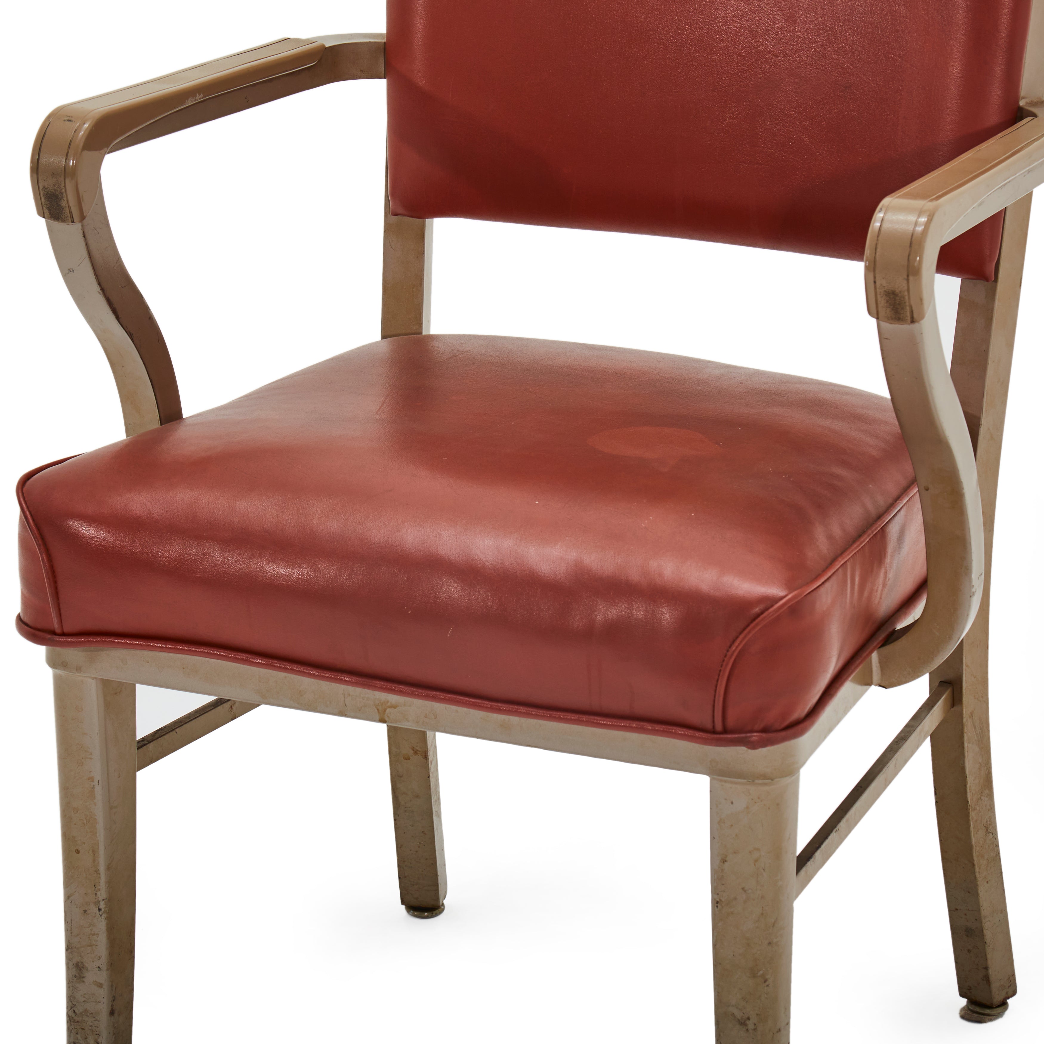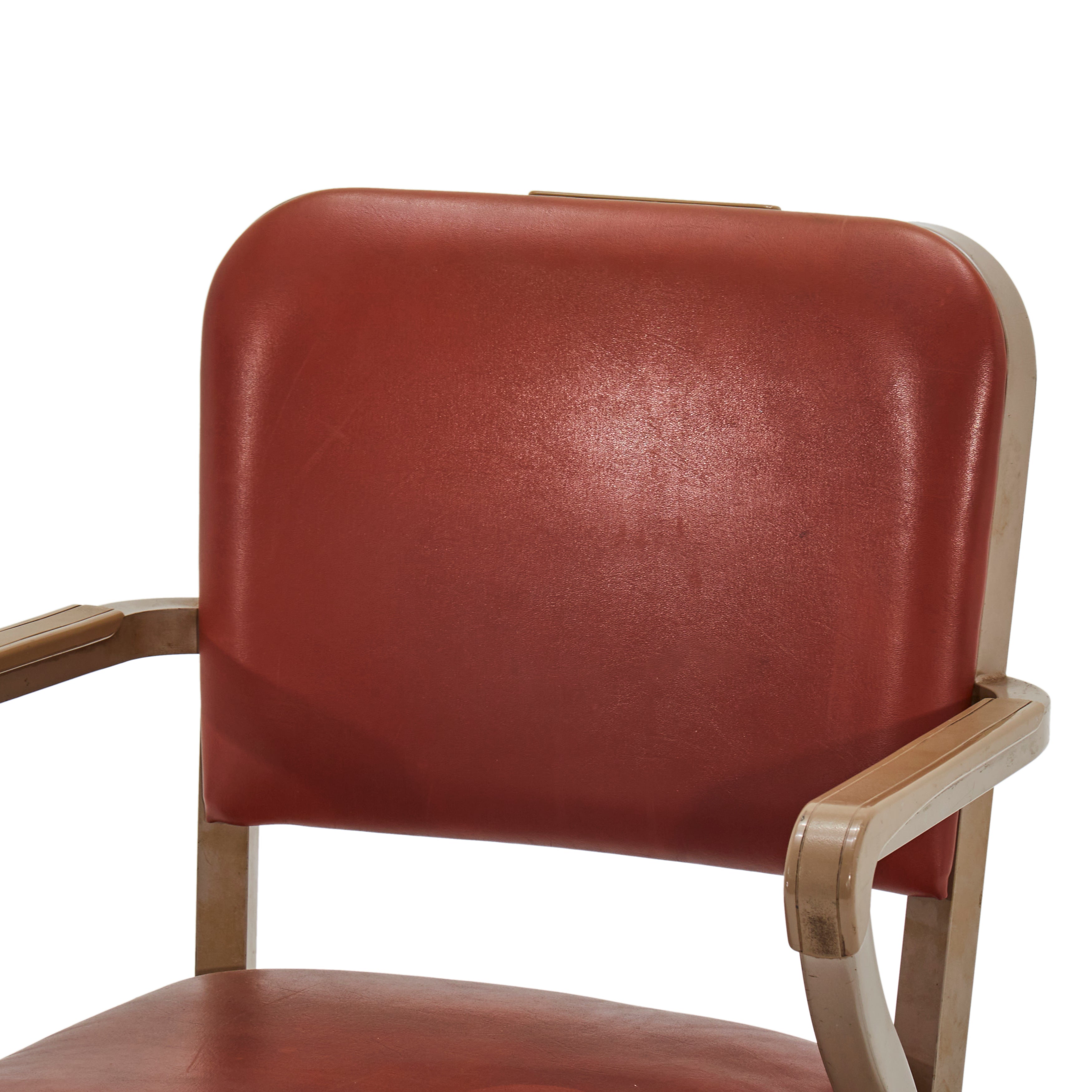Details: 1980's corporate black armchair with a foam-padded wraparound armrest in addition to a separate foam-padded lower back rest, with a vinyl upholstered seat cushion...