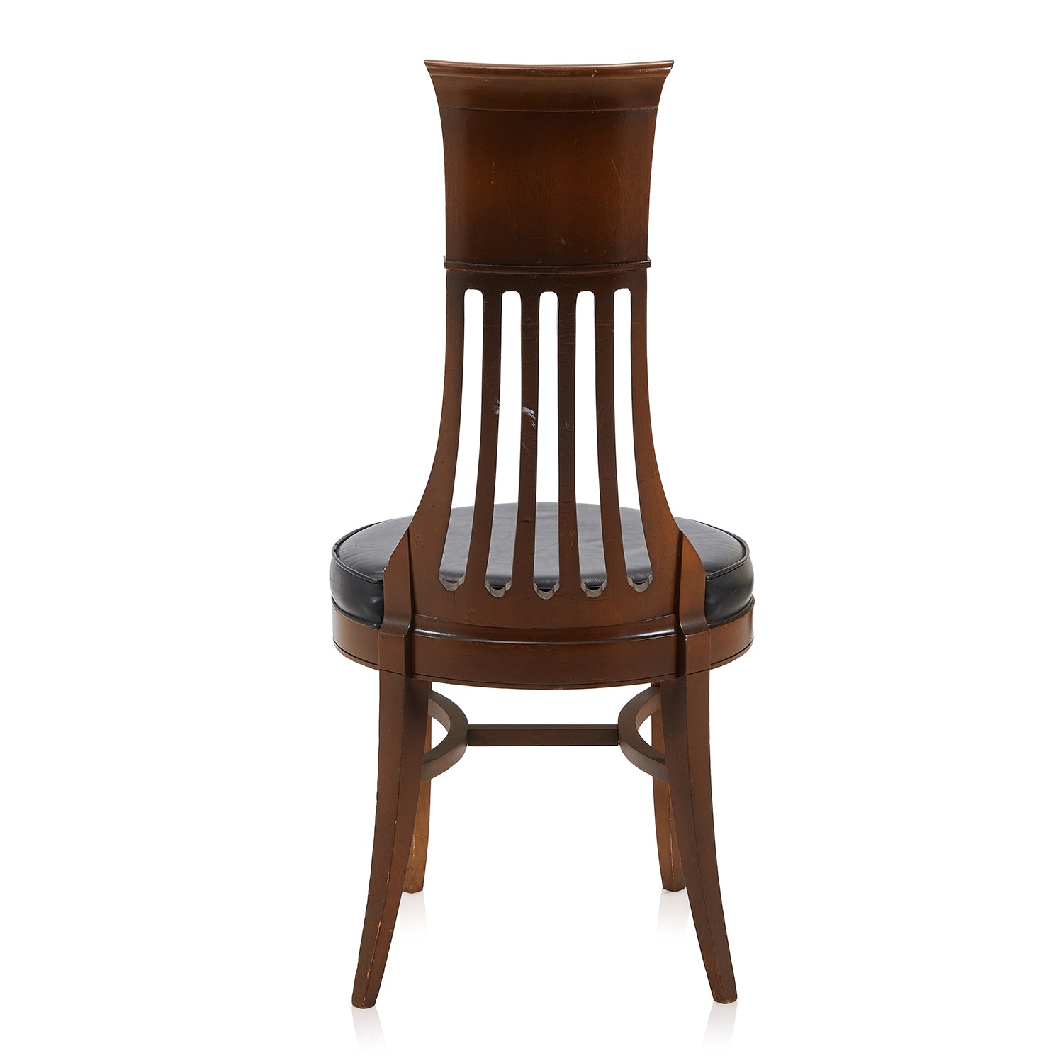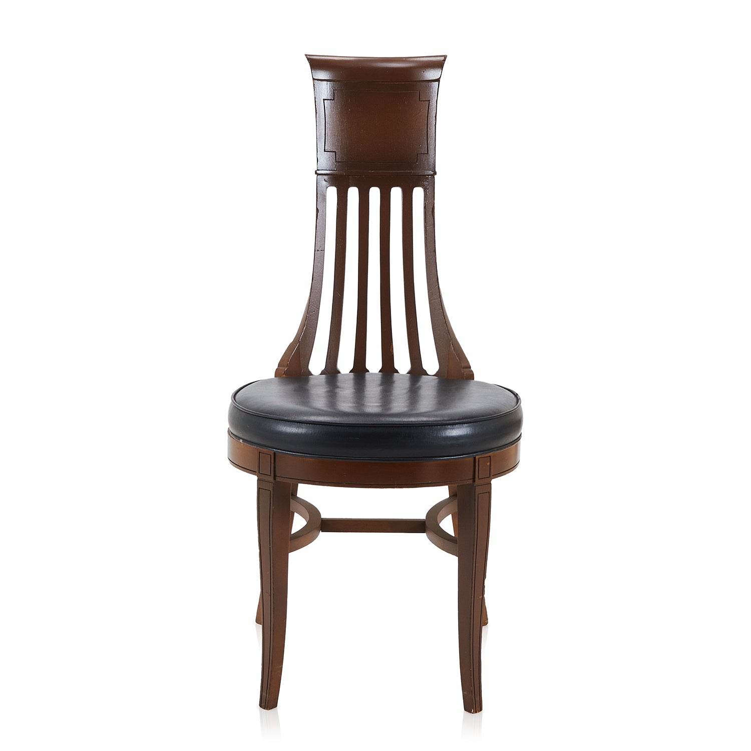 Details: Wooden dining chair with a green leather upholstered seat and a harp or lyre carved in the backrest Dimensions: 33.5" H x 16" W...