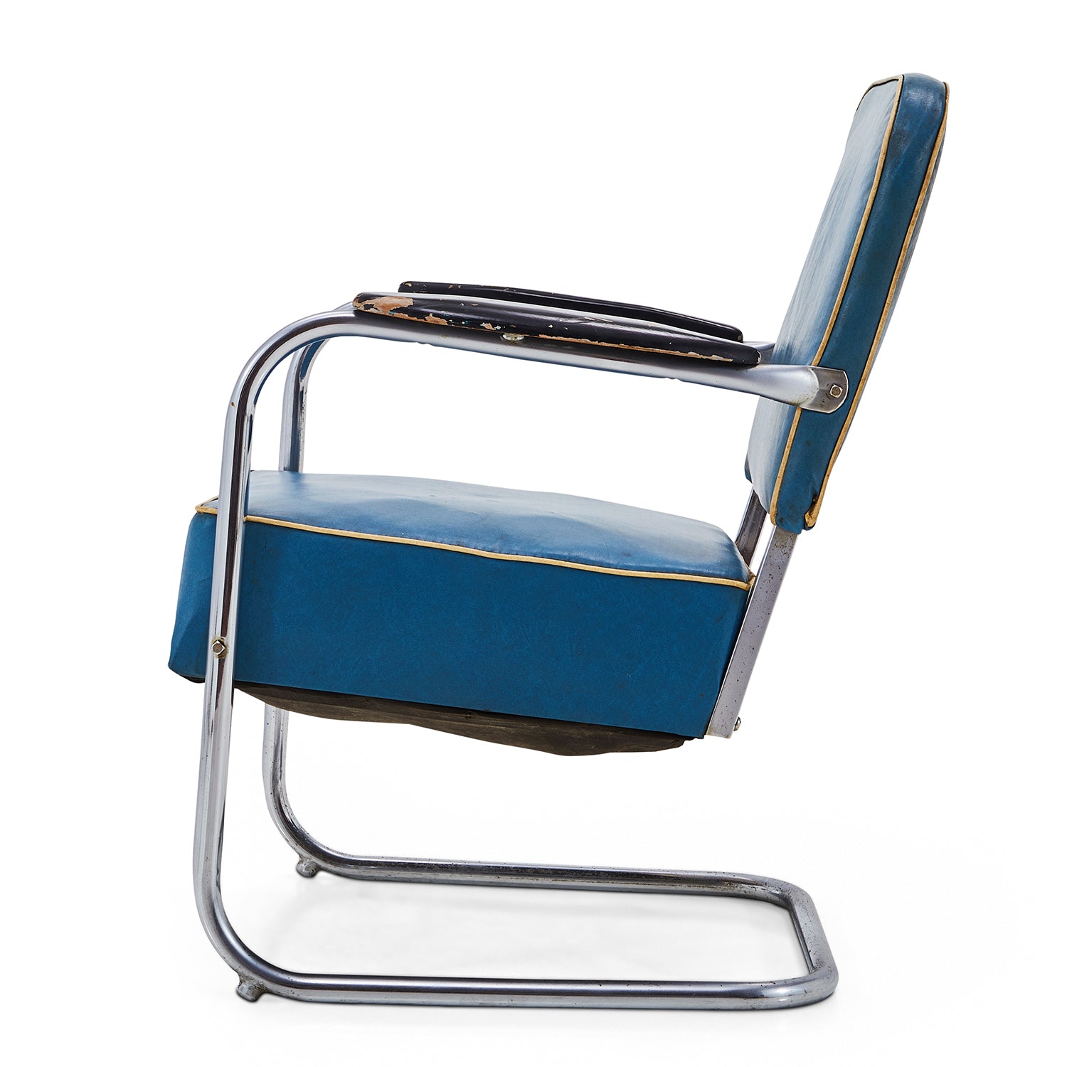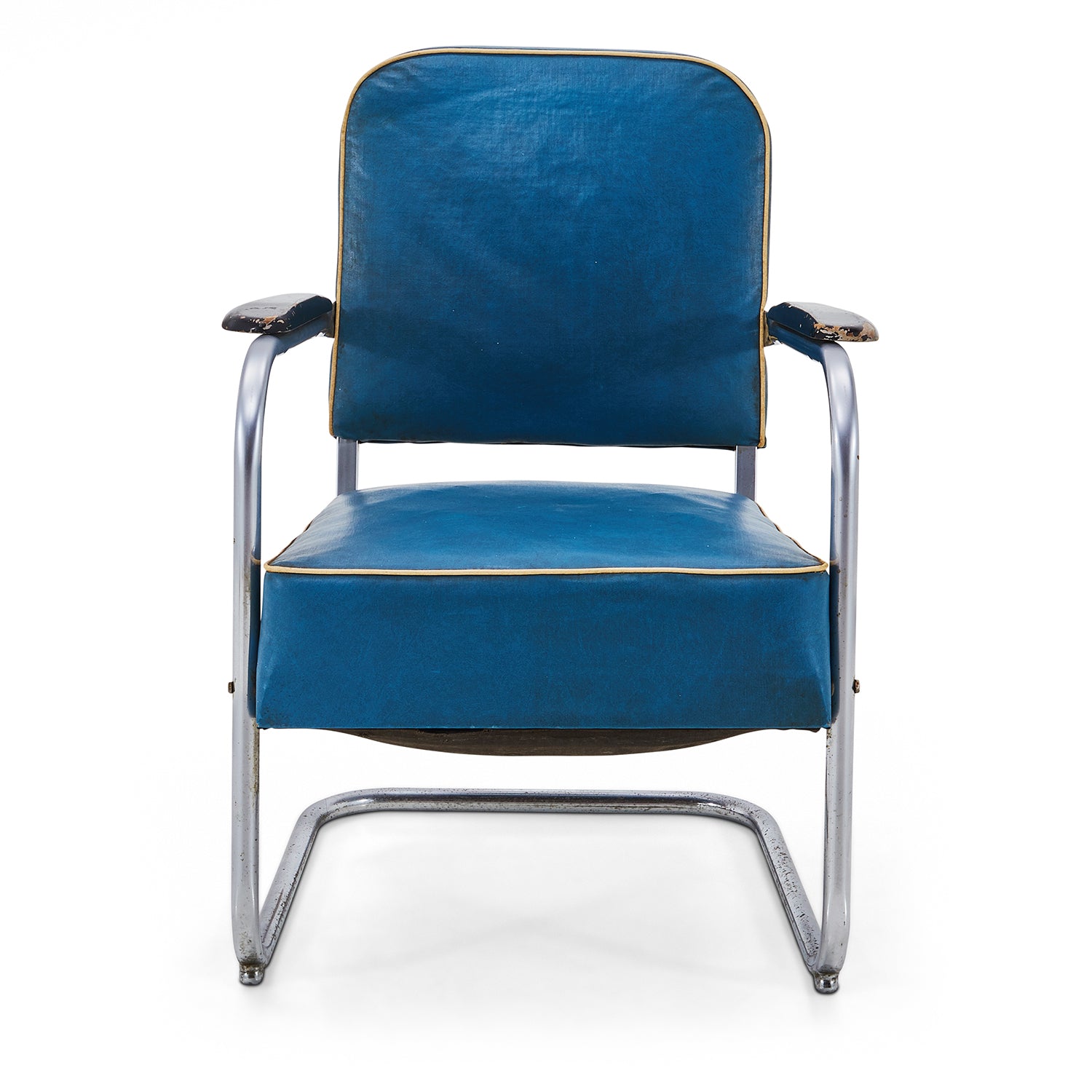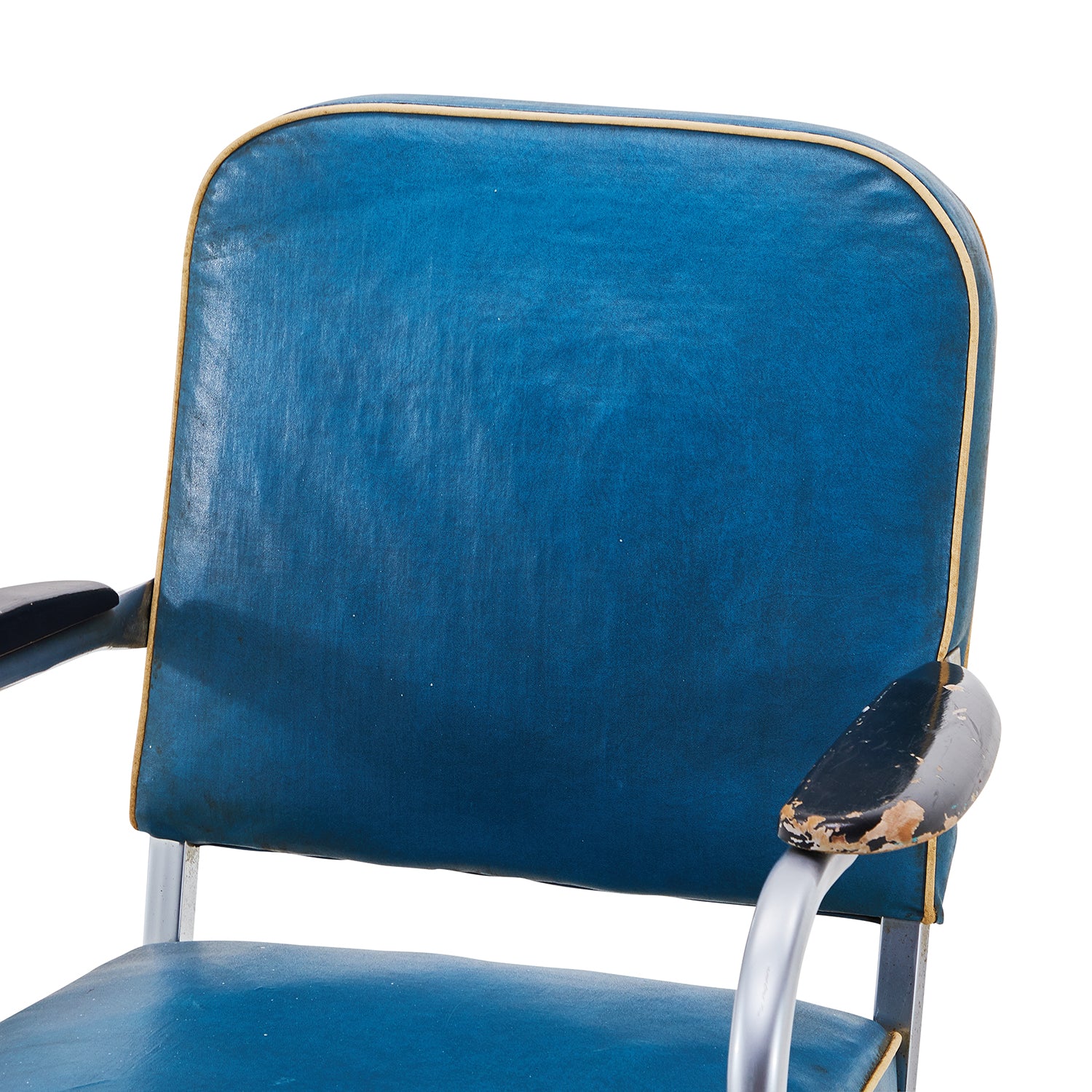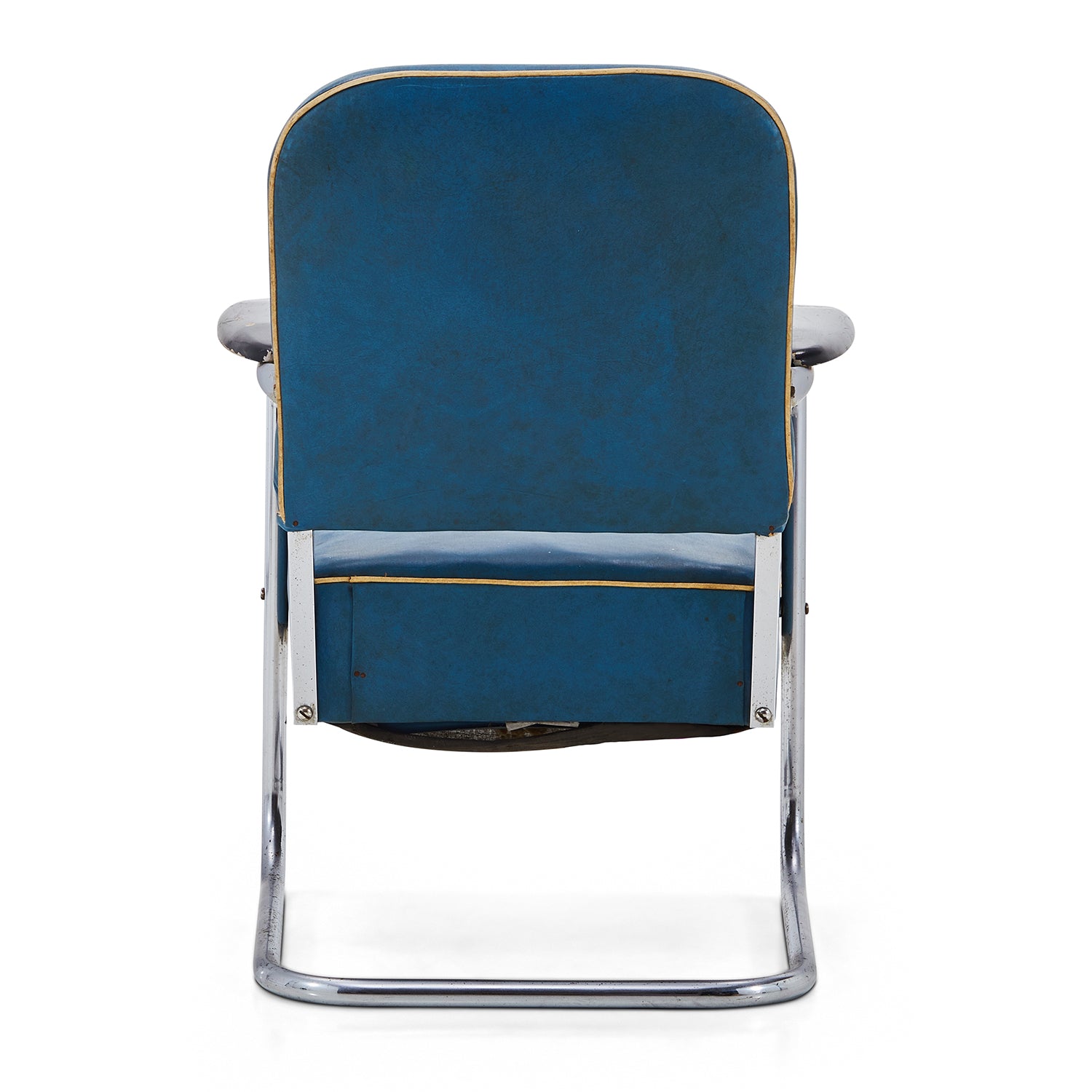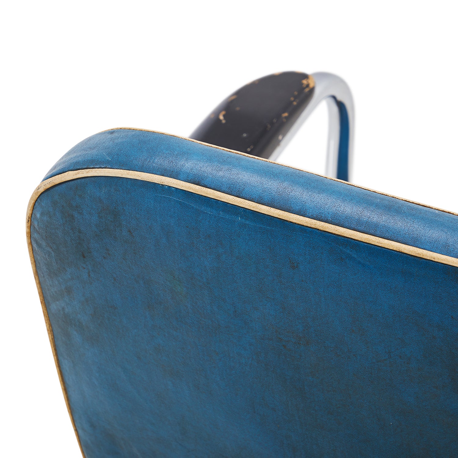 Details: Vintage machine-age armchair with a chrome continuous frame and large blue vinyl seat and back rest Dimensions: 33" H x 24" W x 25"...