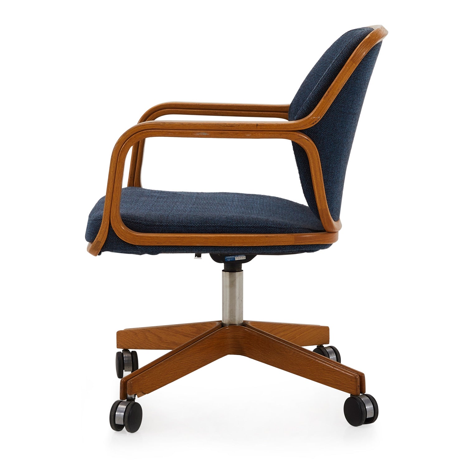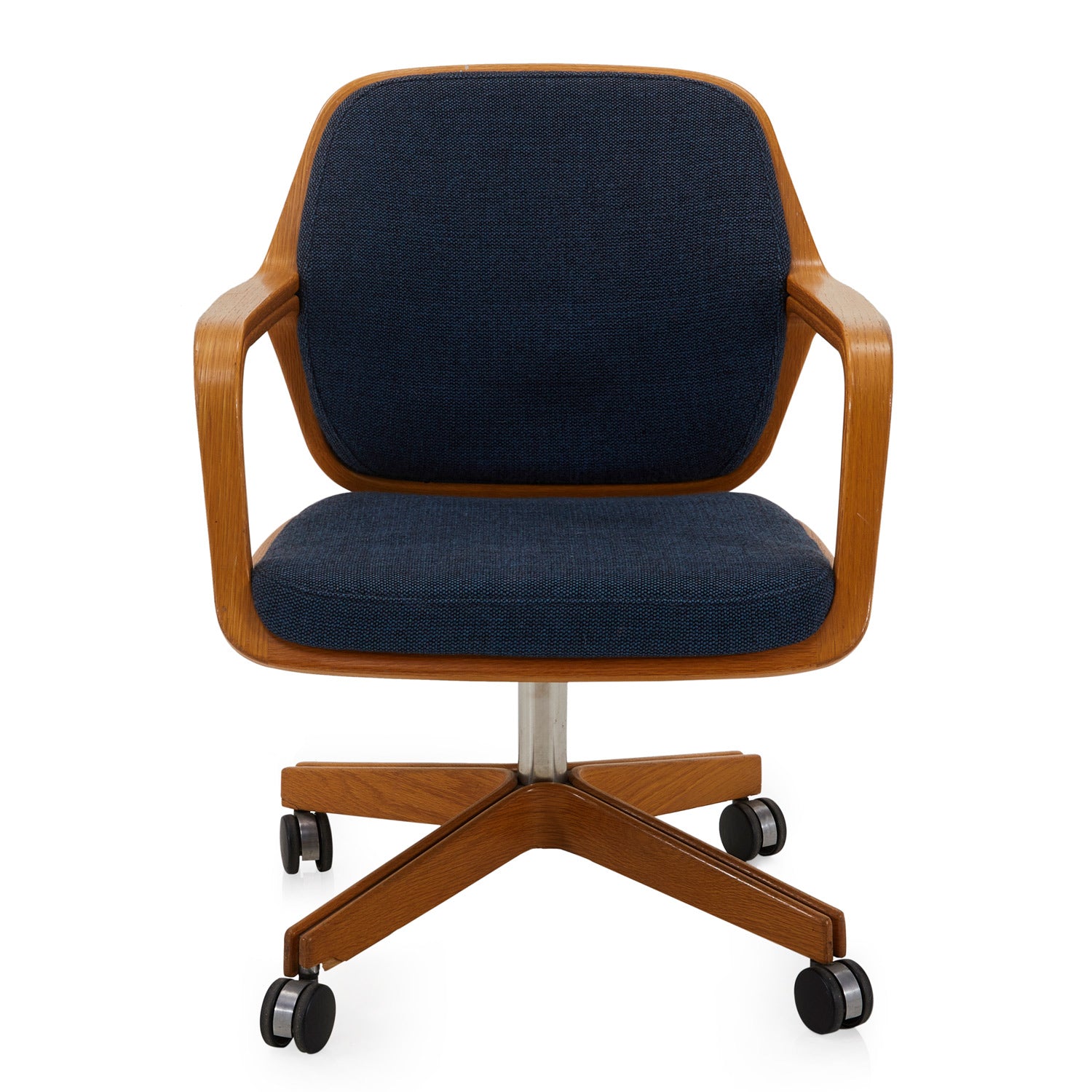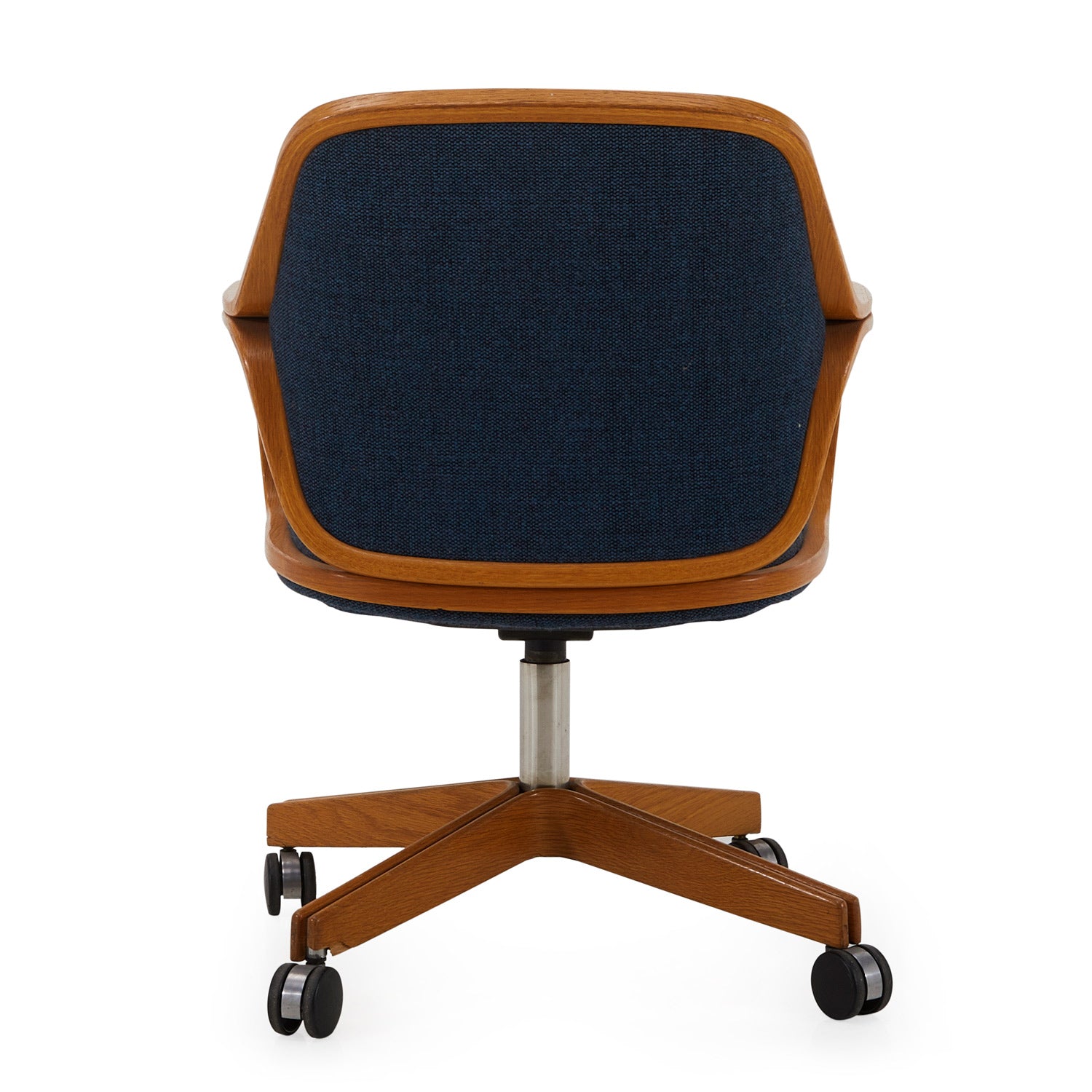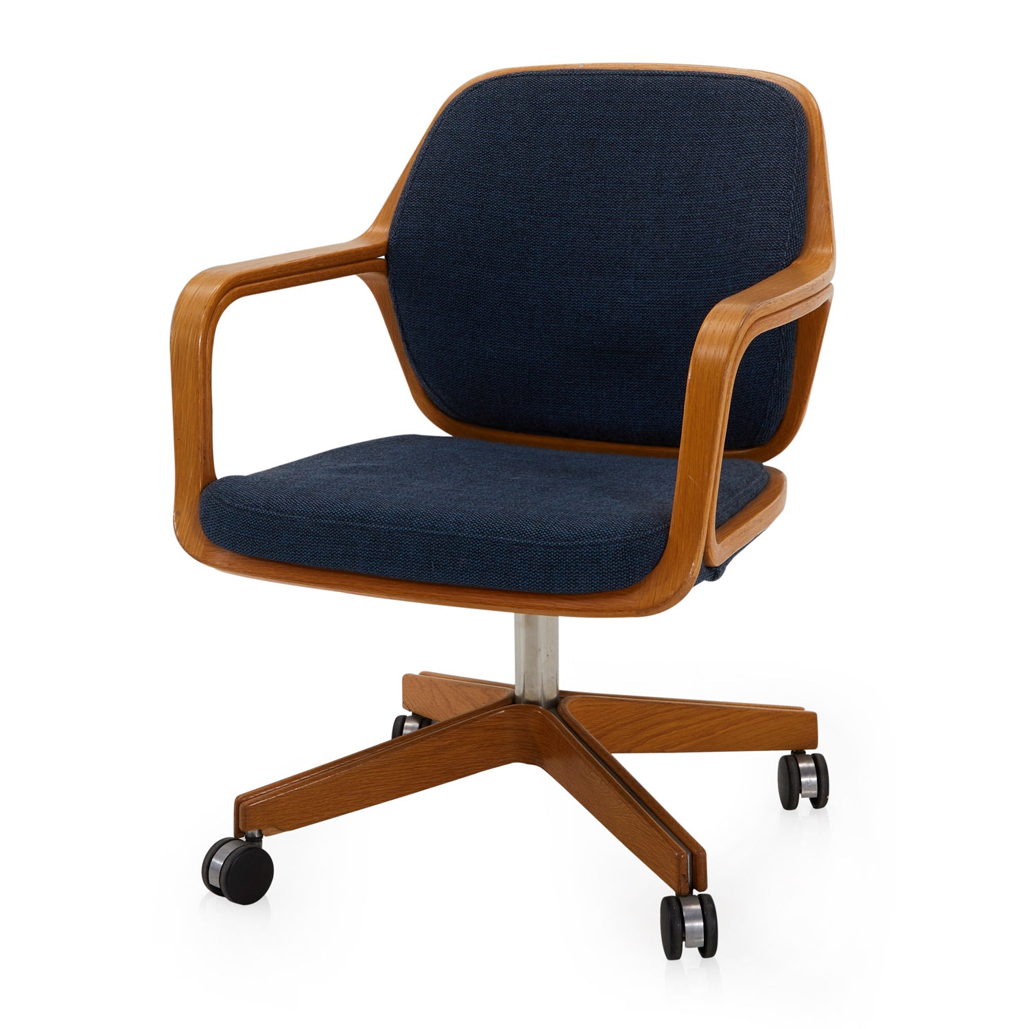 Details: Office chair with wooden frame, blue fabric upholstery, swivel base and wheels