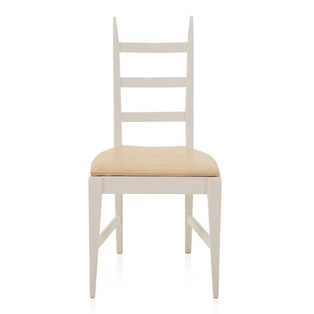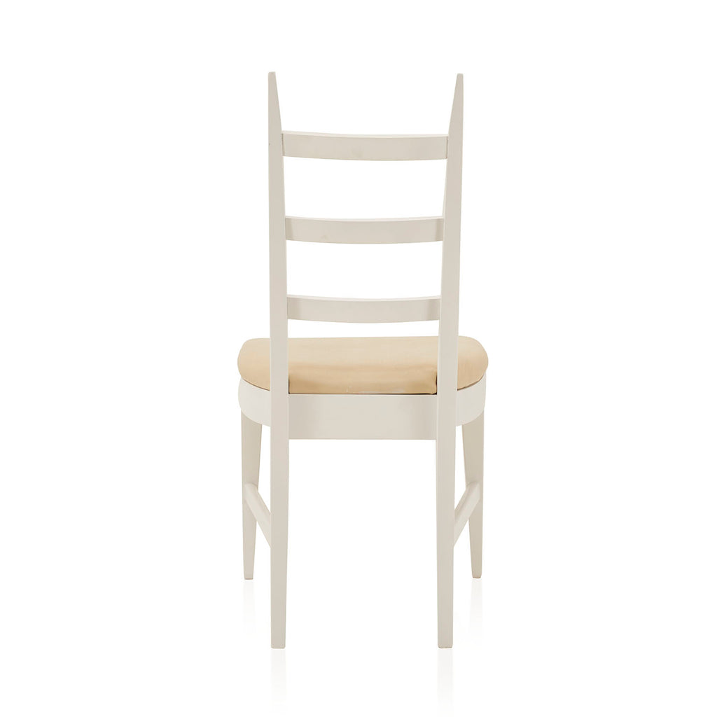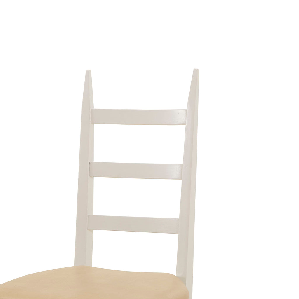 Details: White Ladder Back Dining Chair with off-white vinyl seat cushion