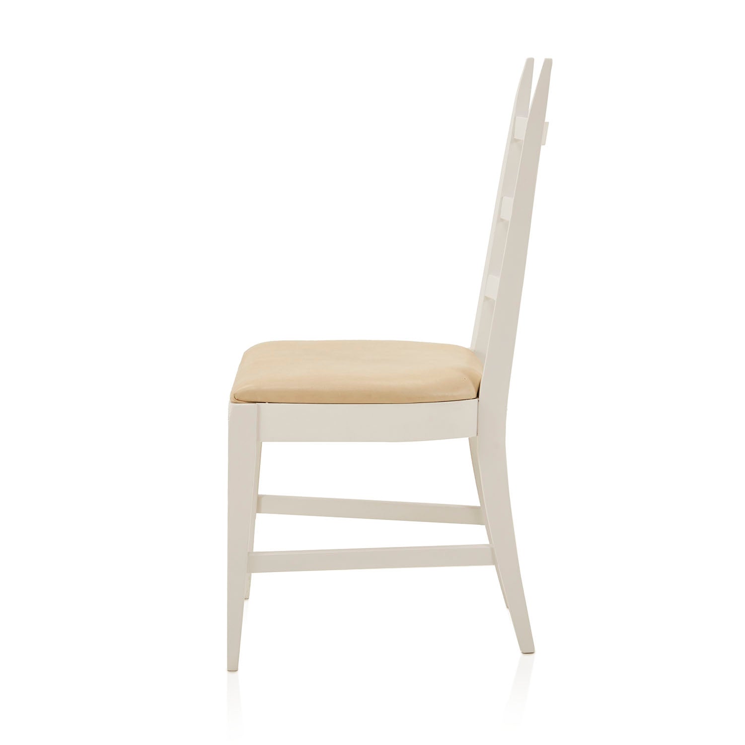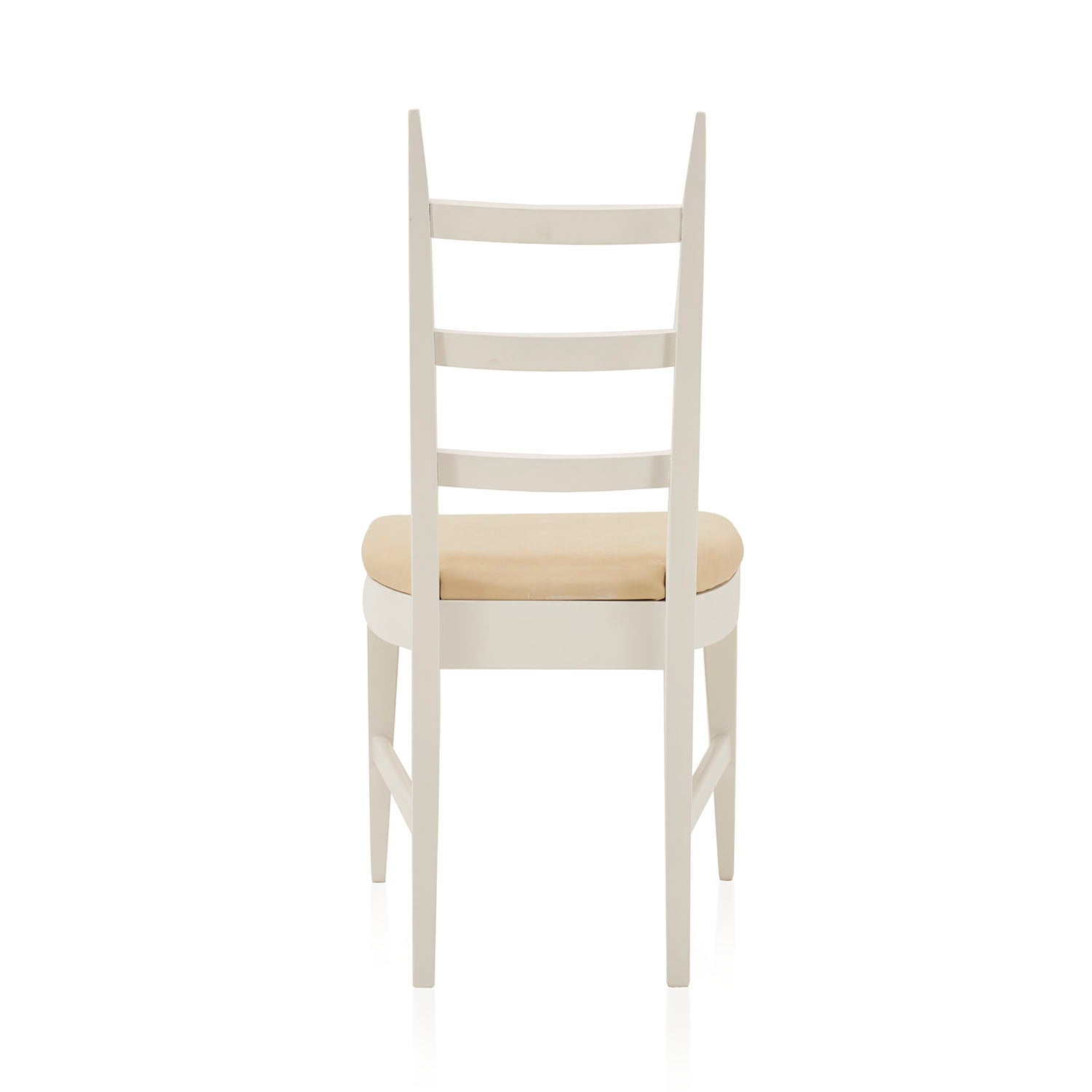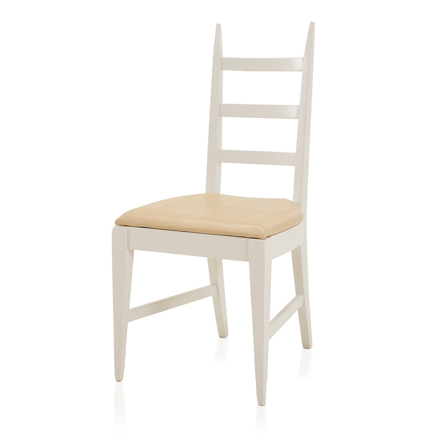 Details: White Ladder Back Dining Chair with off-white vinyl seat cushion