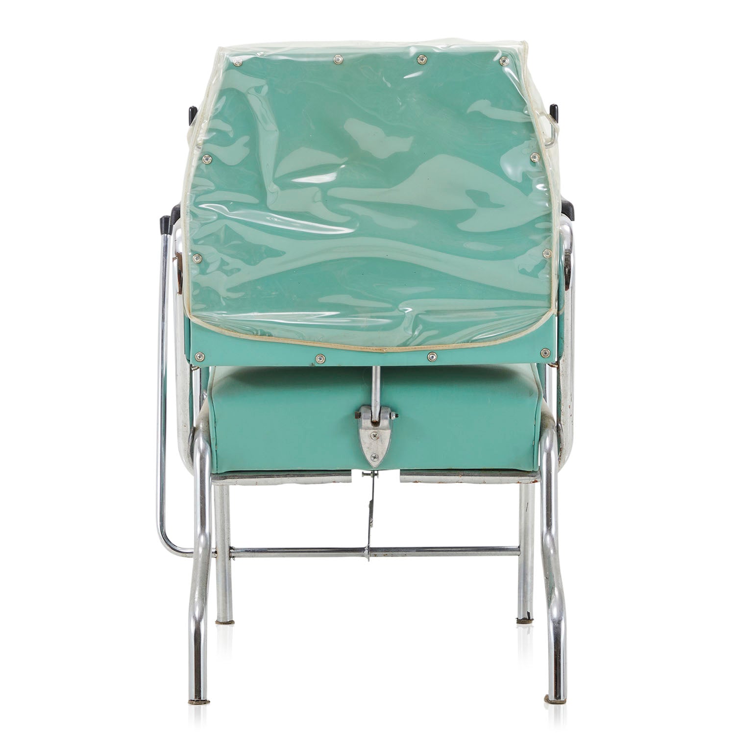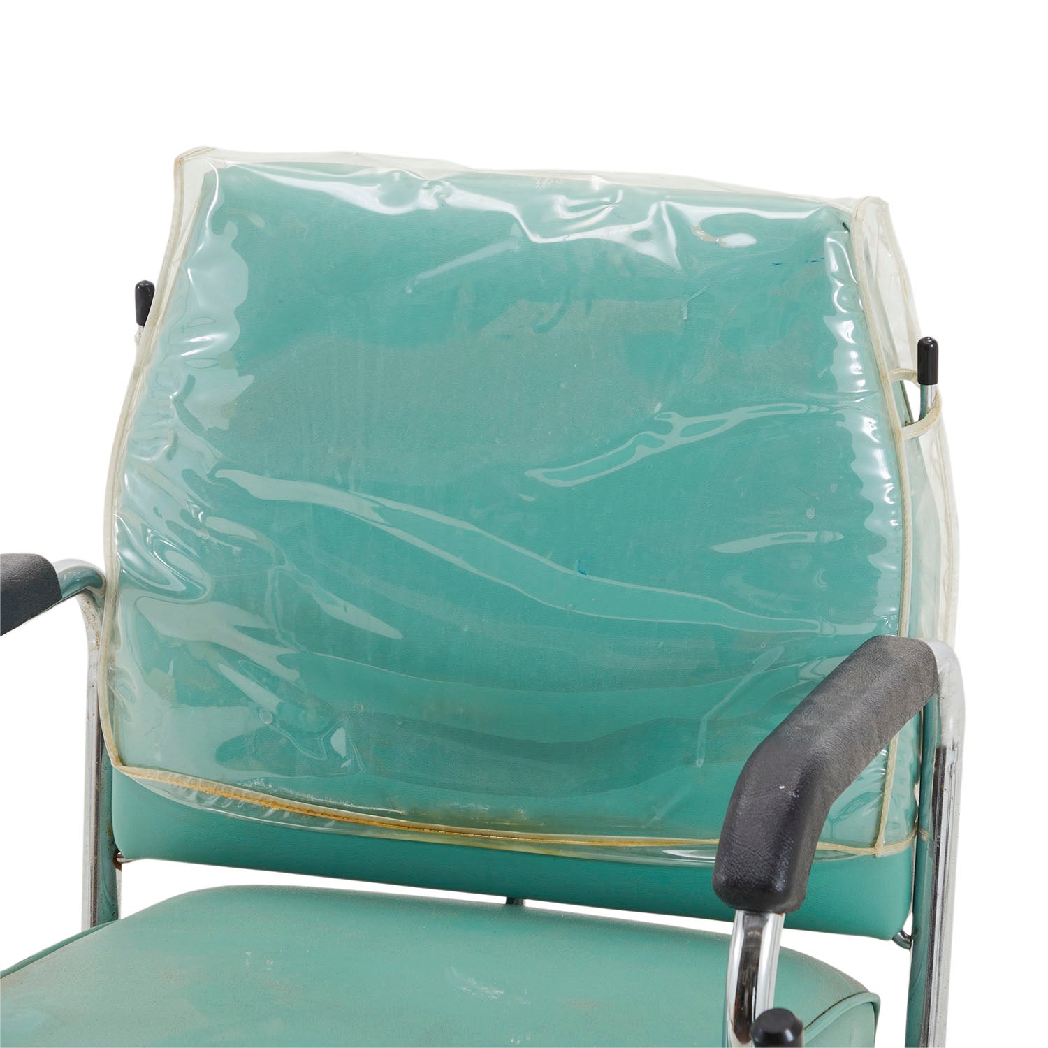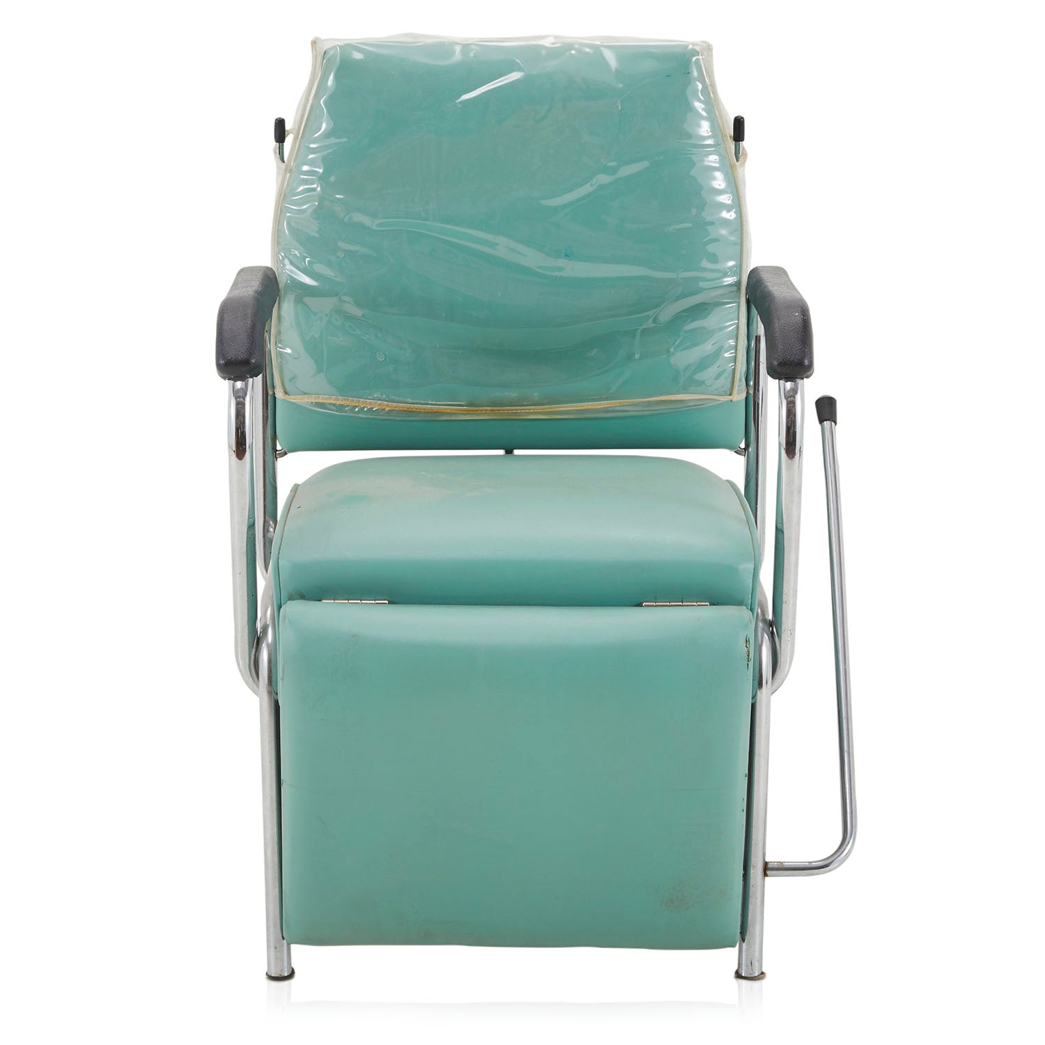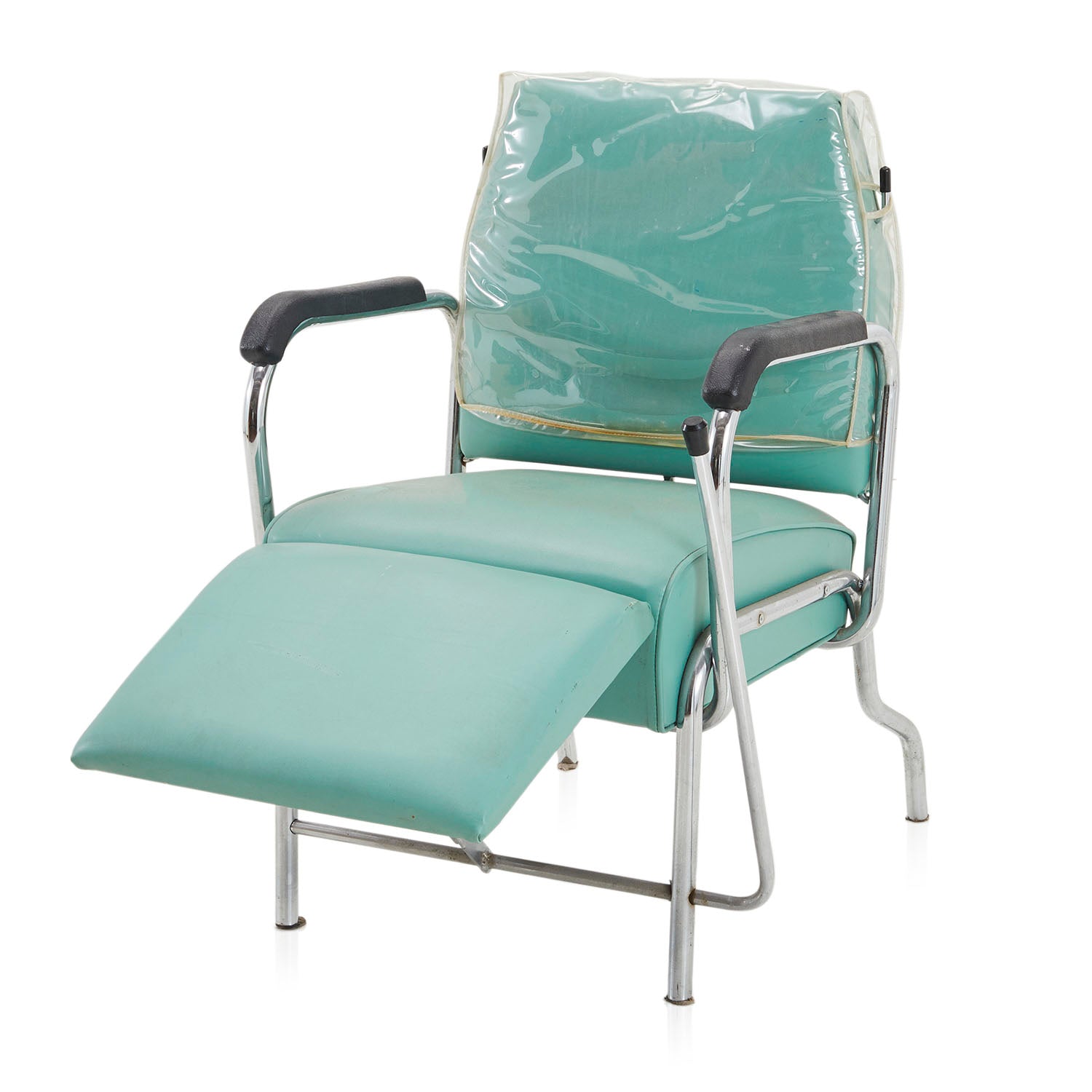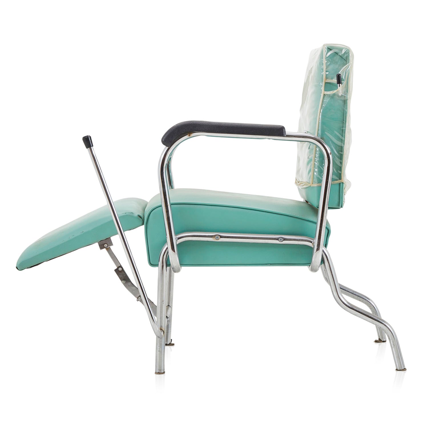 Details: Armchair with mint green vinyl cushions, chrome frame and adjustable leg rest Dimensions: 36" H x 25" W x 30" D Quantity: 2