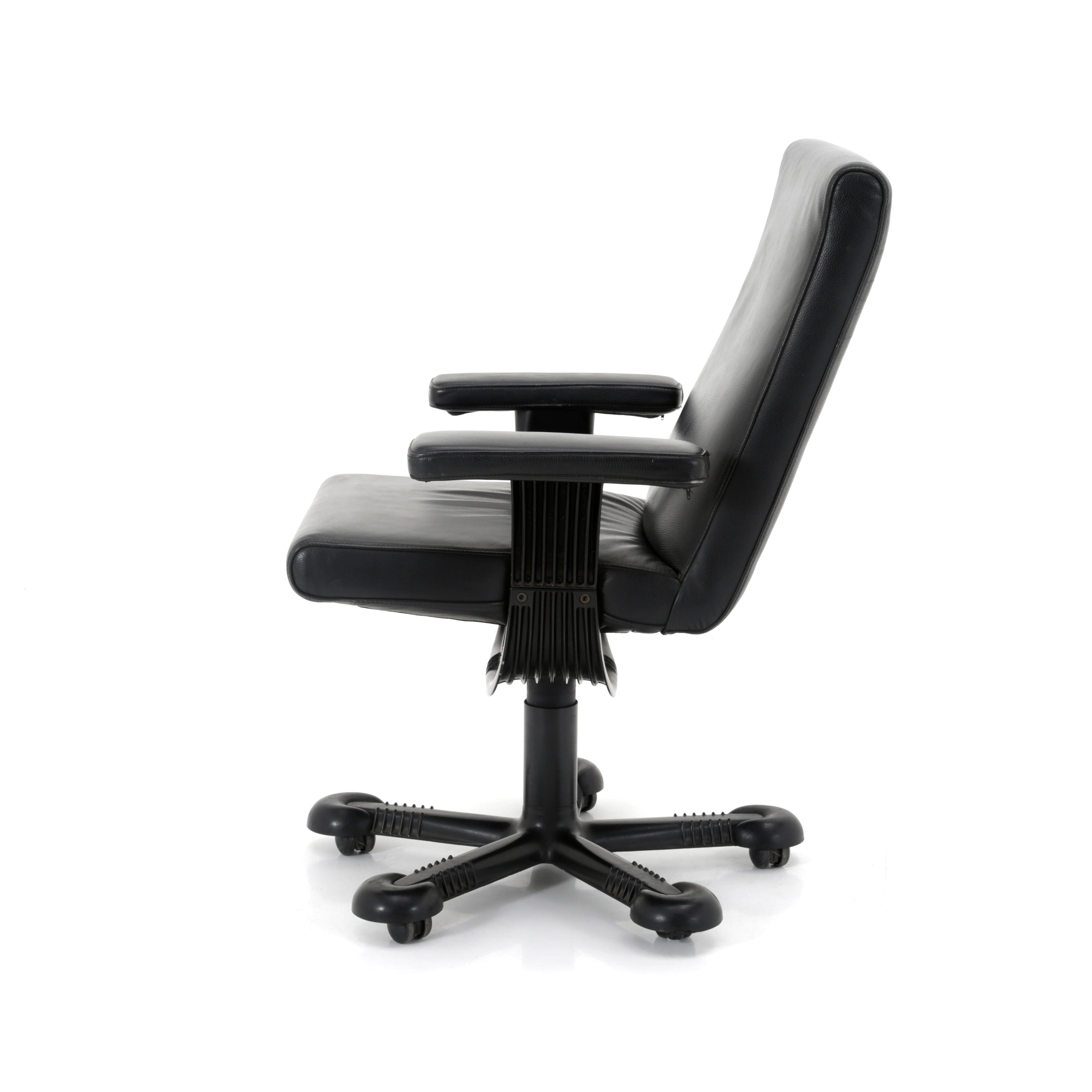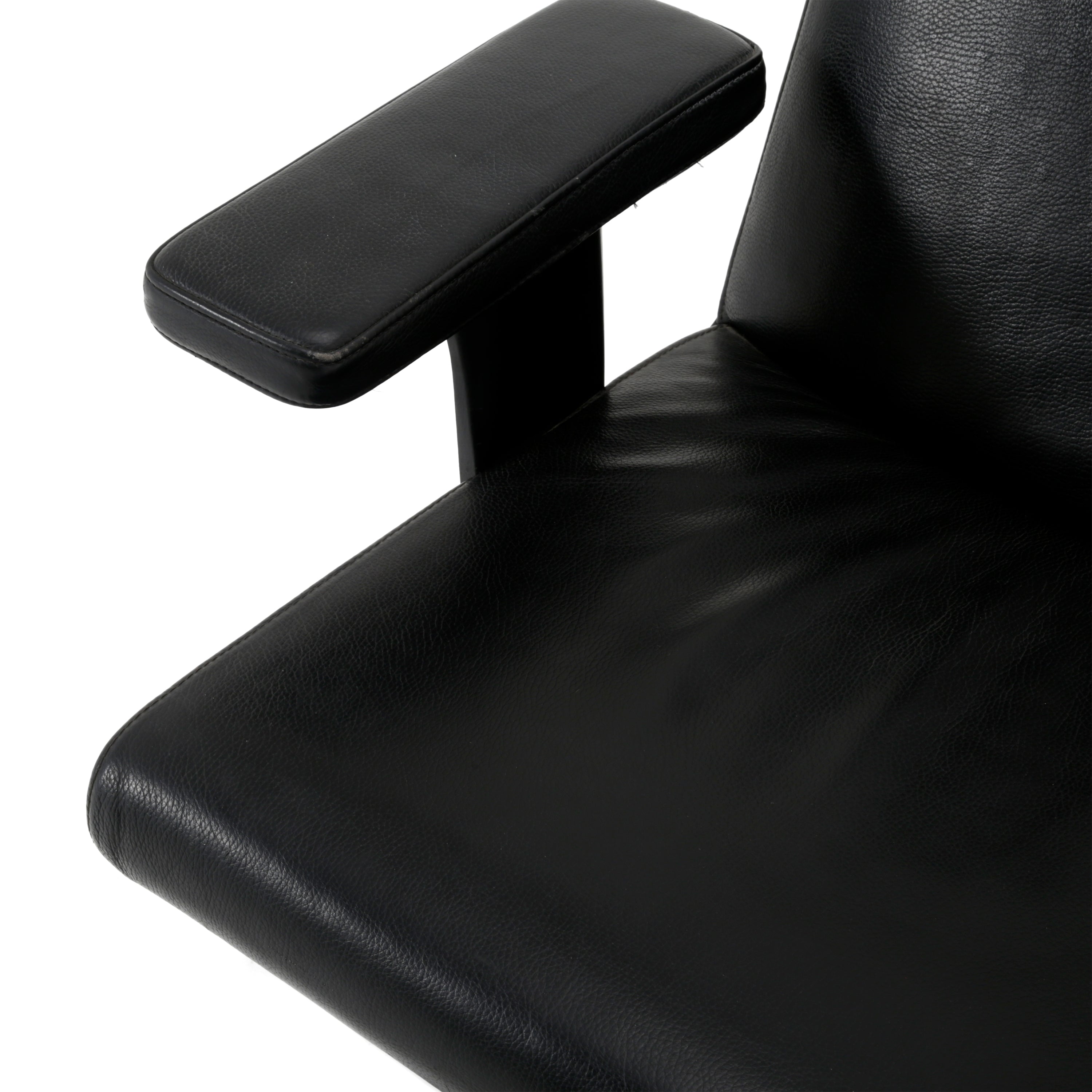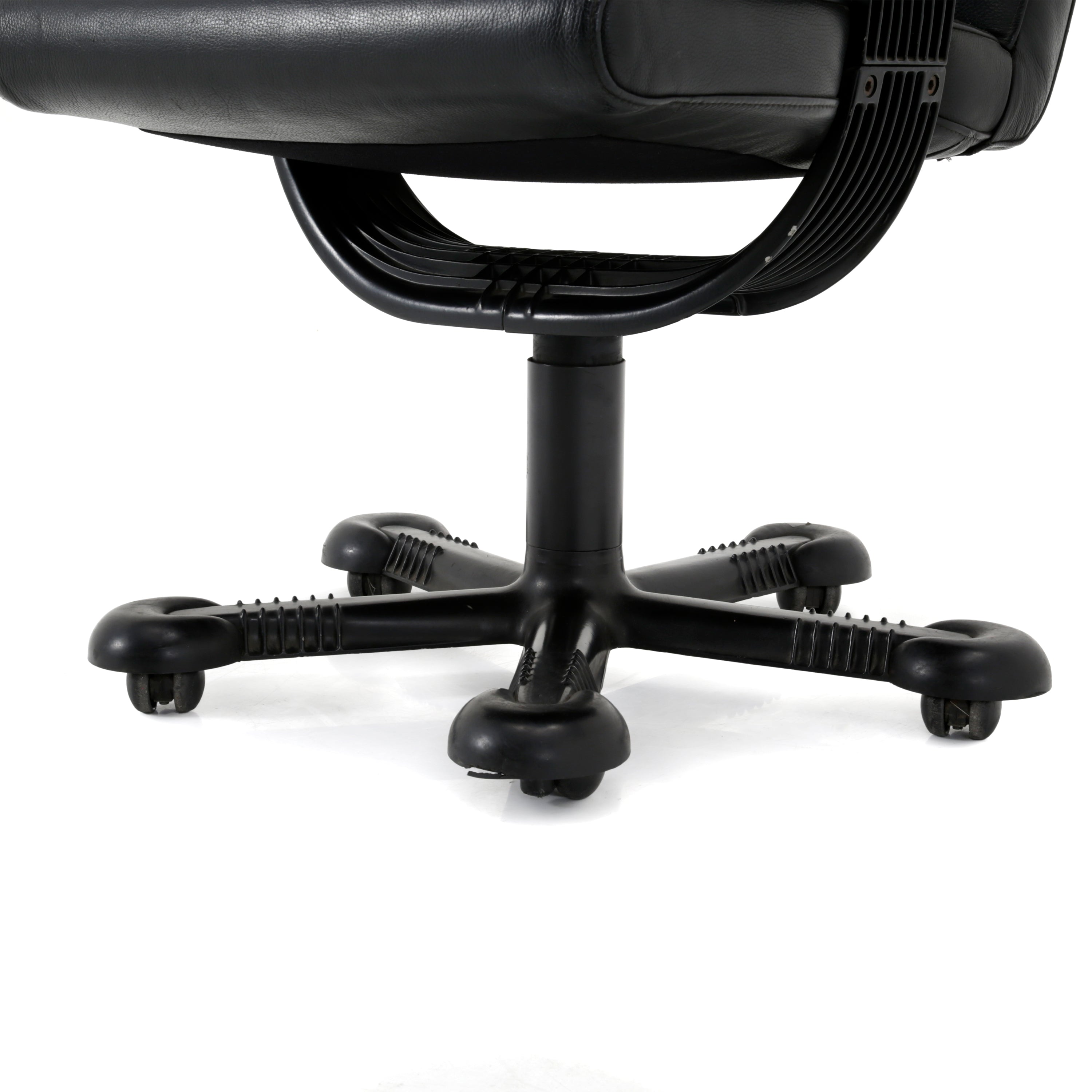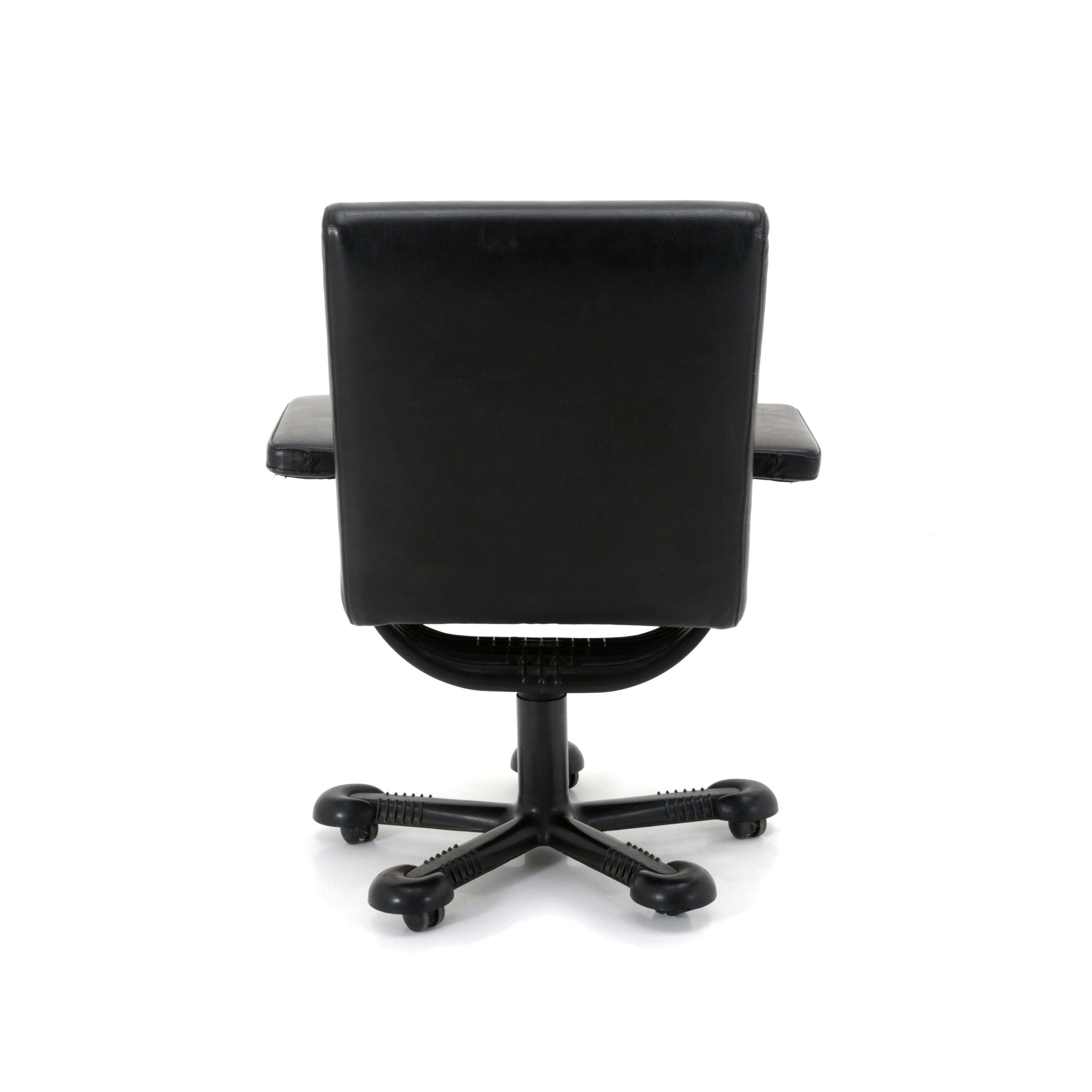 Details: Mid-century executive office chair with a bentwood shell encasing black leather upholstered cushions in three distinct segments Dimensions: 45" H x 31" W x...