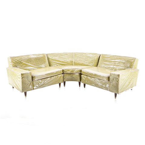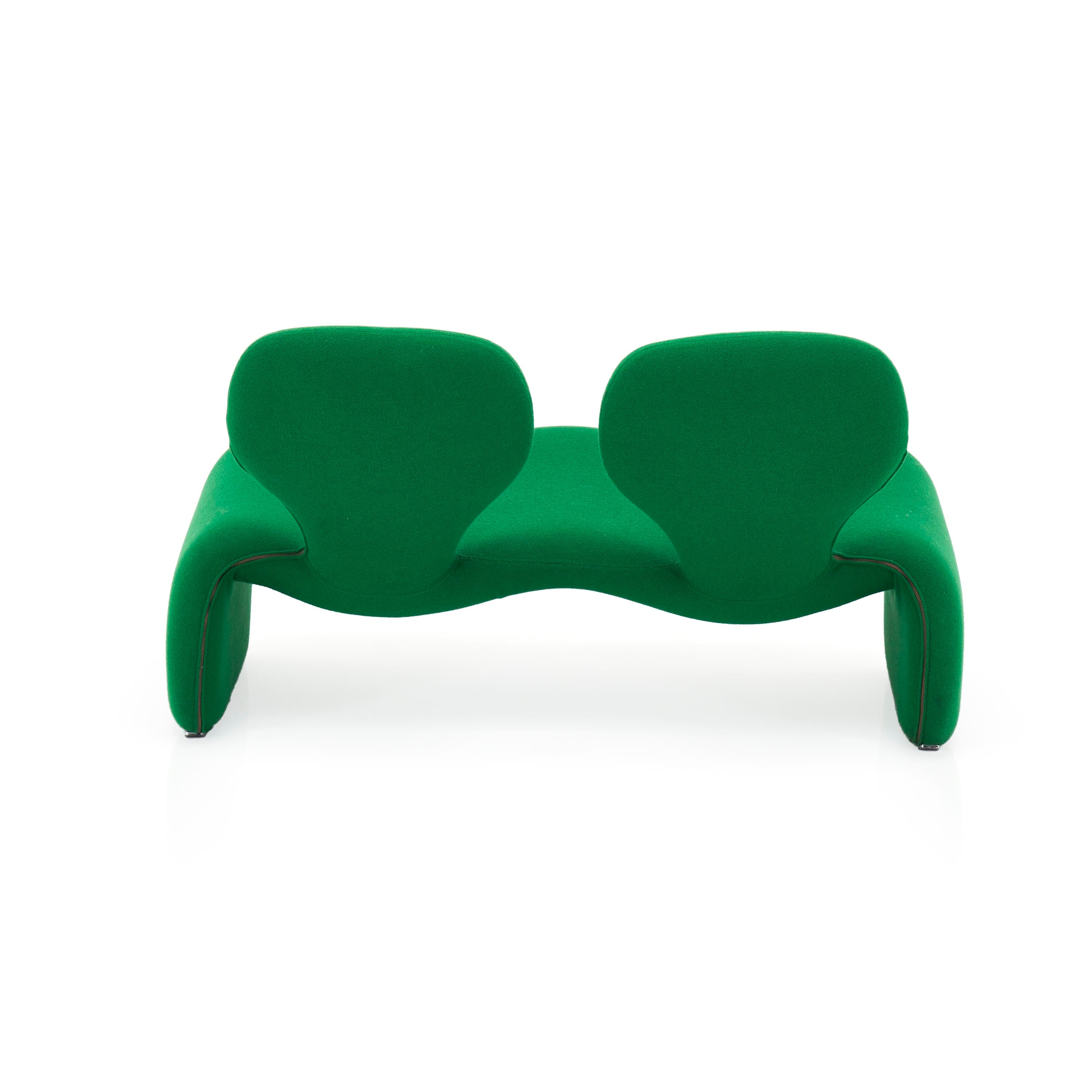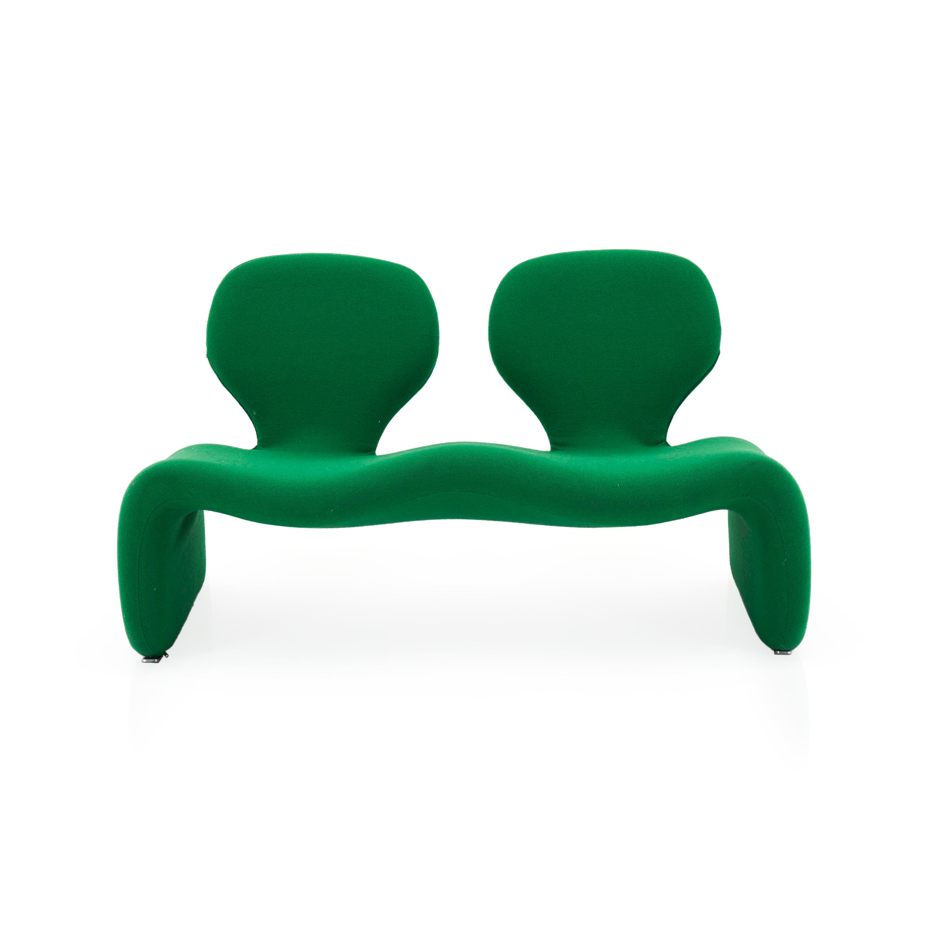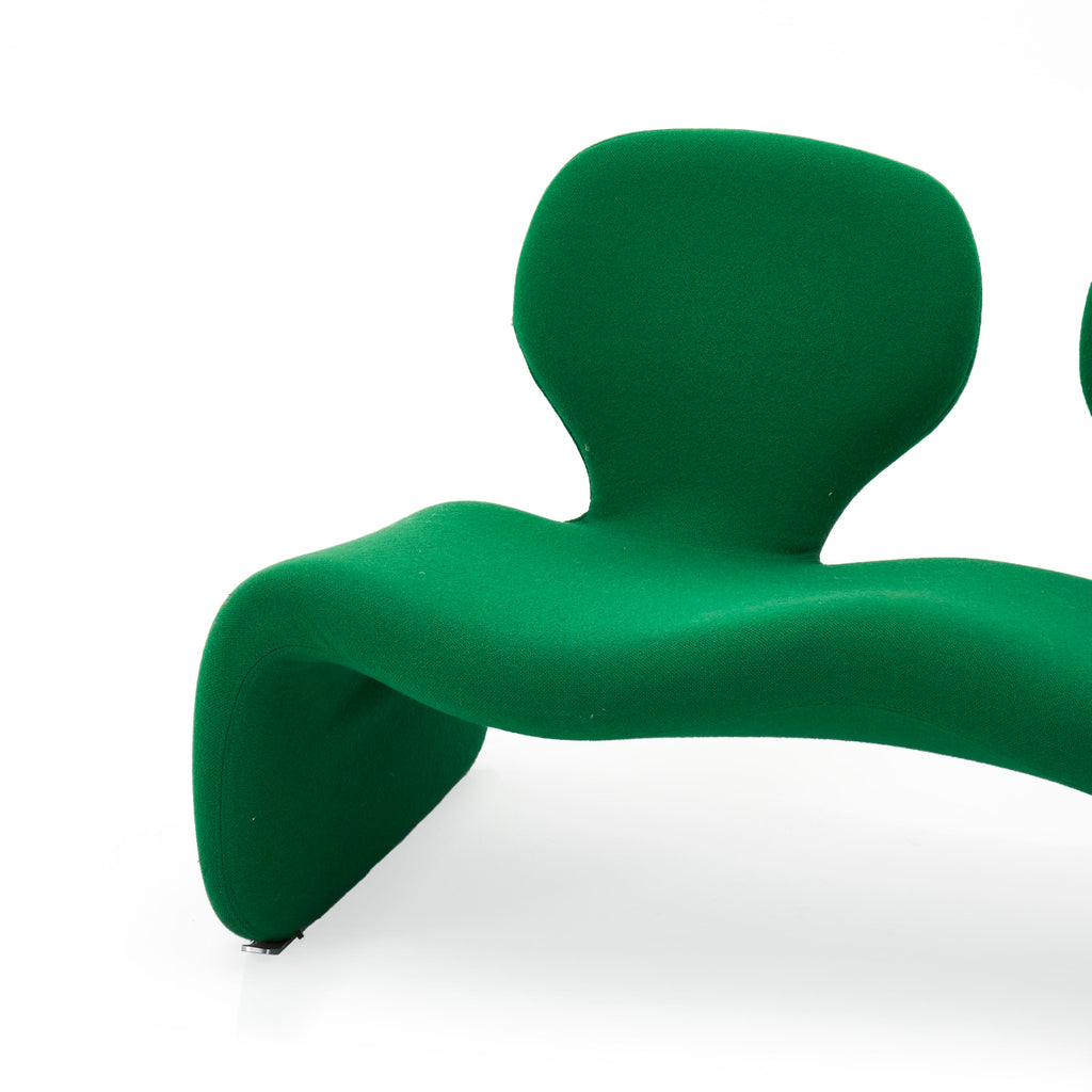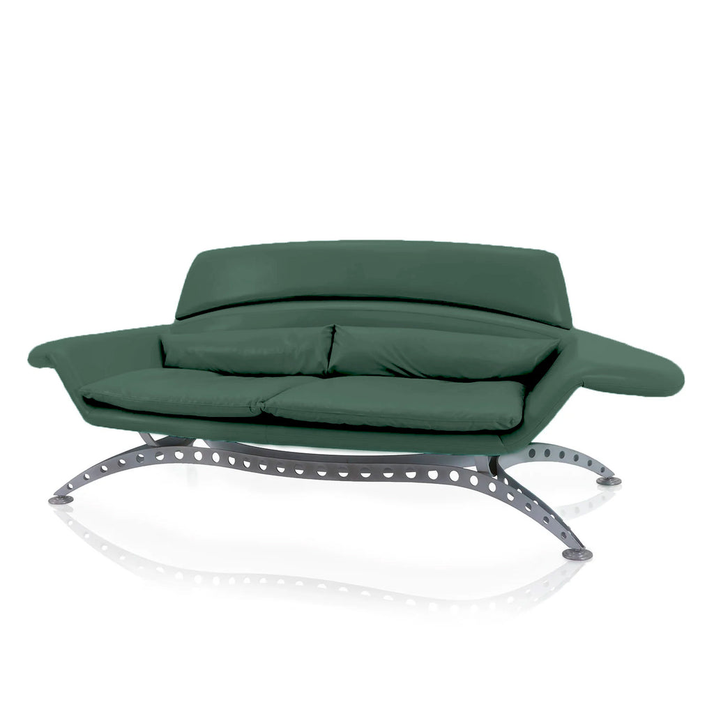 Details: Curved green futuristic lounge chair with rounded grey metal base. Piece is constructed of leather upholstery, with polished metal legs. Dimensions: 36" H x 88"...