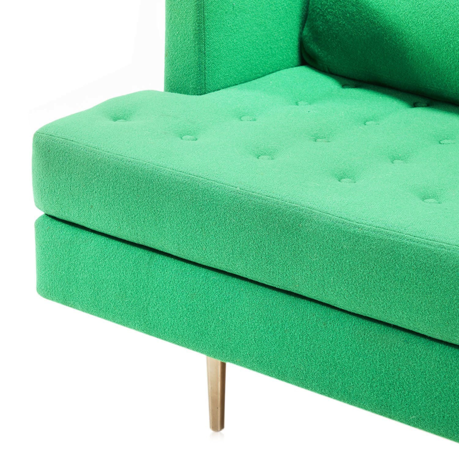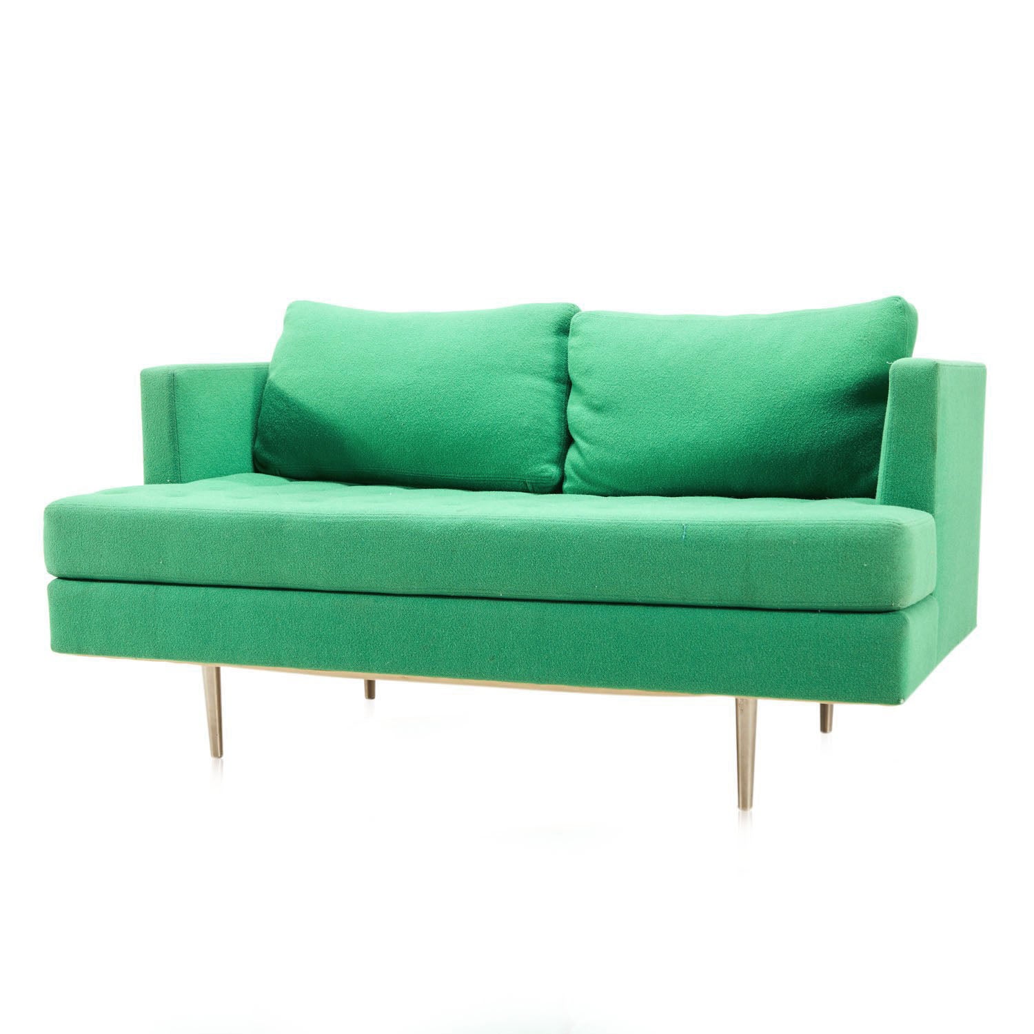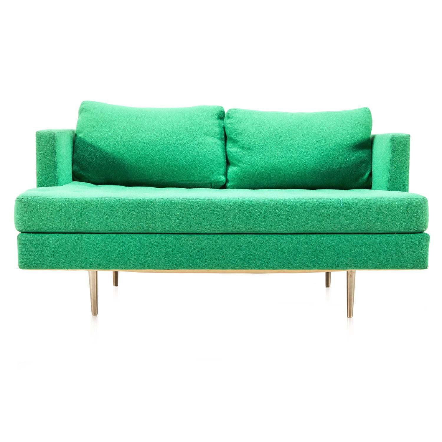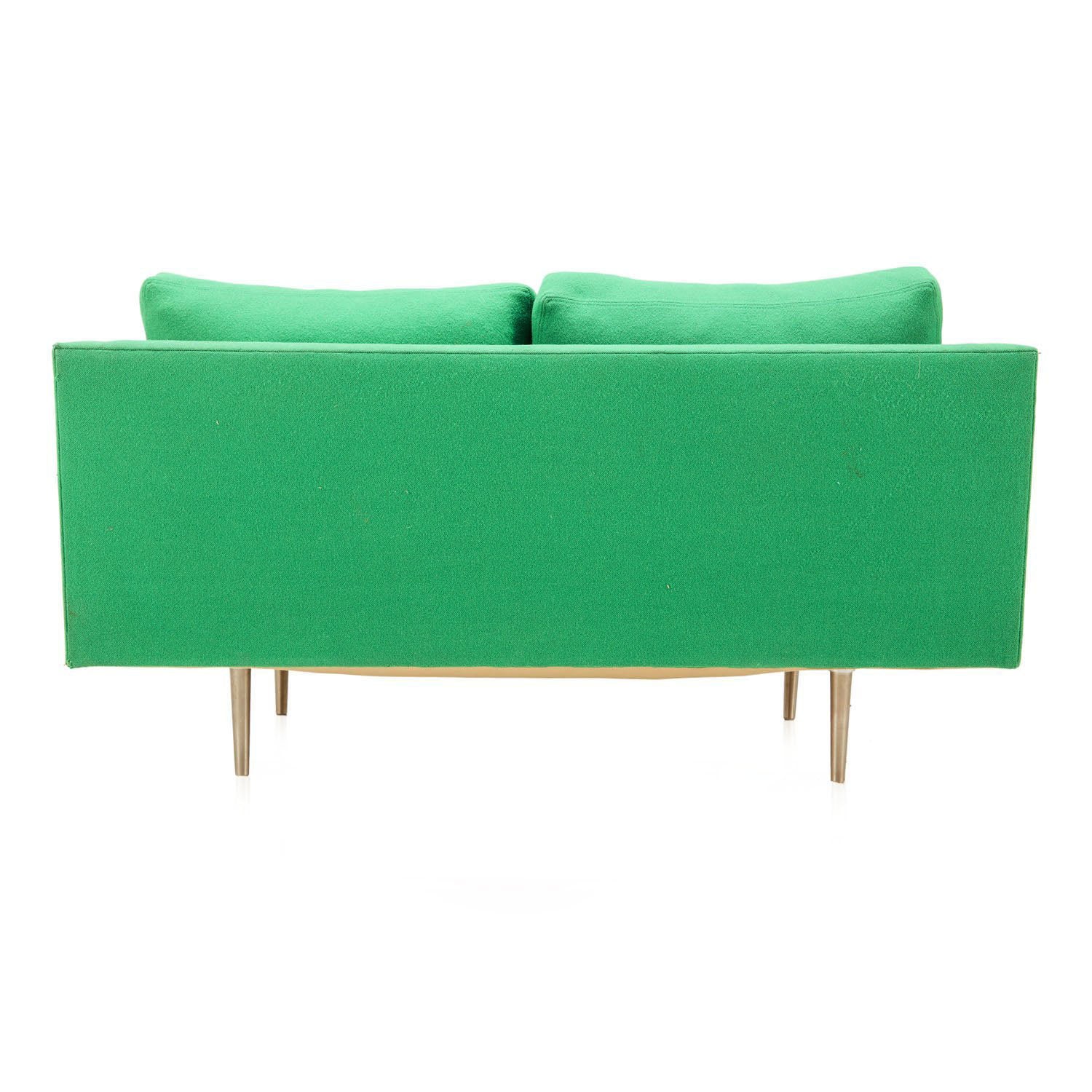 Details: Green upholstered loveseat with metal legs Dimensions: 33" H x 50" W x 36" D