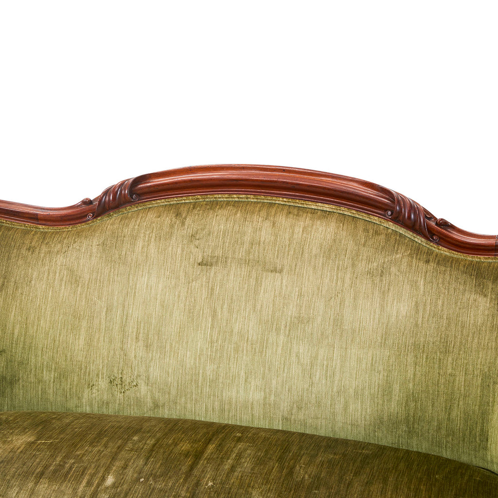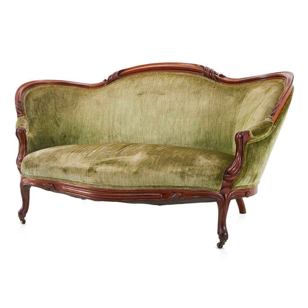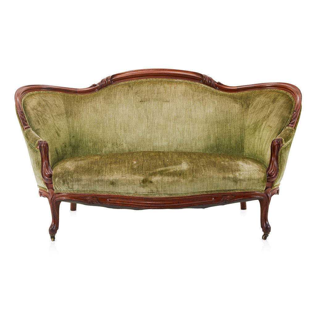 Details: Vintage distressed brushed velvet, wood frame victorian small sofa on wheels Dimensions: 37" H x 68" W x 37" D