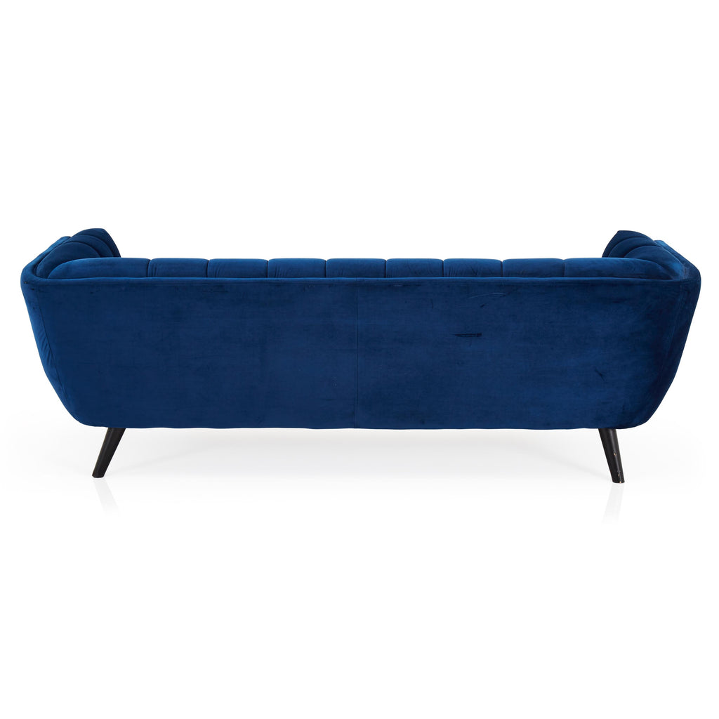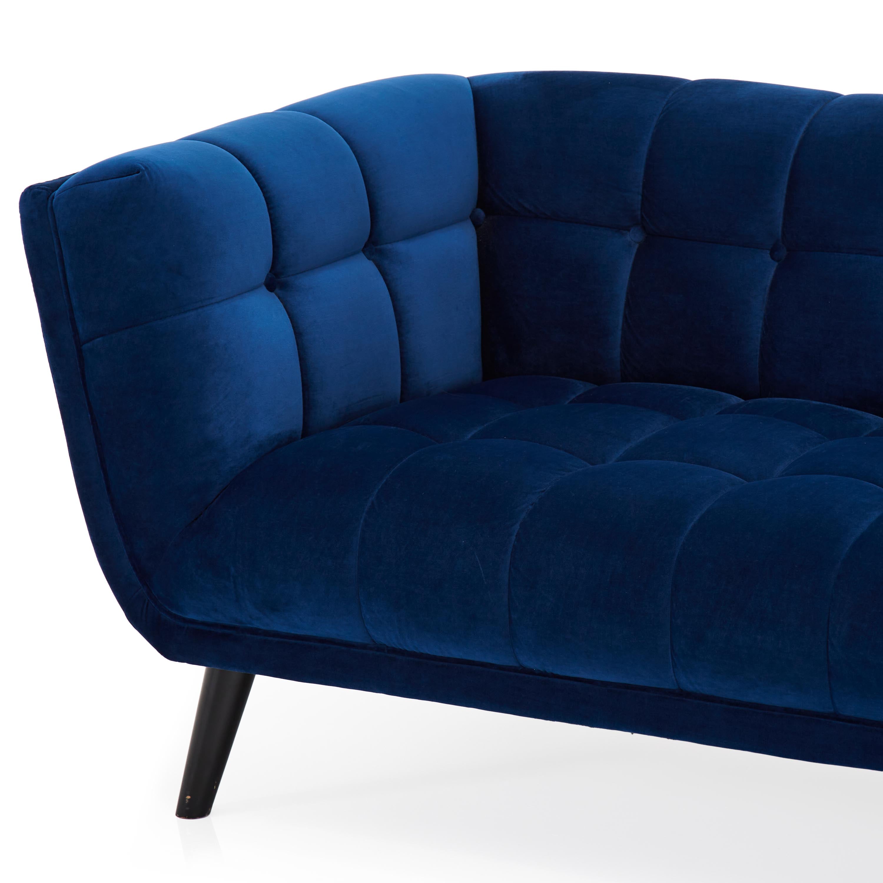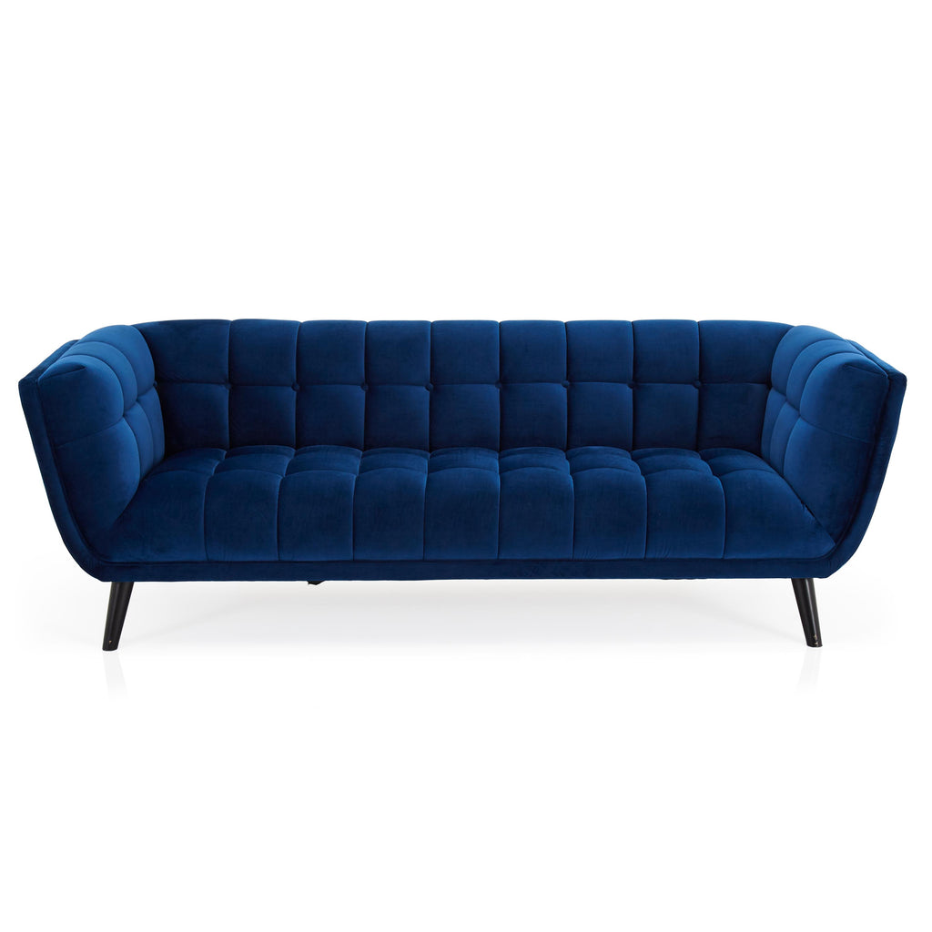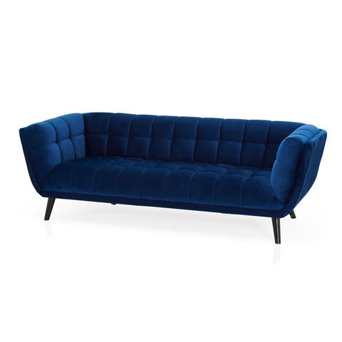Details: Blue velvet tufted sofa with black angled legs Dimensions: 27" H x 84" W x 33" D