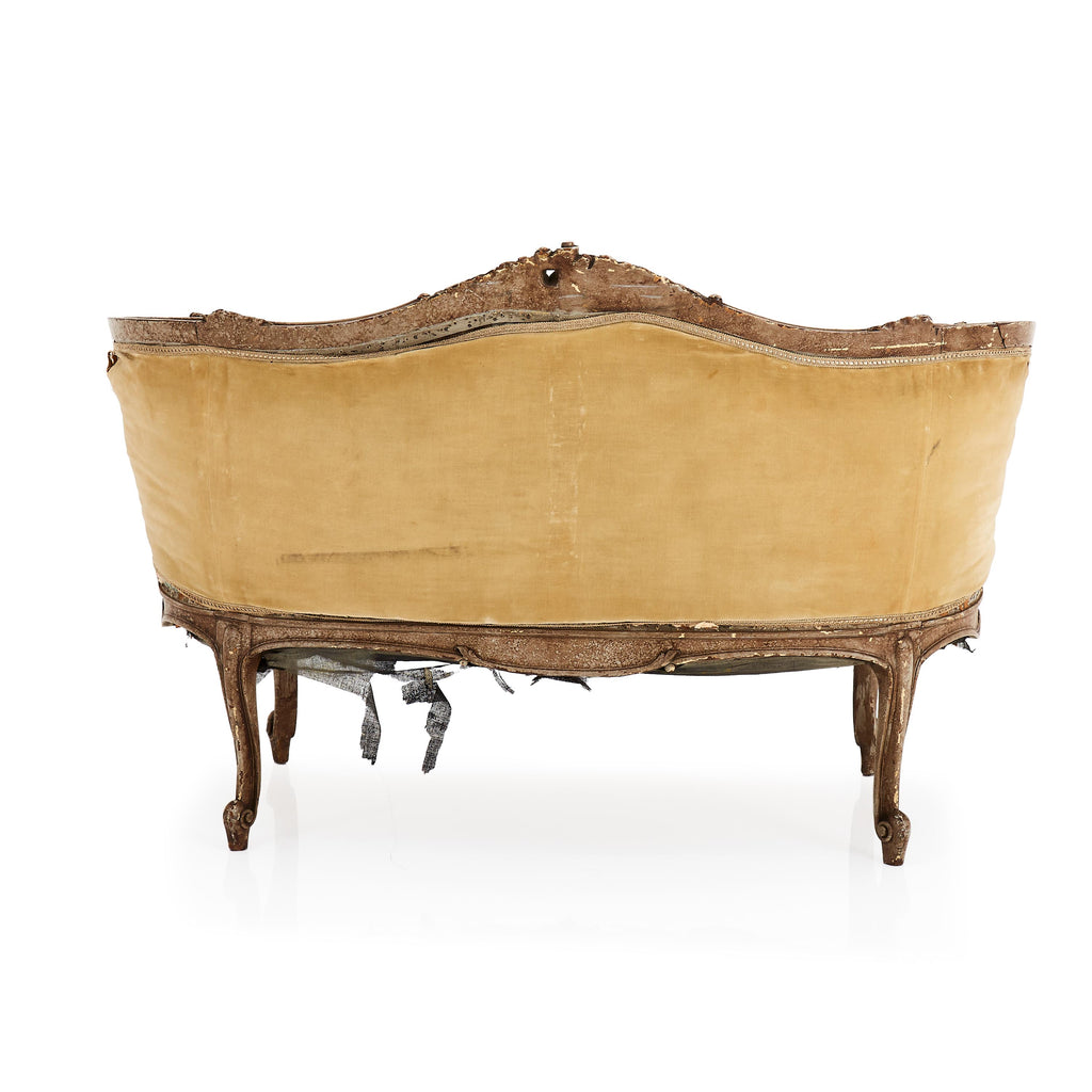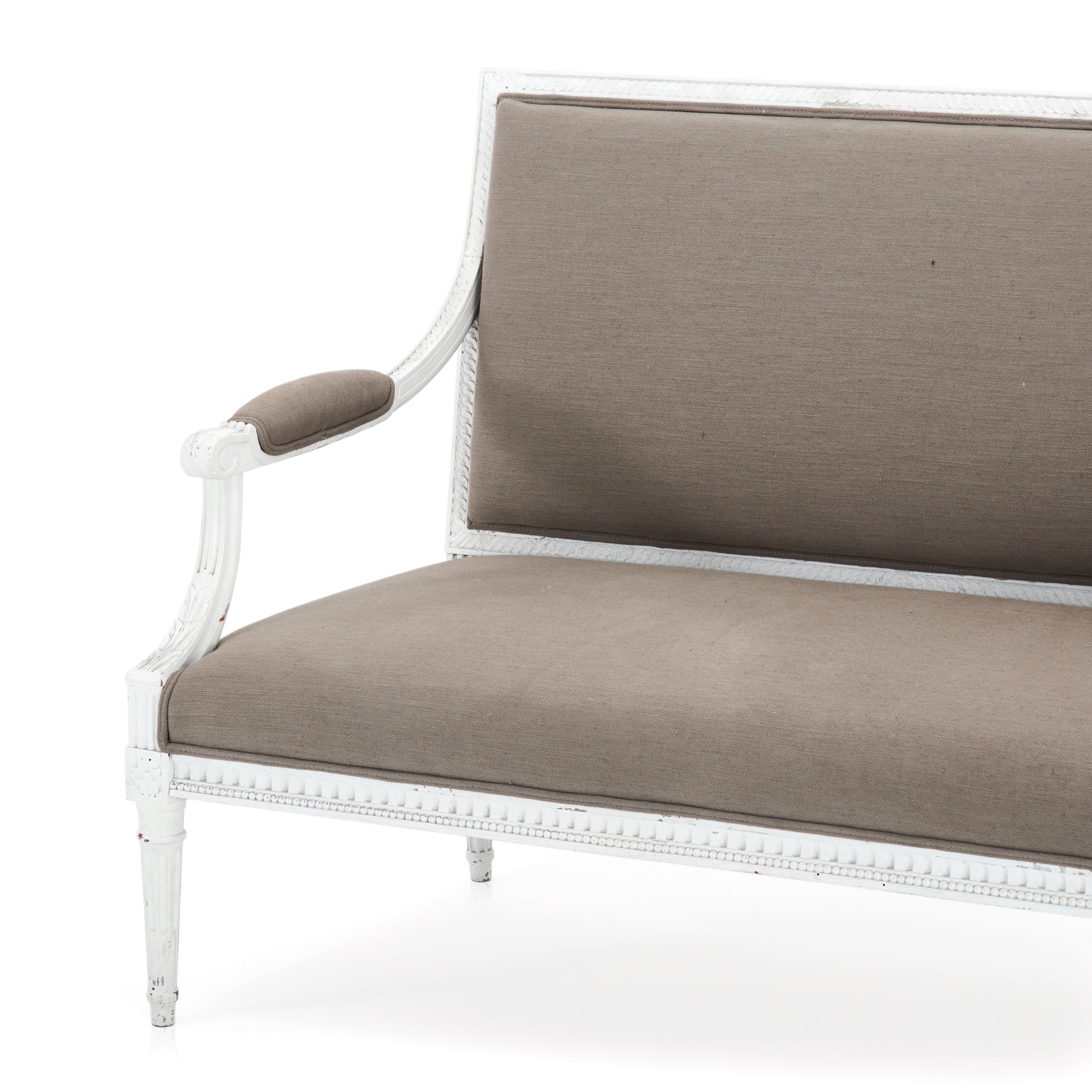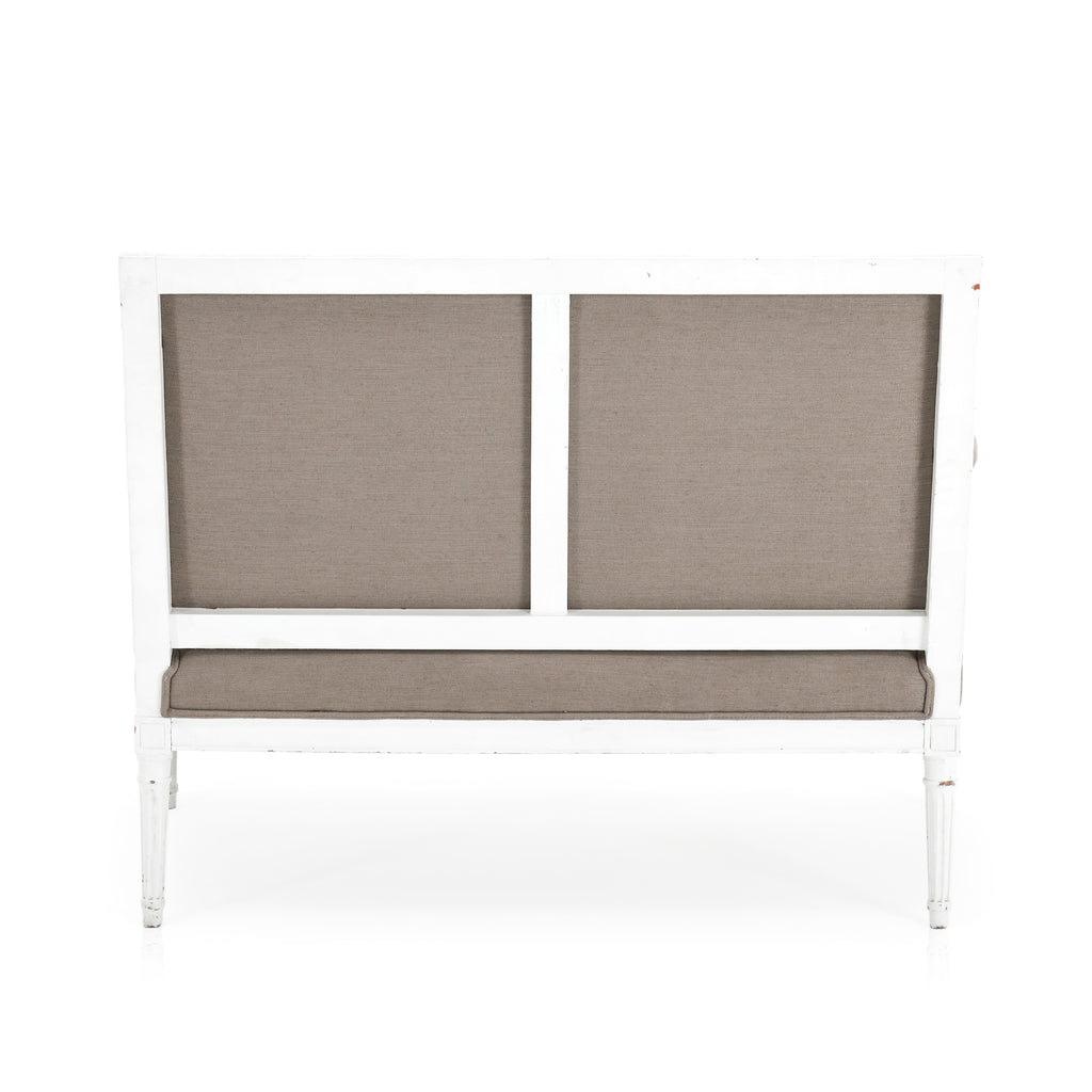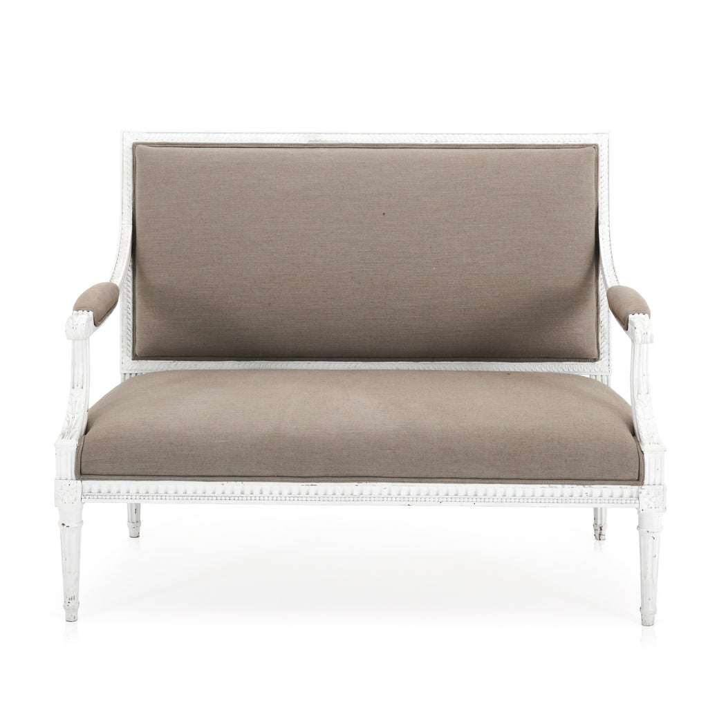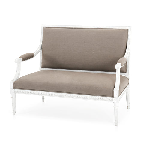 Details: Grey Upholstery, White Wood Arms and Legs settee.Dimensions: 37.5" H x 44.5" W x 25.5" D