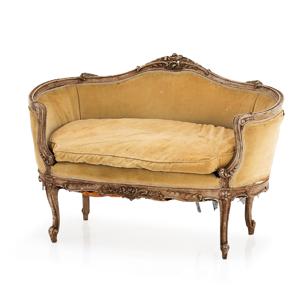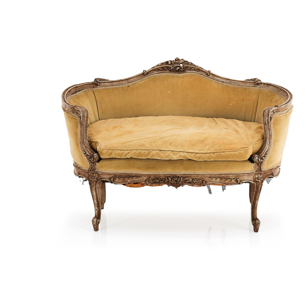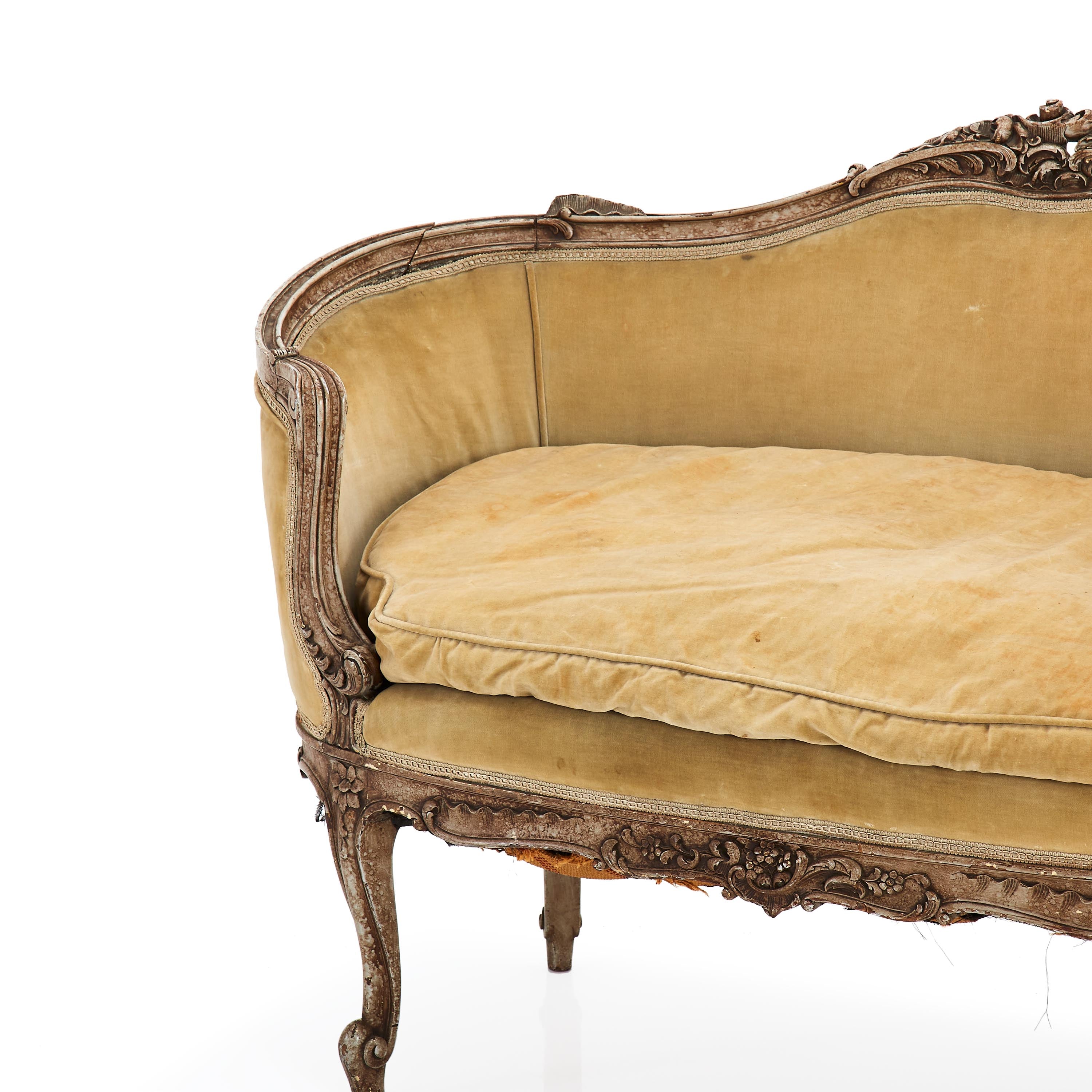 Details: Very small pea green golden mustard velvet victorian settee chair lightly distressed Dimensions: N/A