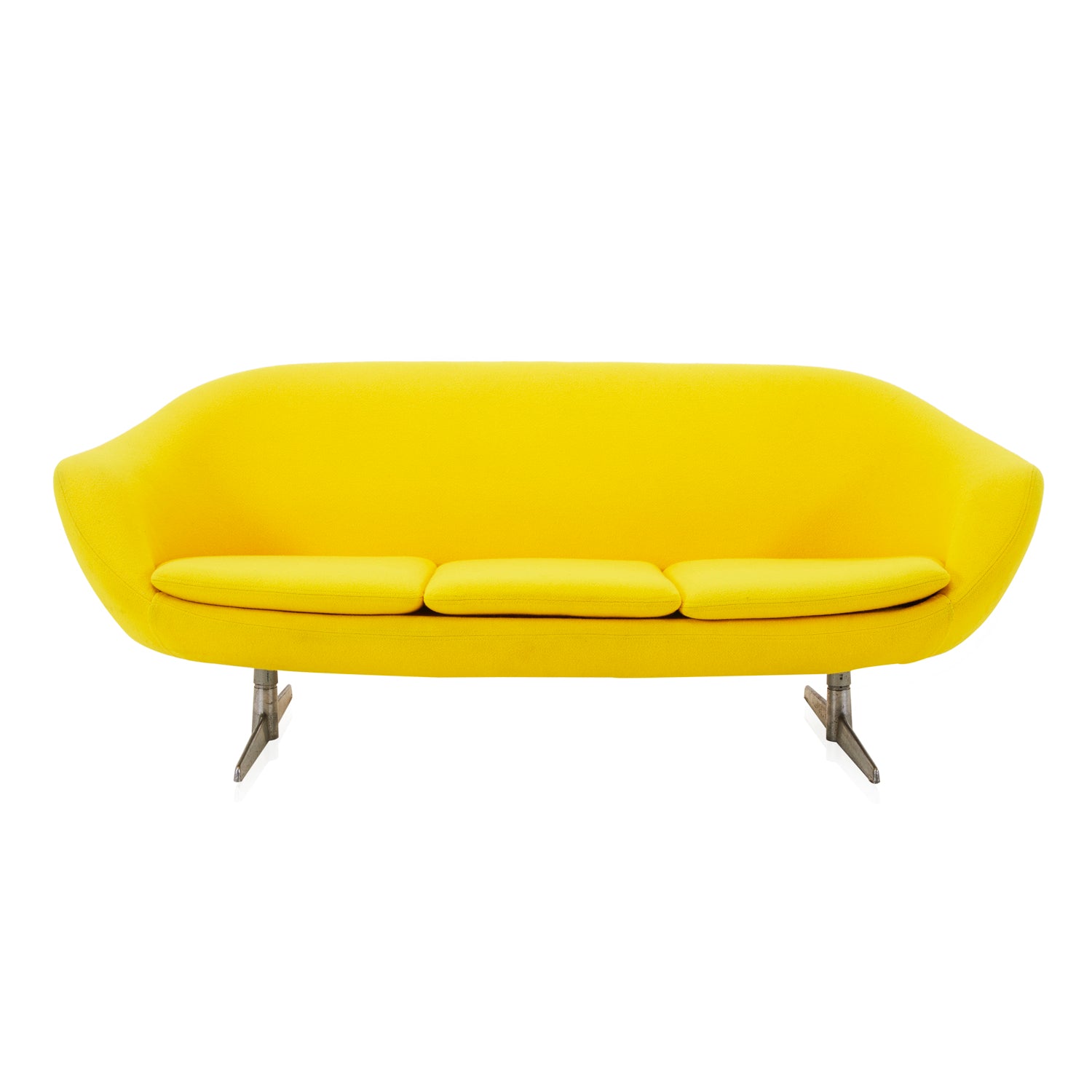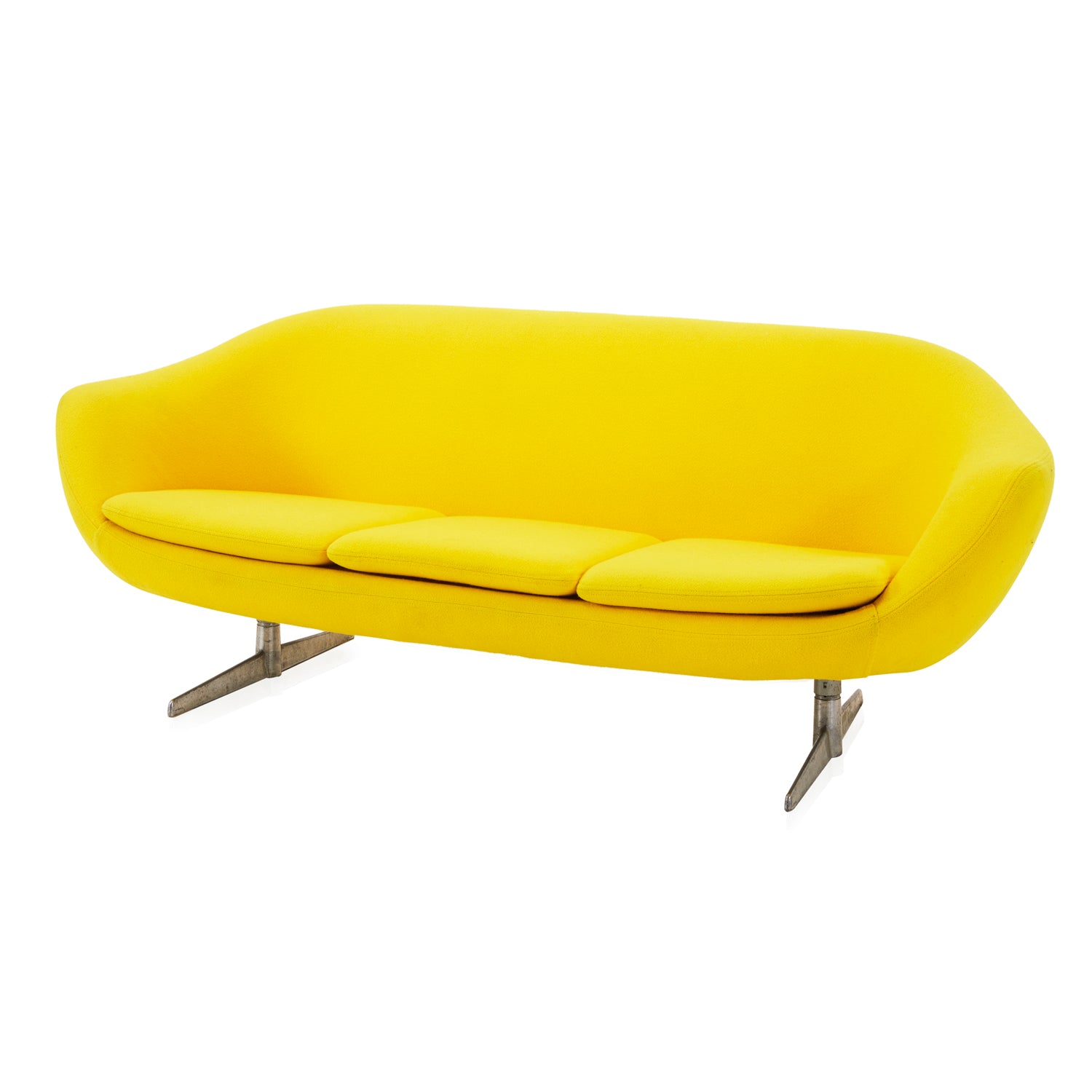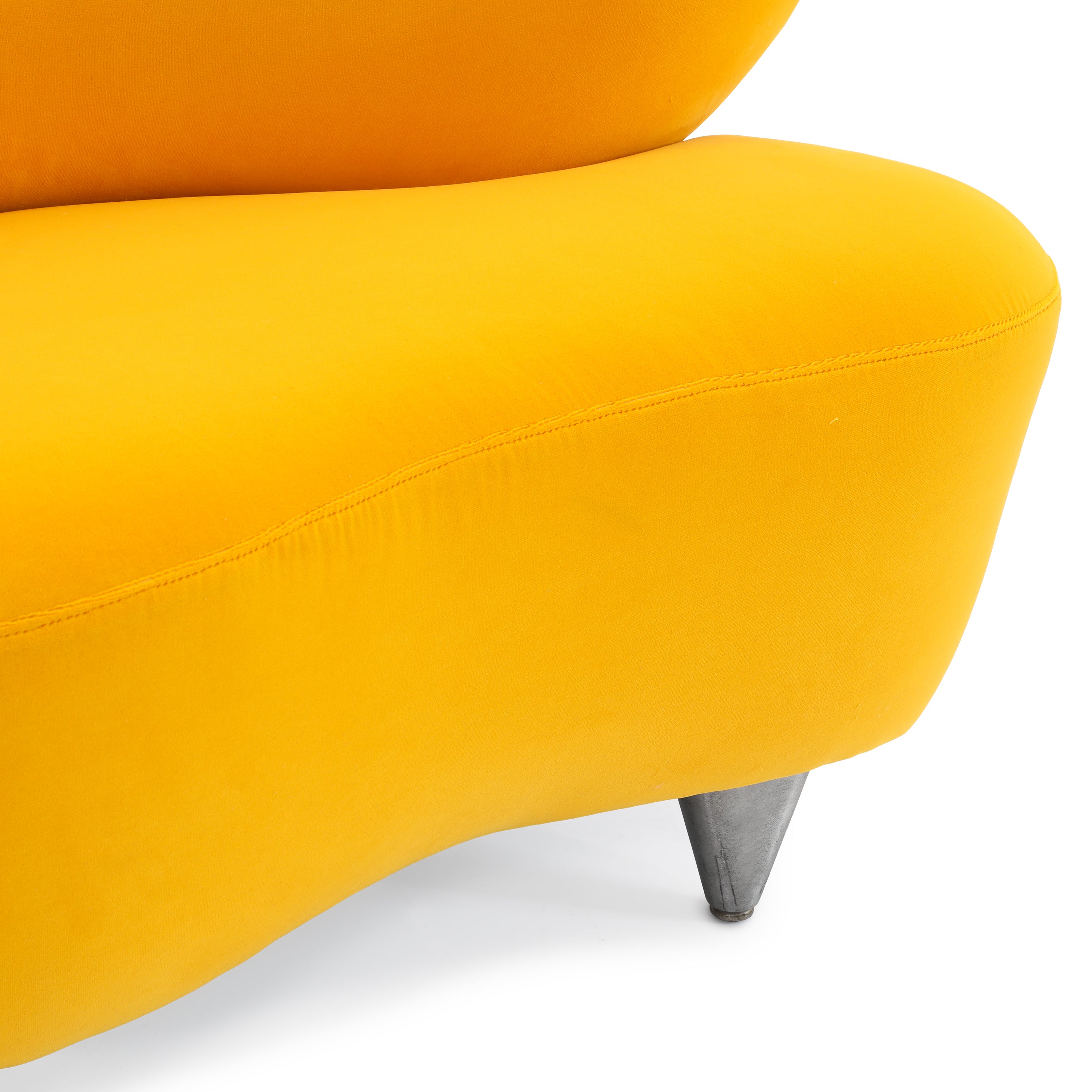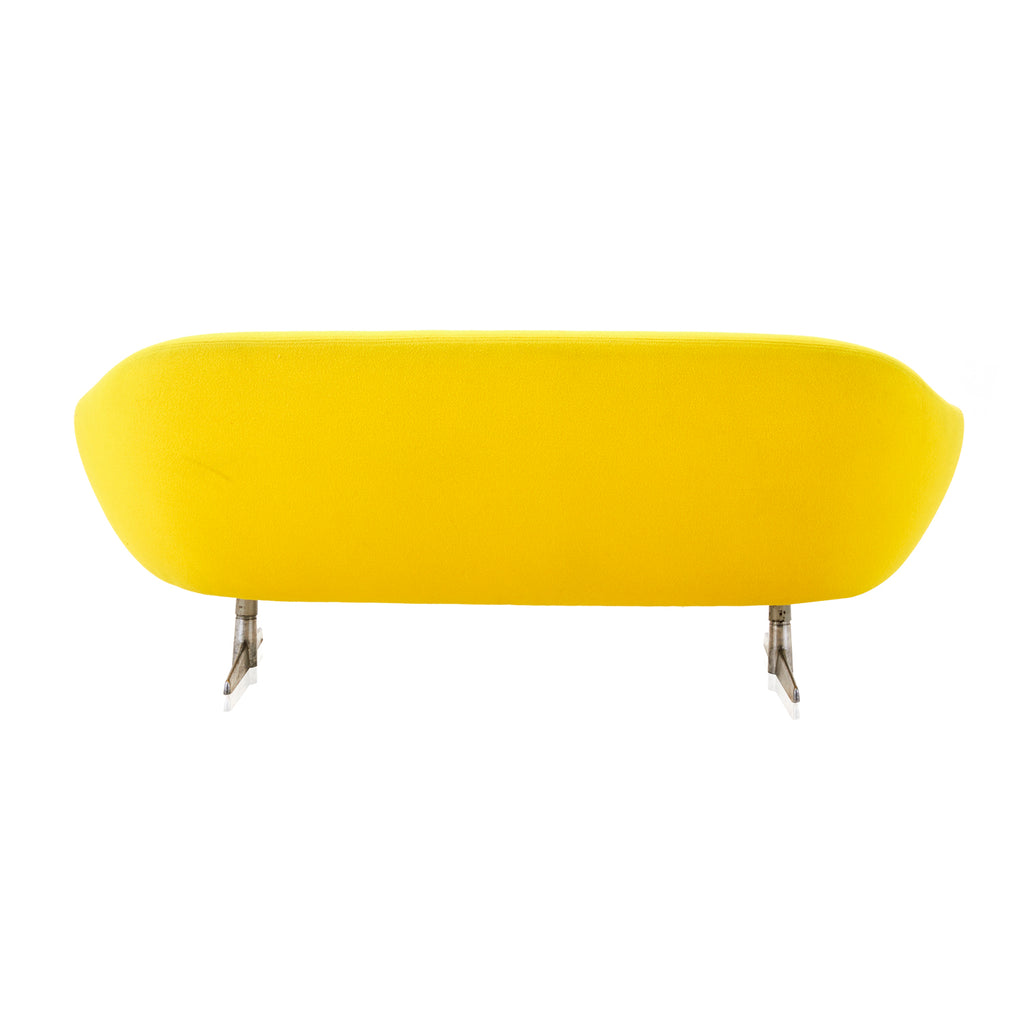 Details: Yellow fabric sofa by Overman with smooth curves and metal feet Dimensions: 26" H x 68" W x 28" D Quantity: 1
