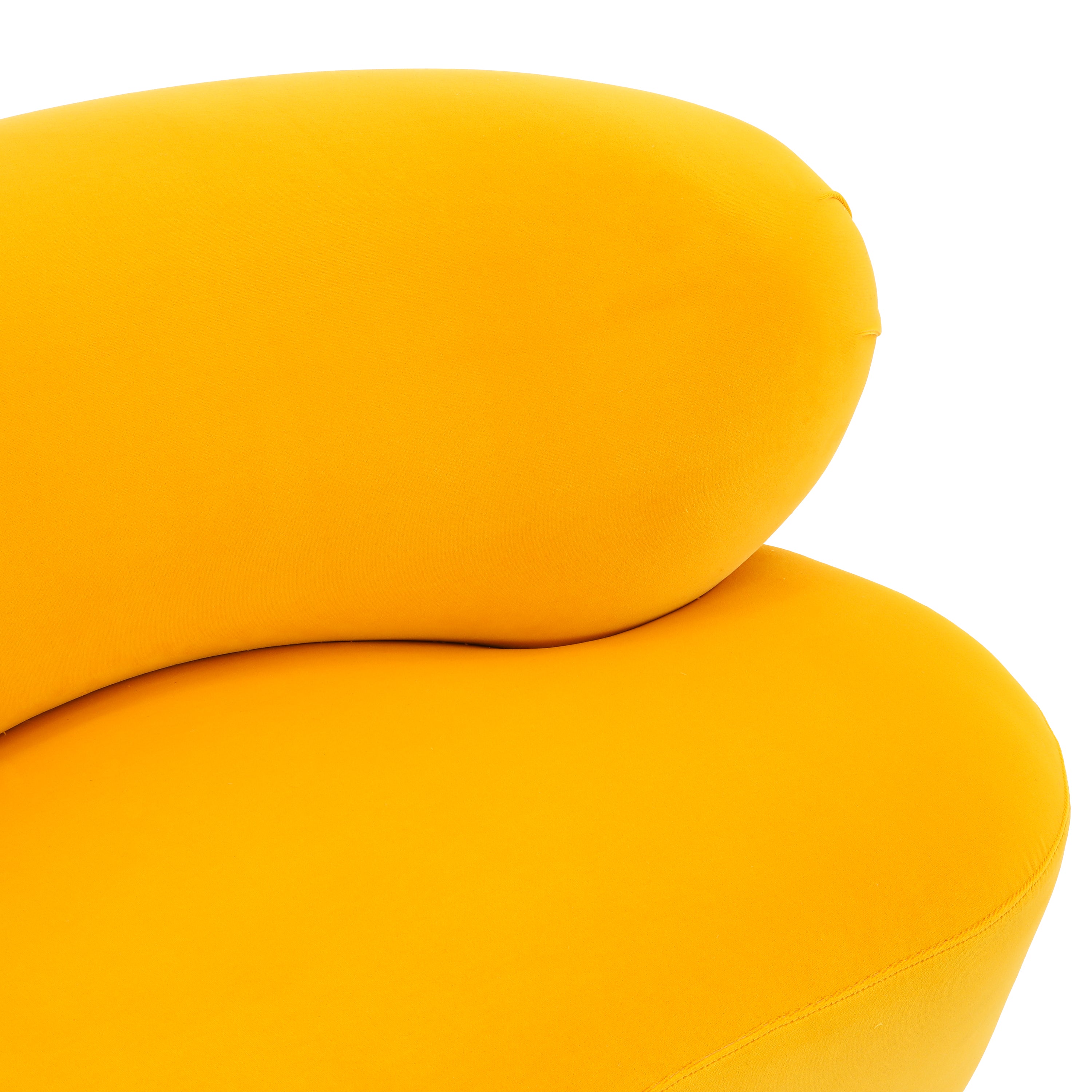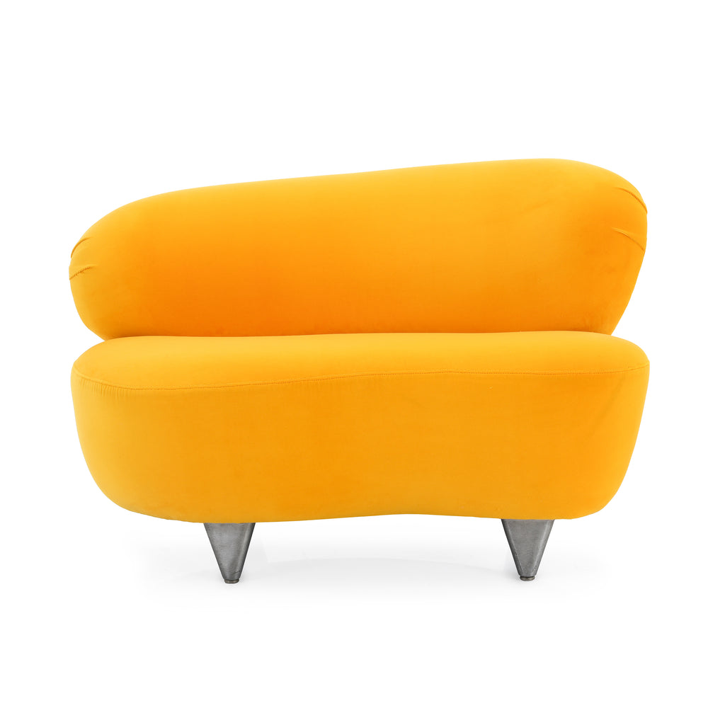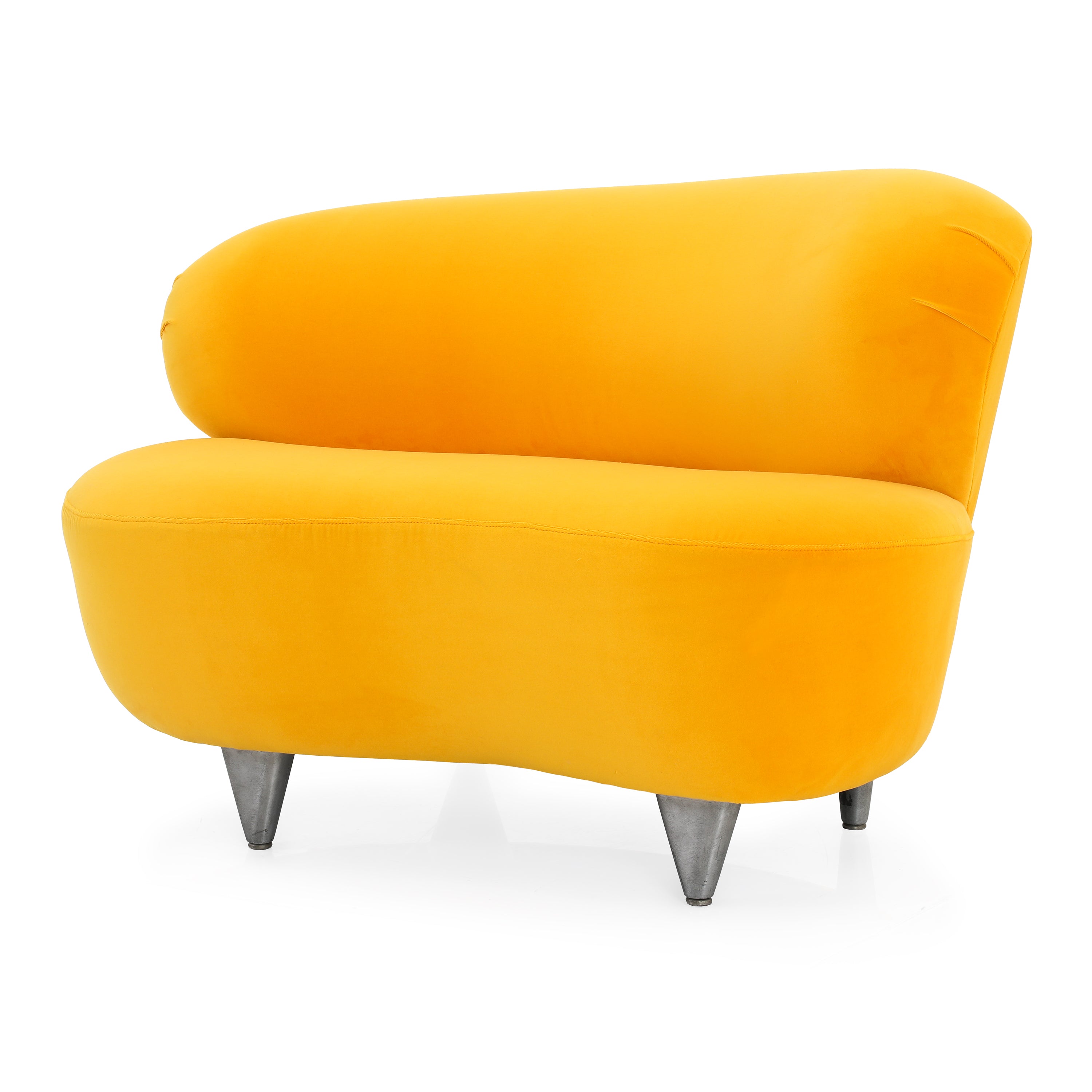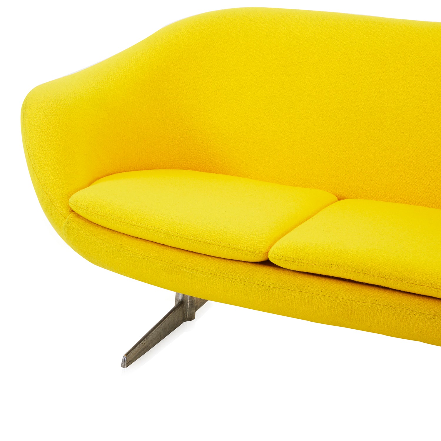 Details: Yellow fabric sofa by Overman with smooth curves and metal feet Dimensions: 26" H x 68" W x 28" D Quantity: 1