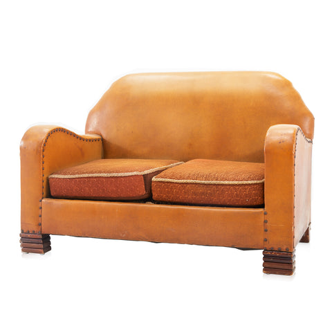 Details: Light brown leather love seat with brown fabric cushions Dimensions: 37" H x 51" W x 30" D Quantity: 1