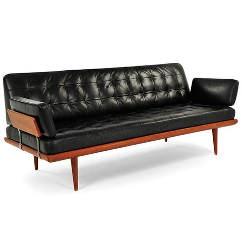 Details: Designed by Peter Hvidt, Classic Danish Modern Teak Sofa, Minerva Sofa / Daybed, Black Leather, Sofa, Couch, Arms, Wood Frame, Metal, Tufted, Buttons, Business,...