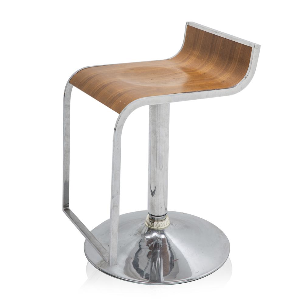 Description: Adjustable stool with metal and plastic base. Stool is constructed of chrome, white plastic, and black leather. Dimensions: 42" H x 18" W...