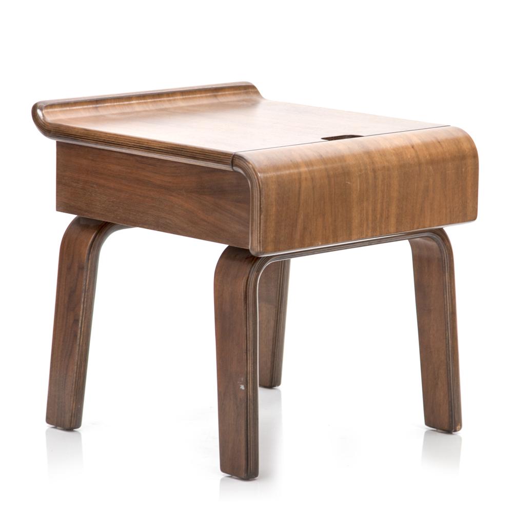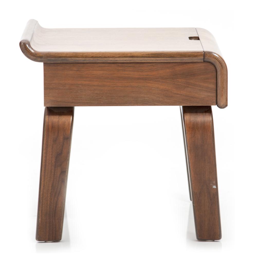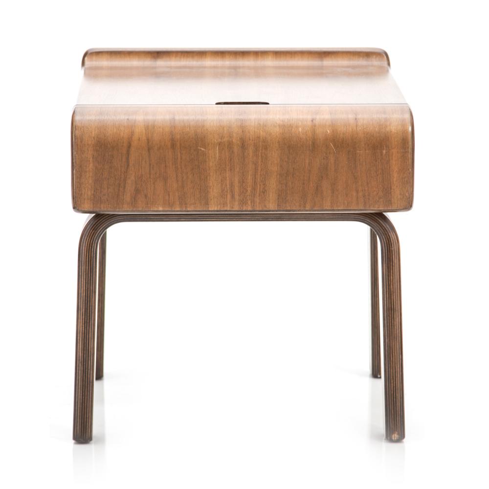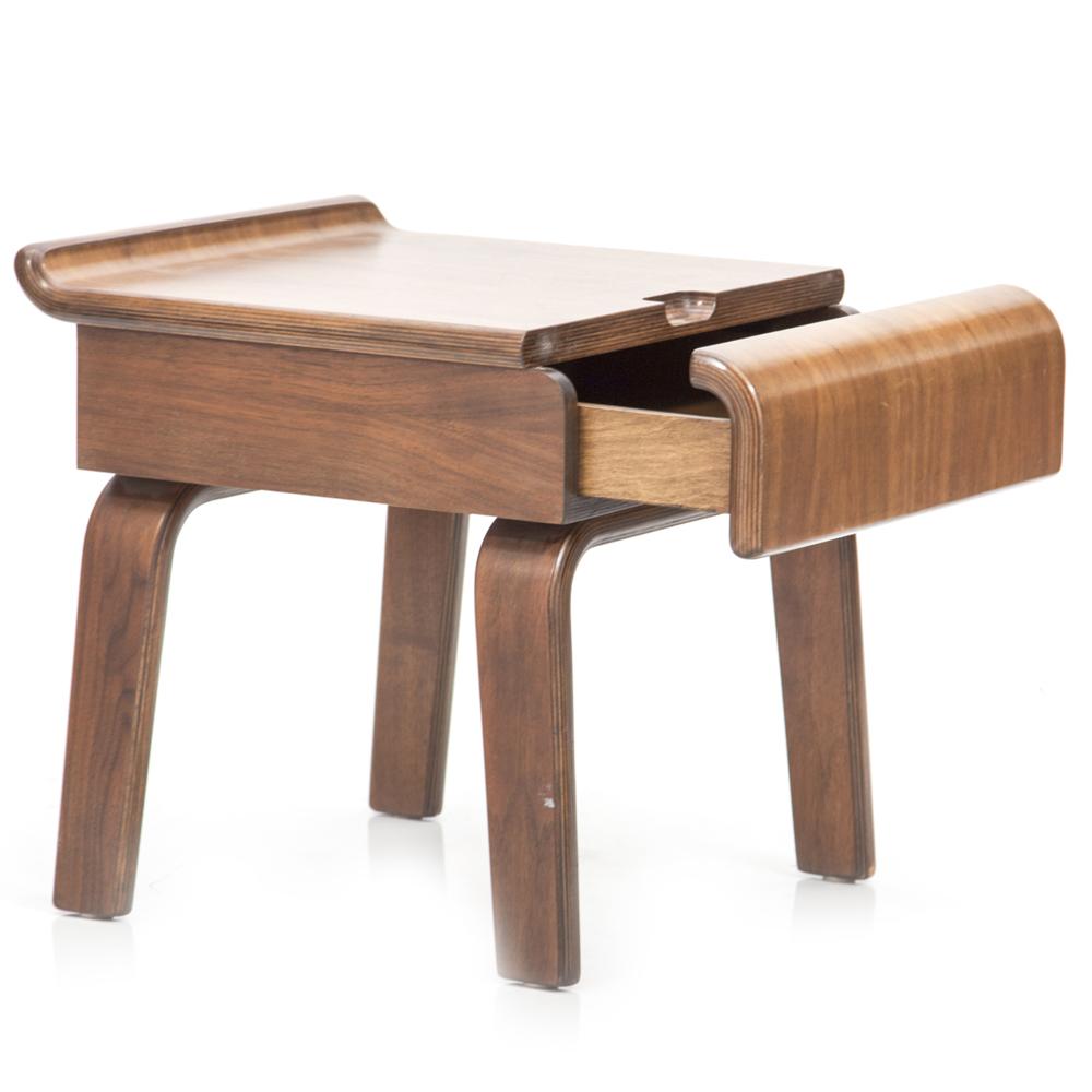 Details: Small walnut side table with curved front single drawer Dimensions: 20" H x 19" W x 21" D Quantity: 2