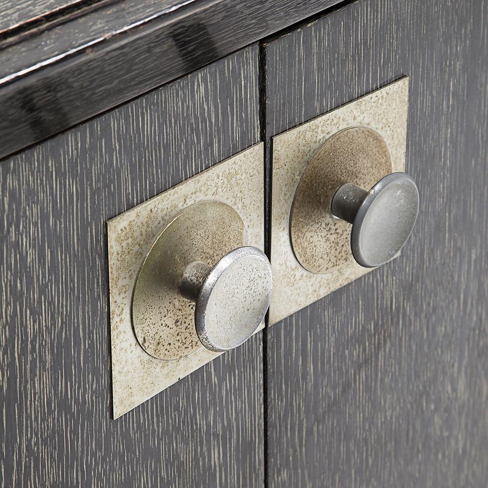 Details: Large gray veneer bedside table with two cabinet doors with brass knobs