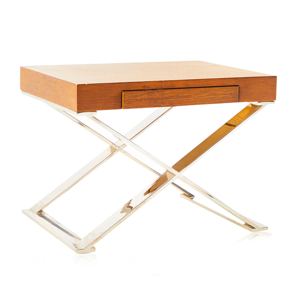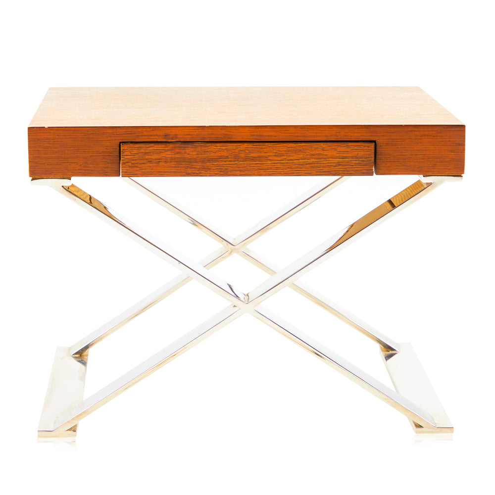 Details: Contemporary wood bedside table with metal X legs and small drawer Dimensions: 16" H x 21" W x 15" D Quantity: 1