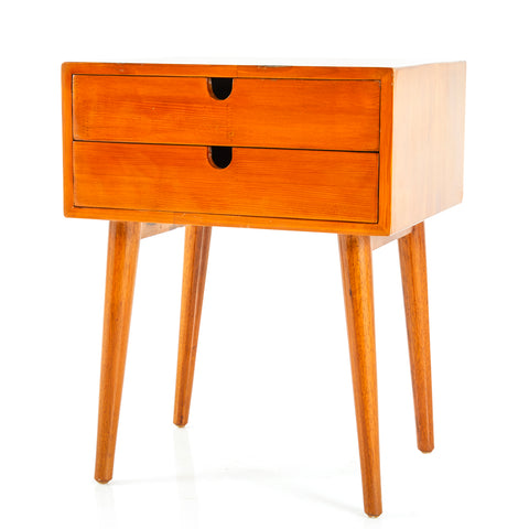Details: Two-drawer wood bedside table with angled wood legs, small black knobs base Dimensions: 26.5" H x 18" W x 15" D Quantity: 2