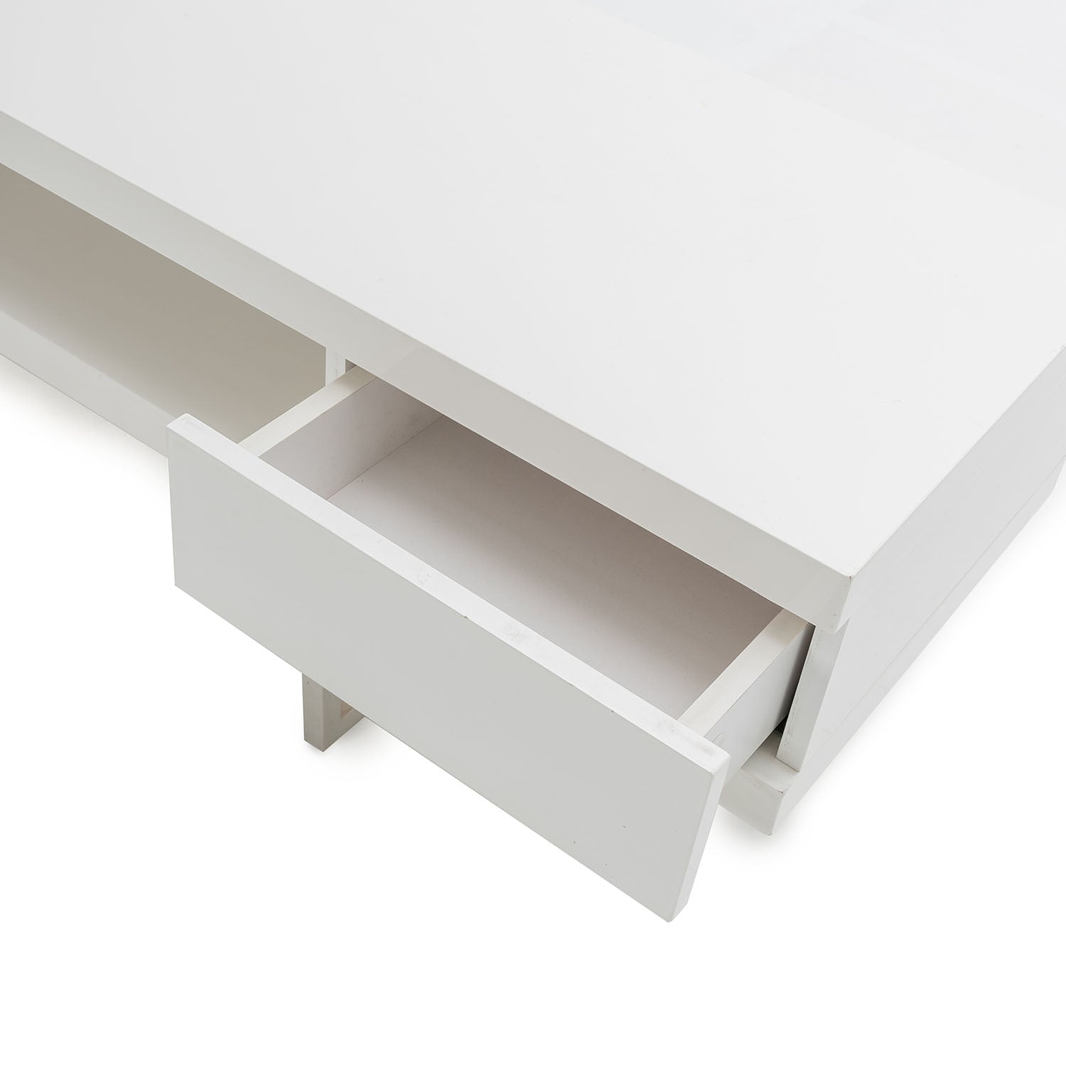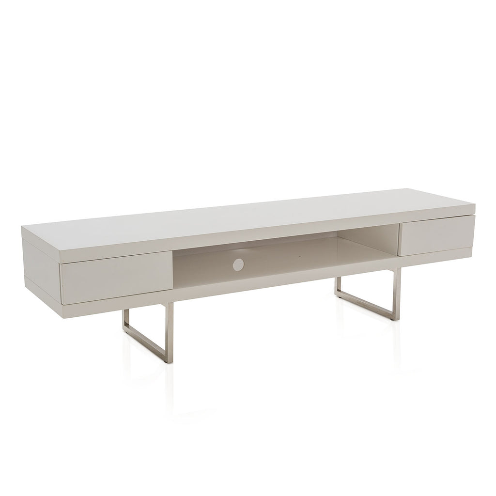 Details: Contemporary white media console with cutout center, 2 side drawers and chrome frame