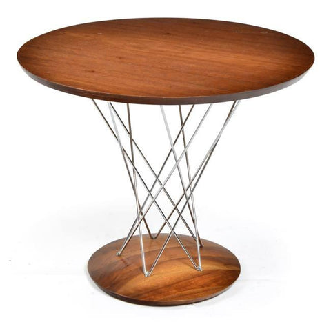Details: Walnut cyclone side table with wood base and chrome legs Dimensions: 20" H x 24" W x 24" D