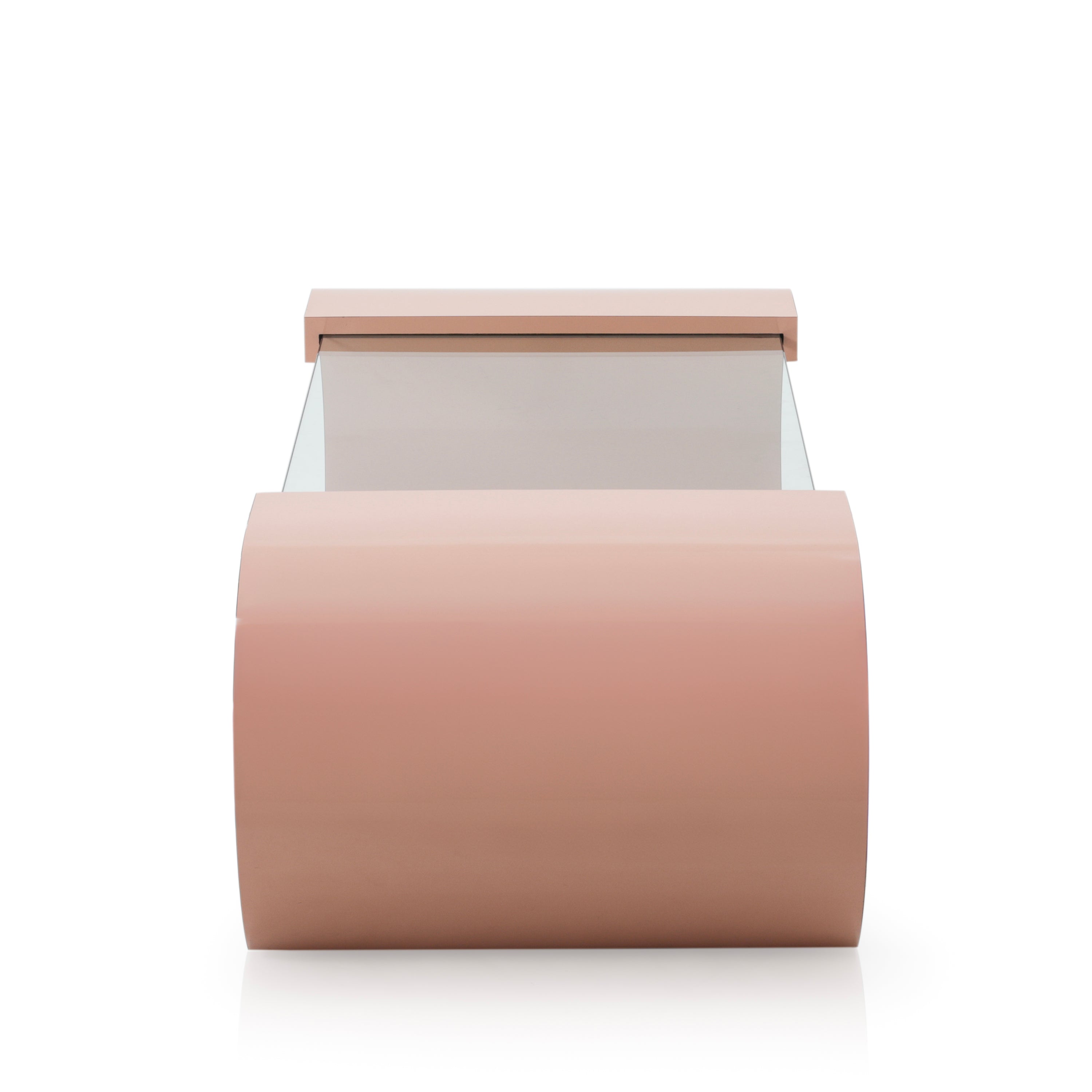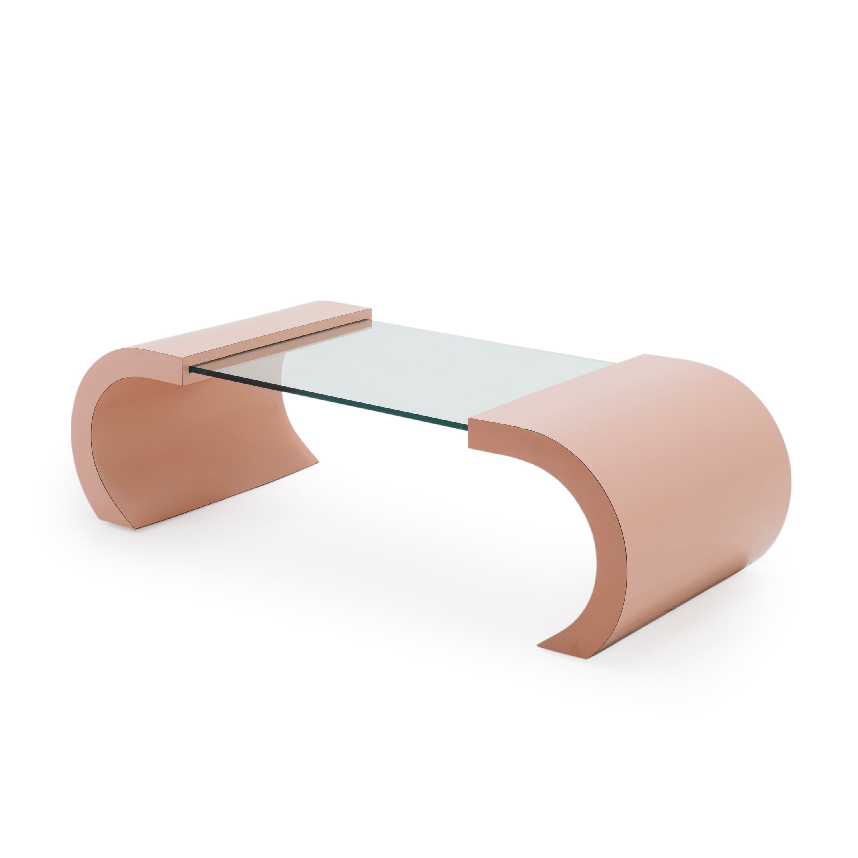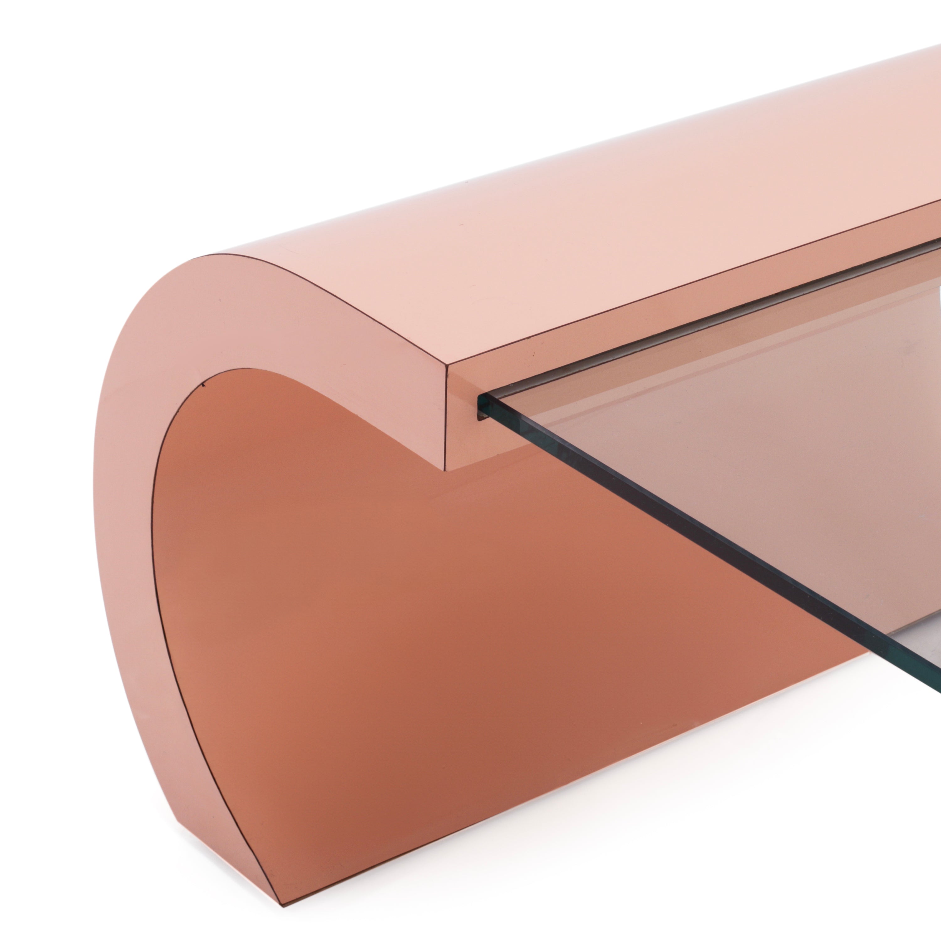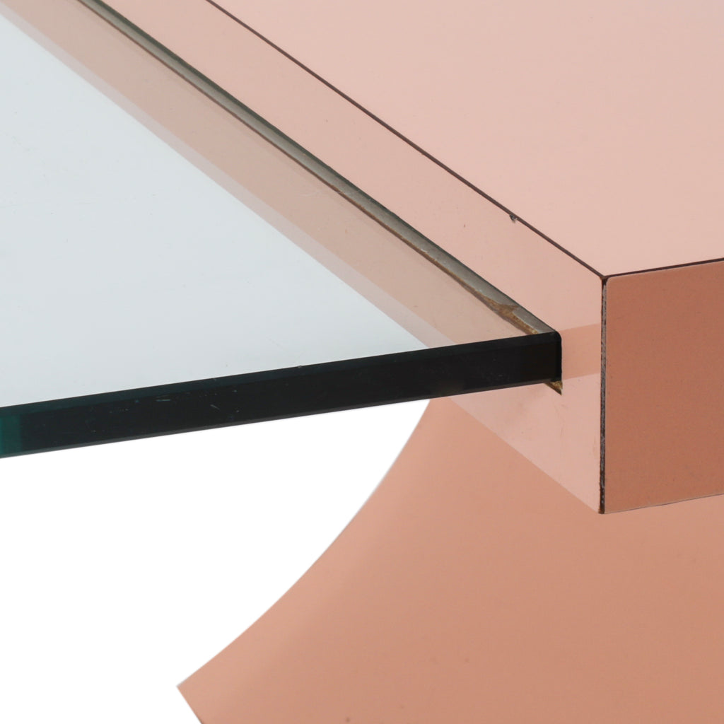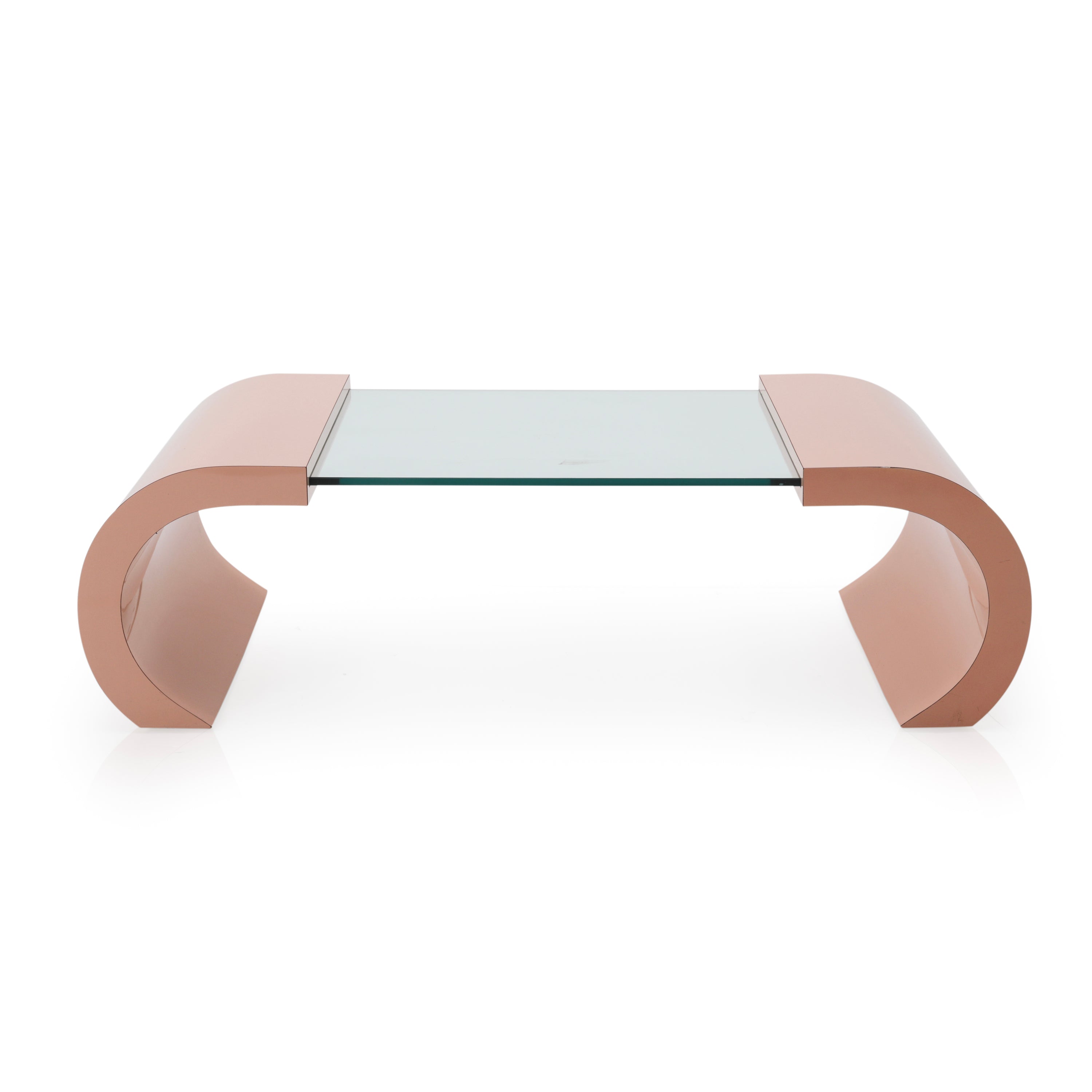 Details: Peach / blush art deco coffee table with glass top. Dimensions: 16.5" H x 54" W x 24" D
