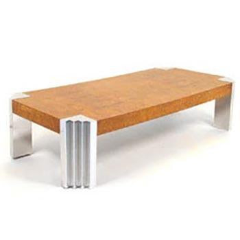 Details: Burlwood top coffee table with chrome stepped legs Dimensions: 14.25" H x 58" W x 28" L