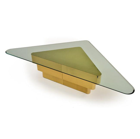 Details: Brass triangle coffee table with thick triangle glass top Dimensions: 15" H x 67" W x 37" D
