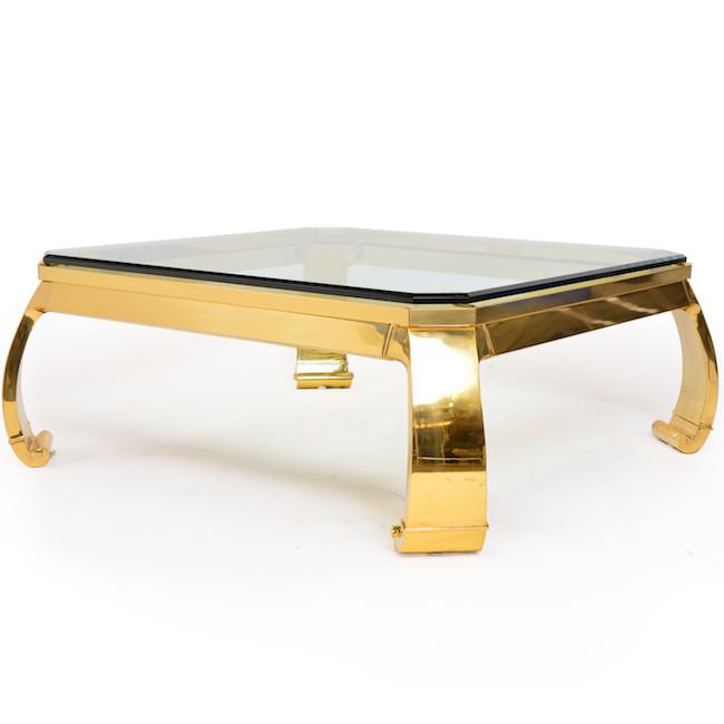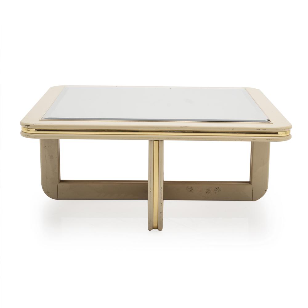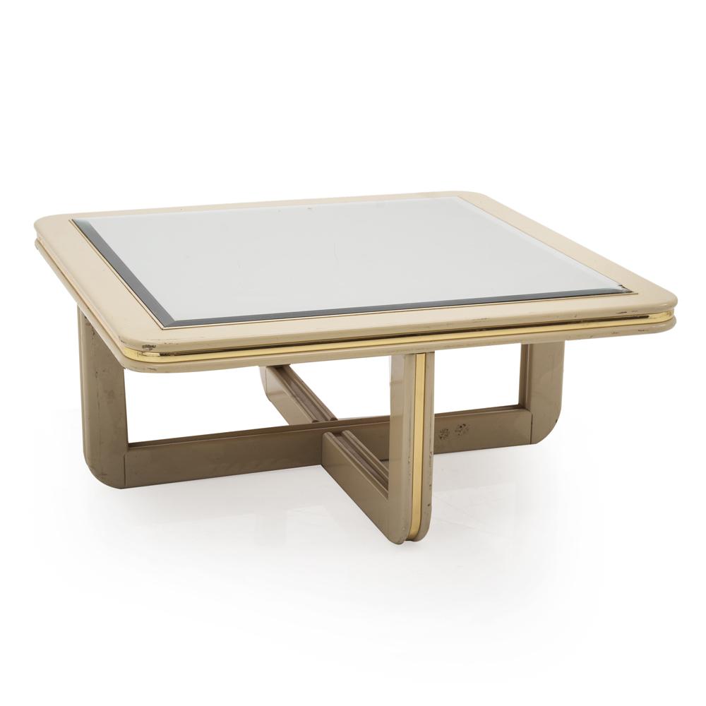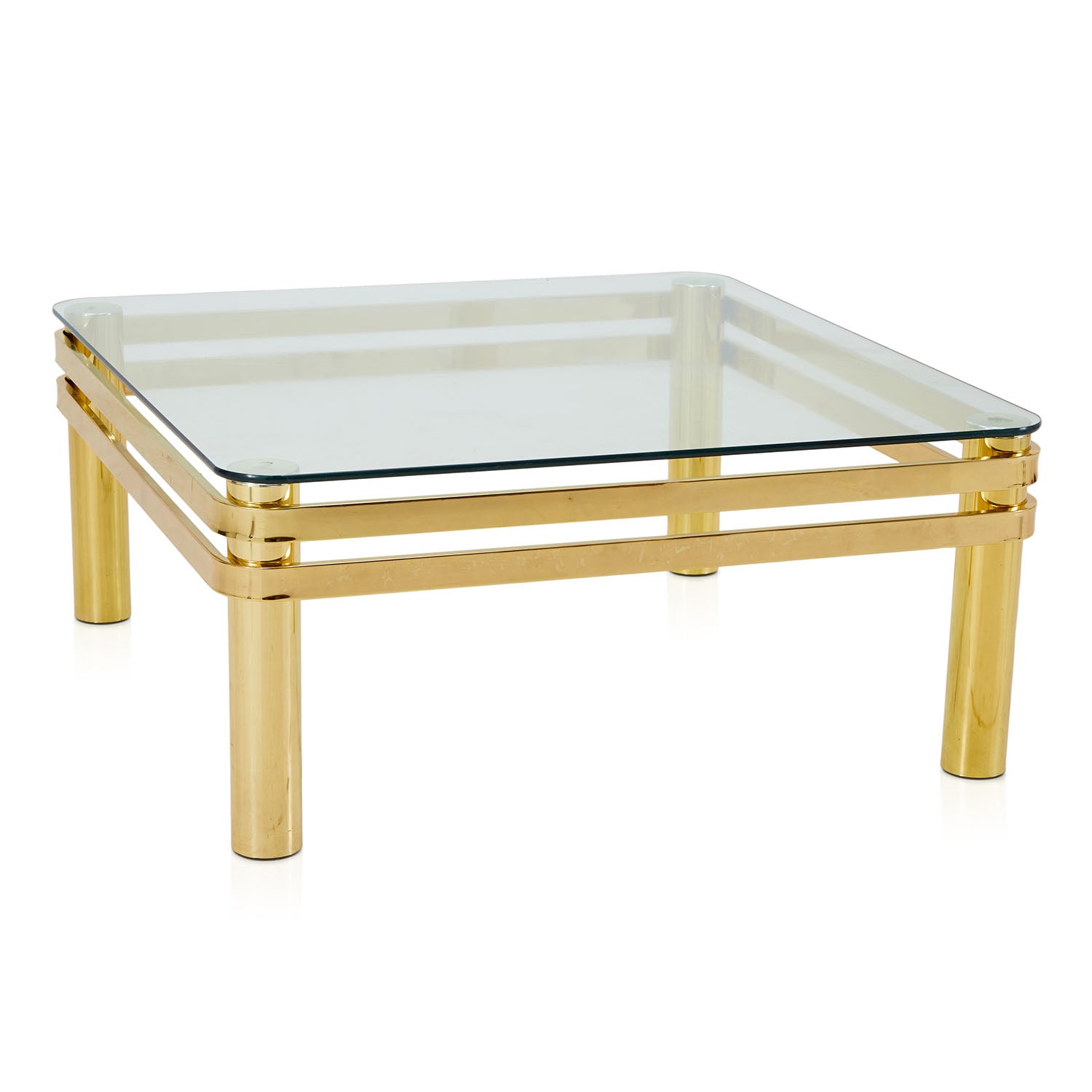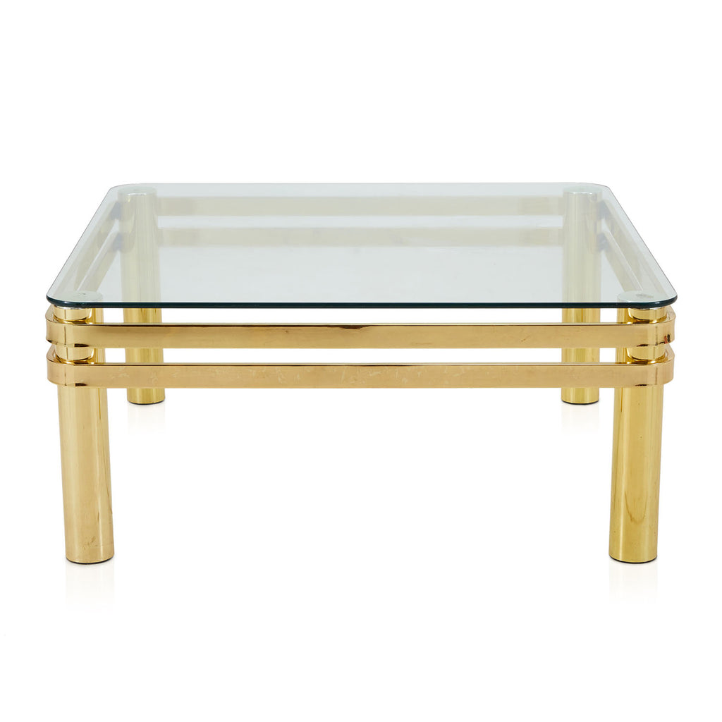 Details: Thick gold frame coffee table with square beveled glass top Dimensions: 15" H x 36" L x 36" W
