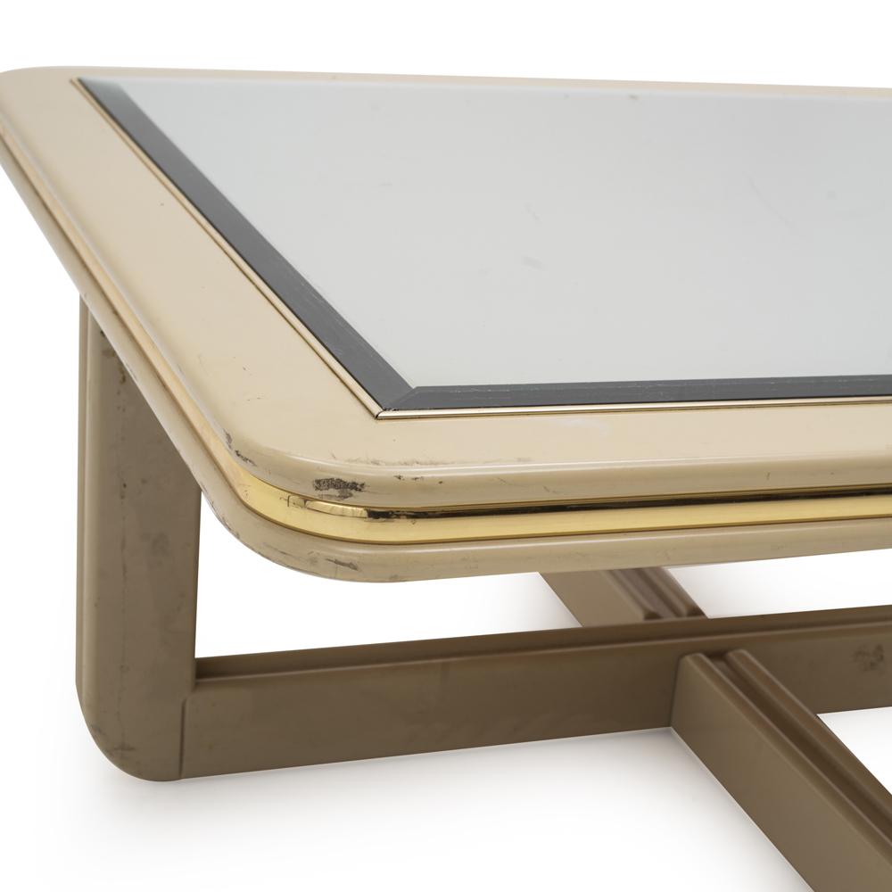 Details: Square coffee table with glass mirror top and beige wood base in a plus bottom design and gold detail Dimensions: 16" H x 38" W...