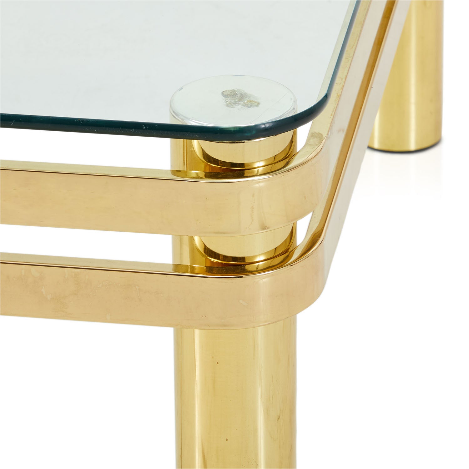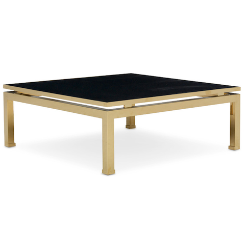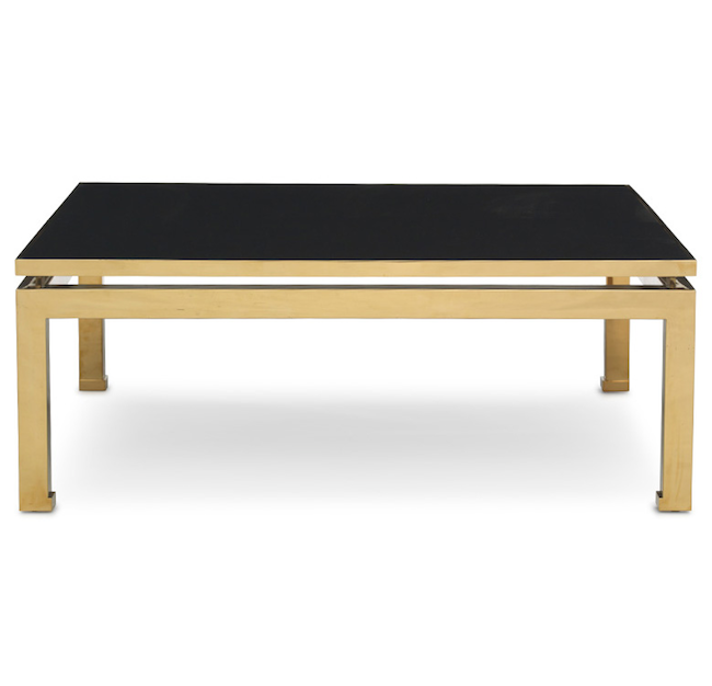 Details: Laurent square table with black glass top and polished brass frame Dimensions: 15" H x 40" W x 40" D