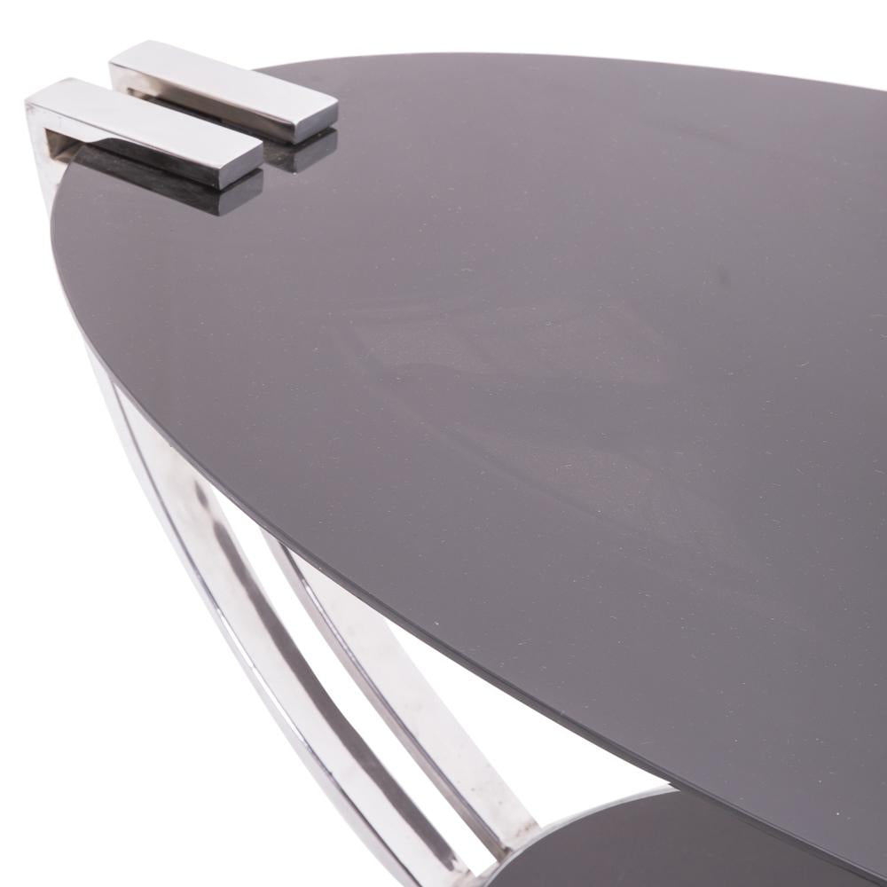 Details: Oval black glass top with chrome legs Dimensions: 15.5" H x 50" W x 24" D