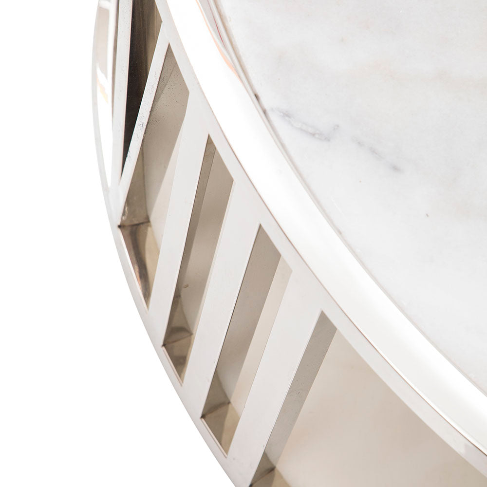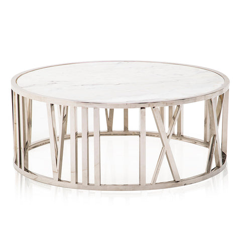 Details: Circular white marble top coffee table with roman numeral symbol chrome base Dimensions: 16" H x 41.5" W x 45" D