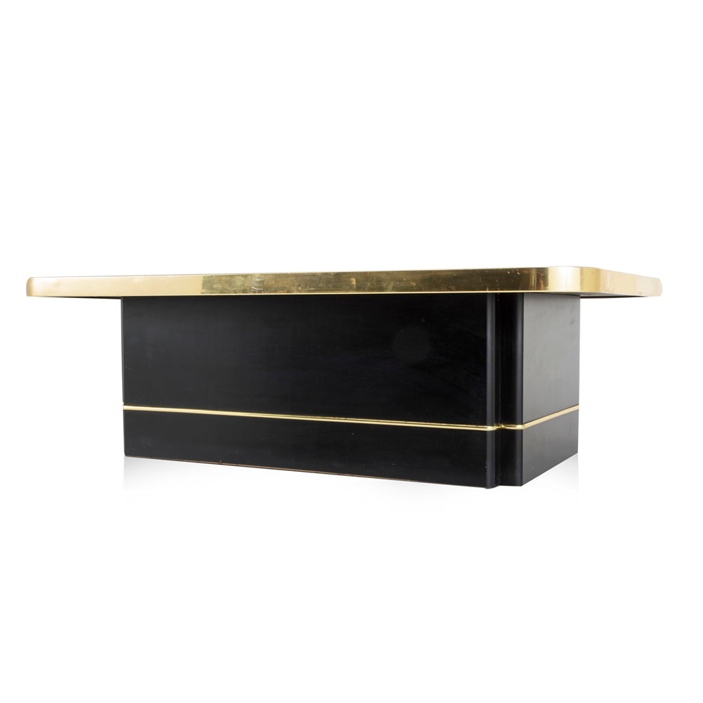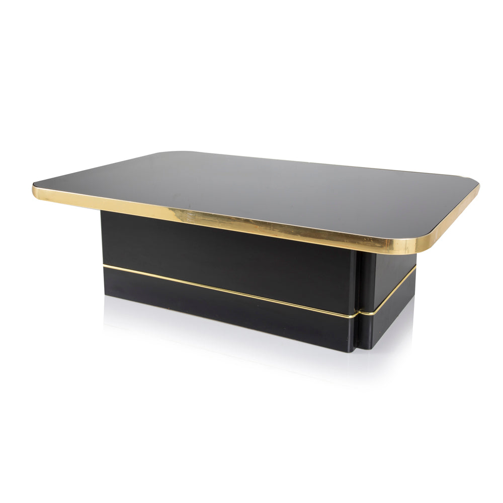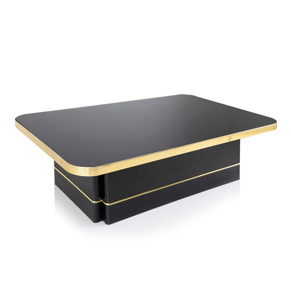 Details: Black glossy lacquer 80's/deco coffee table with gold metal trim Dimensions: 15" H x 48" W x 30" D